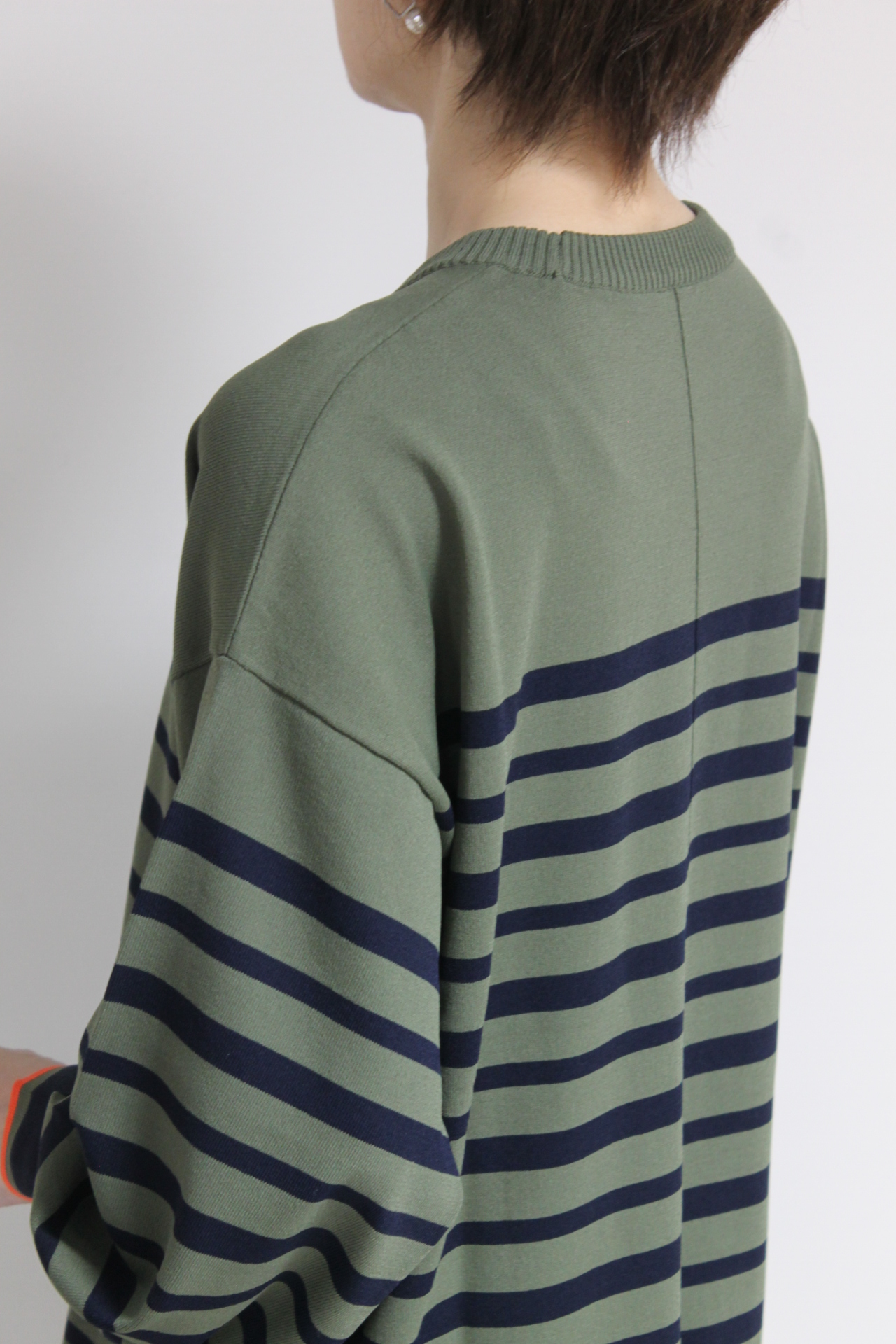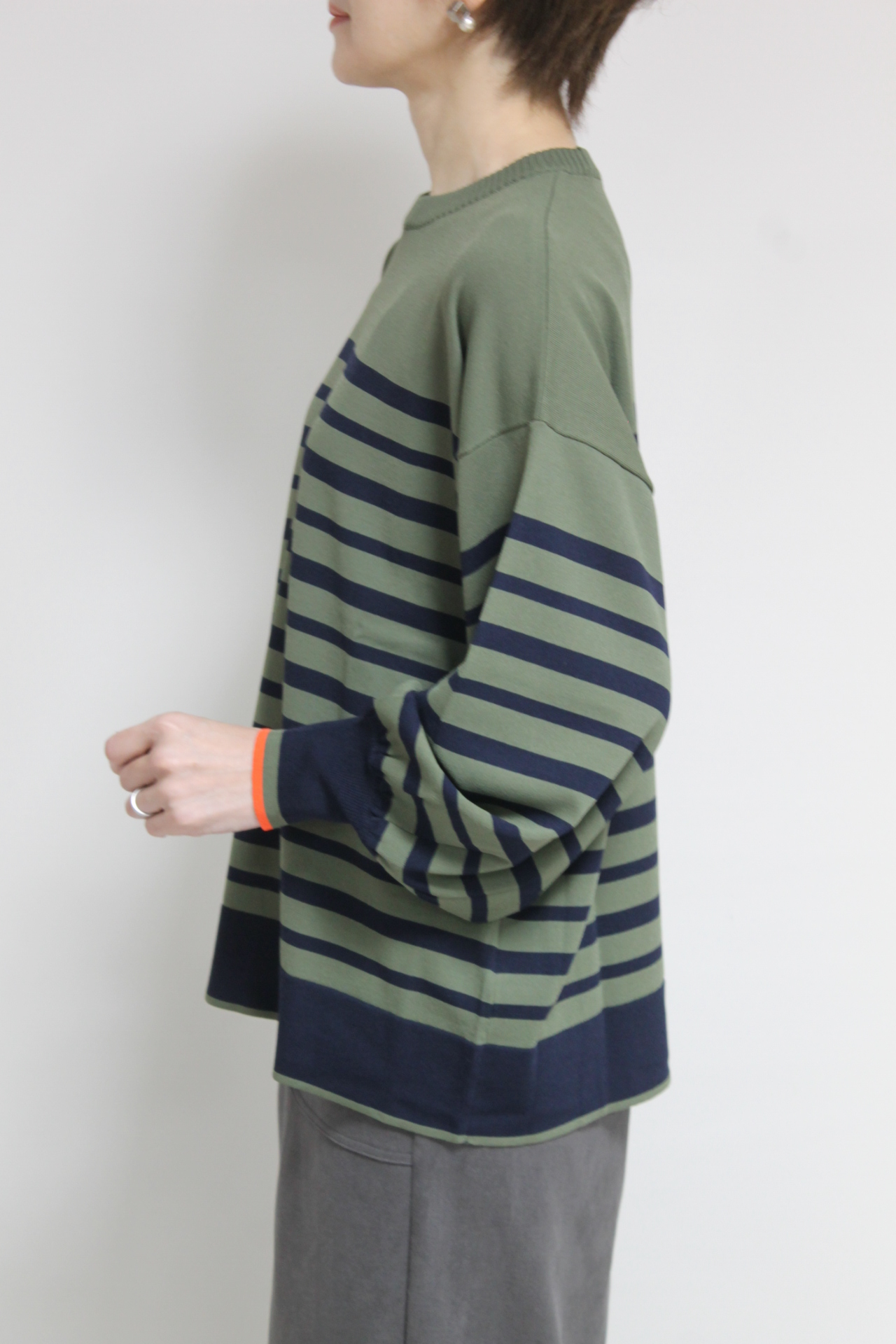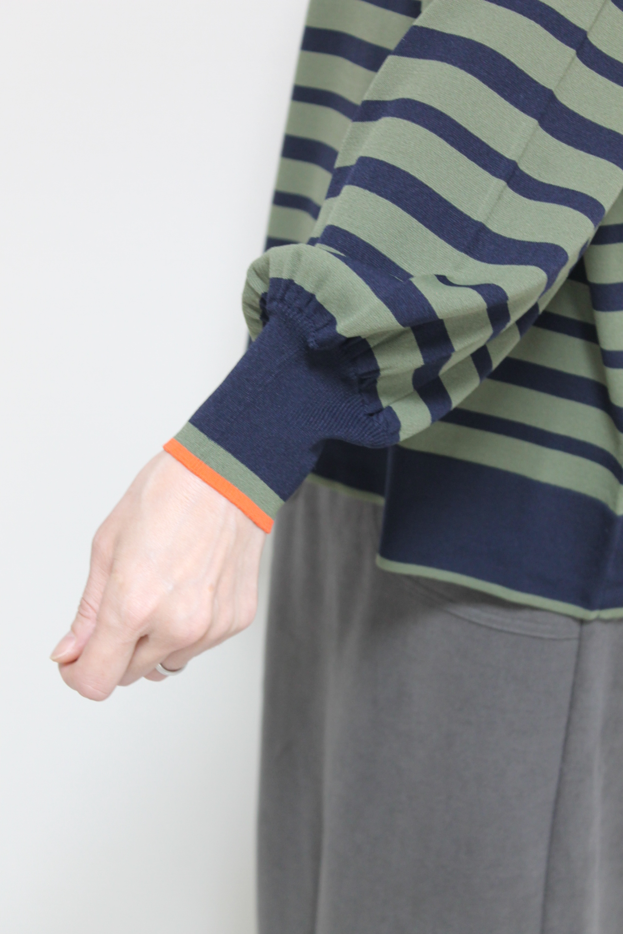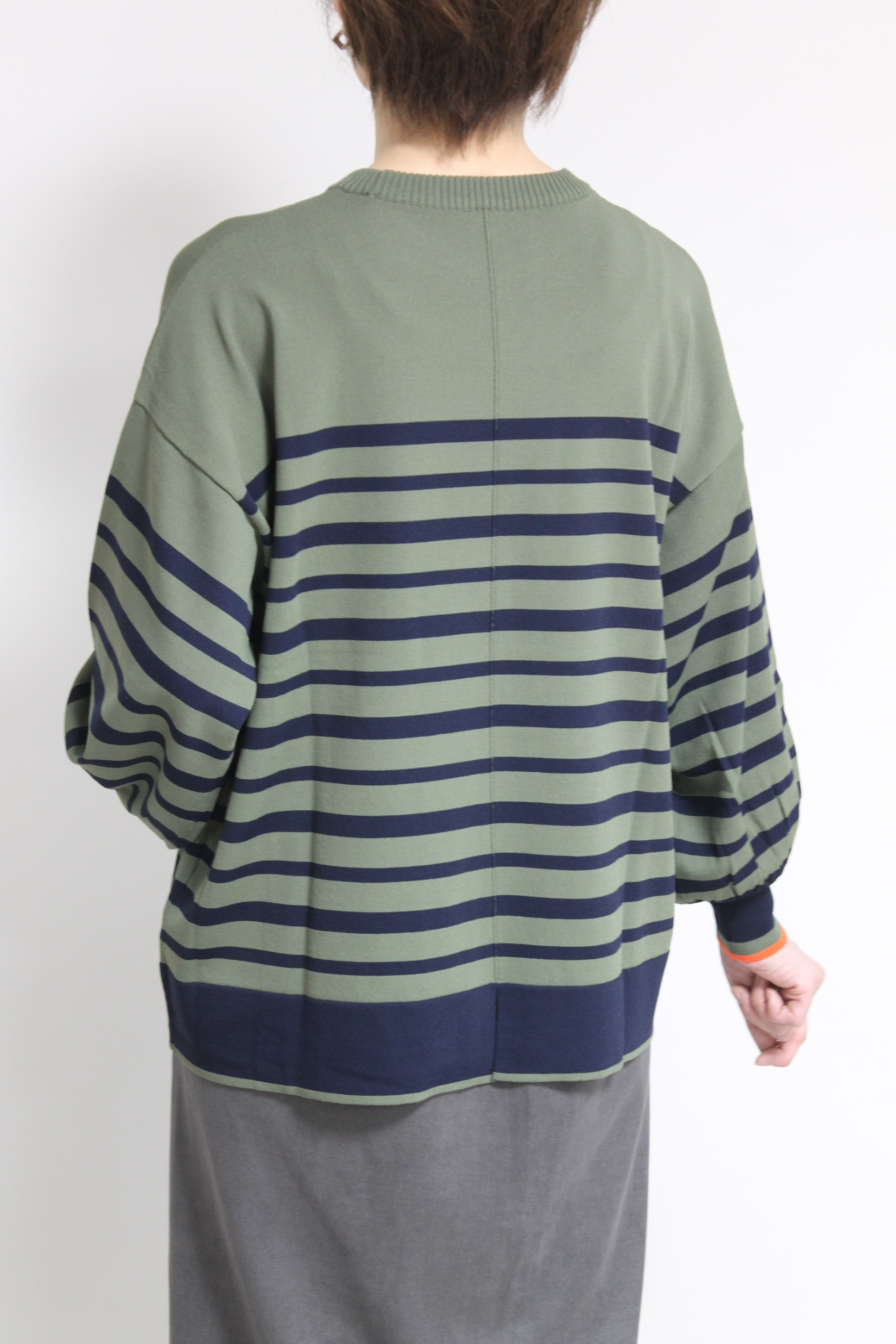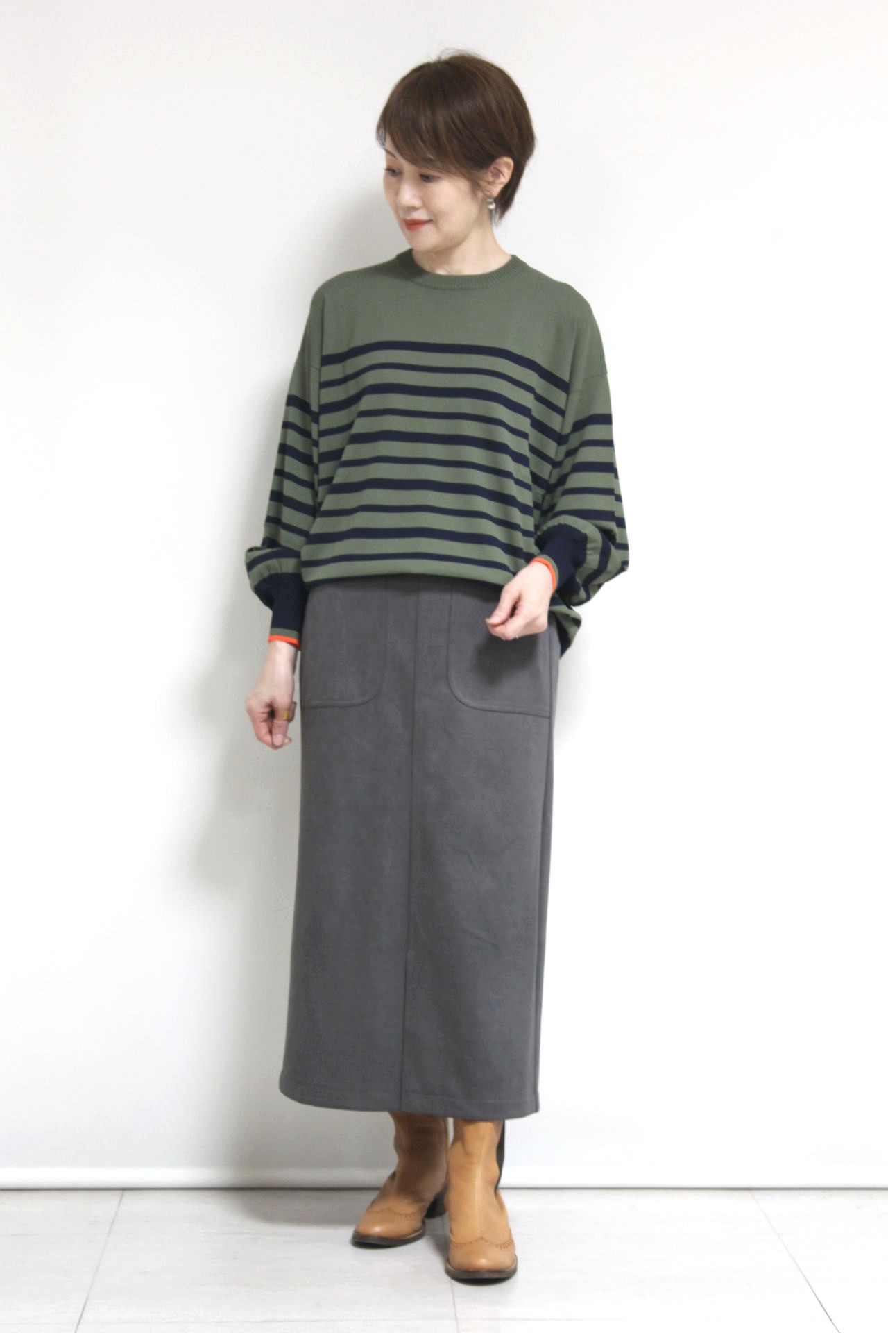 ↓↓カーキとネイビーの色合わせがおしゃれなフォンタナ(FONTANA)袖配色ボーダーニットプルオーバー。雰囲気を作ってくれるボーダーがカジュアルなスタイリングをワンランクアップしてくれます。 13,000円(税込14,300円)フォンタナFONTANA/スカート 14,000円(税込15,400円)ロージーROSIEE