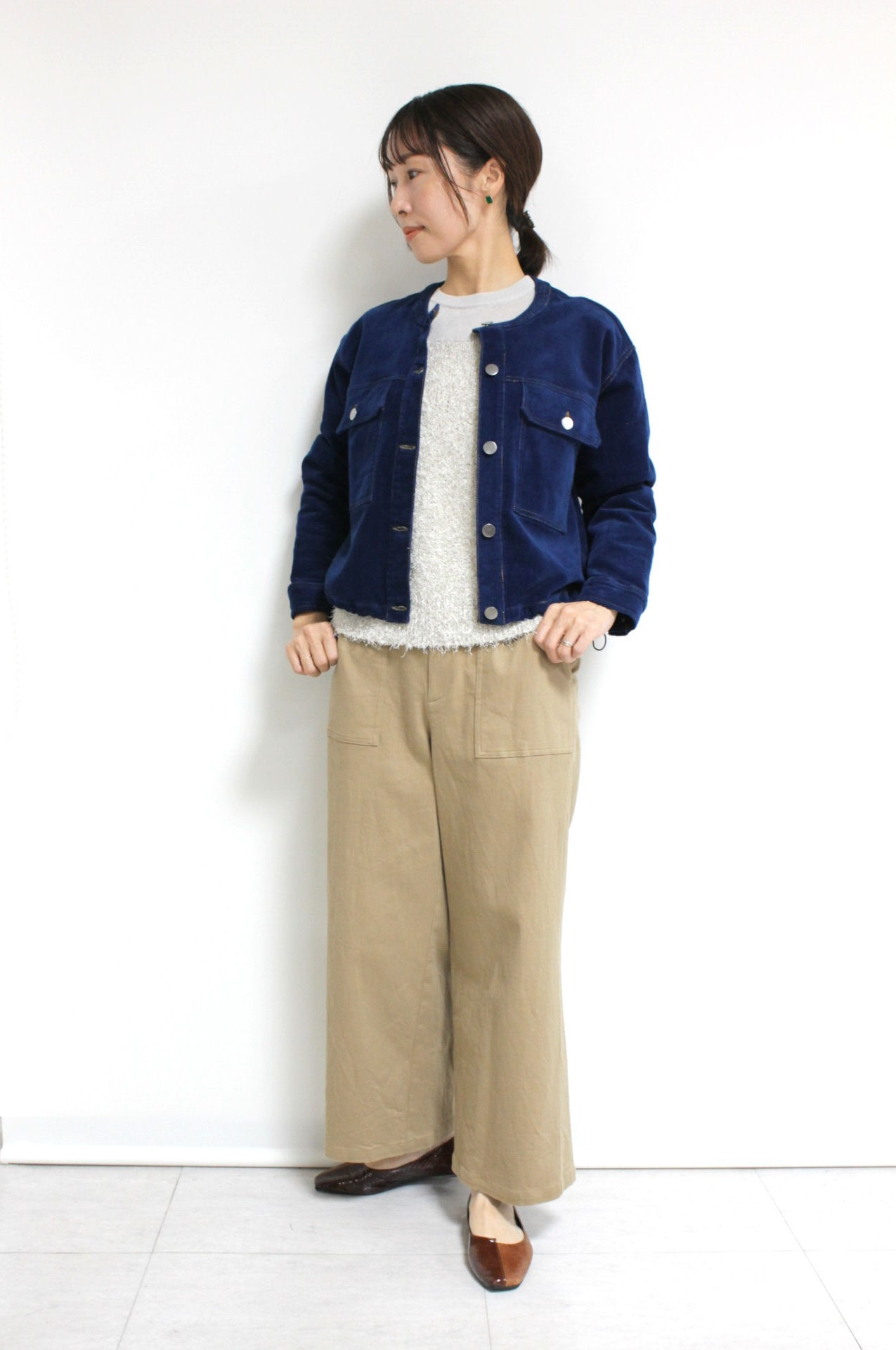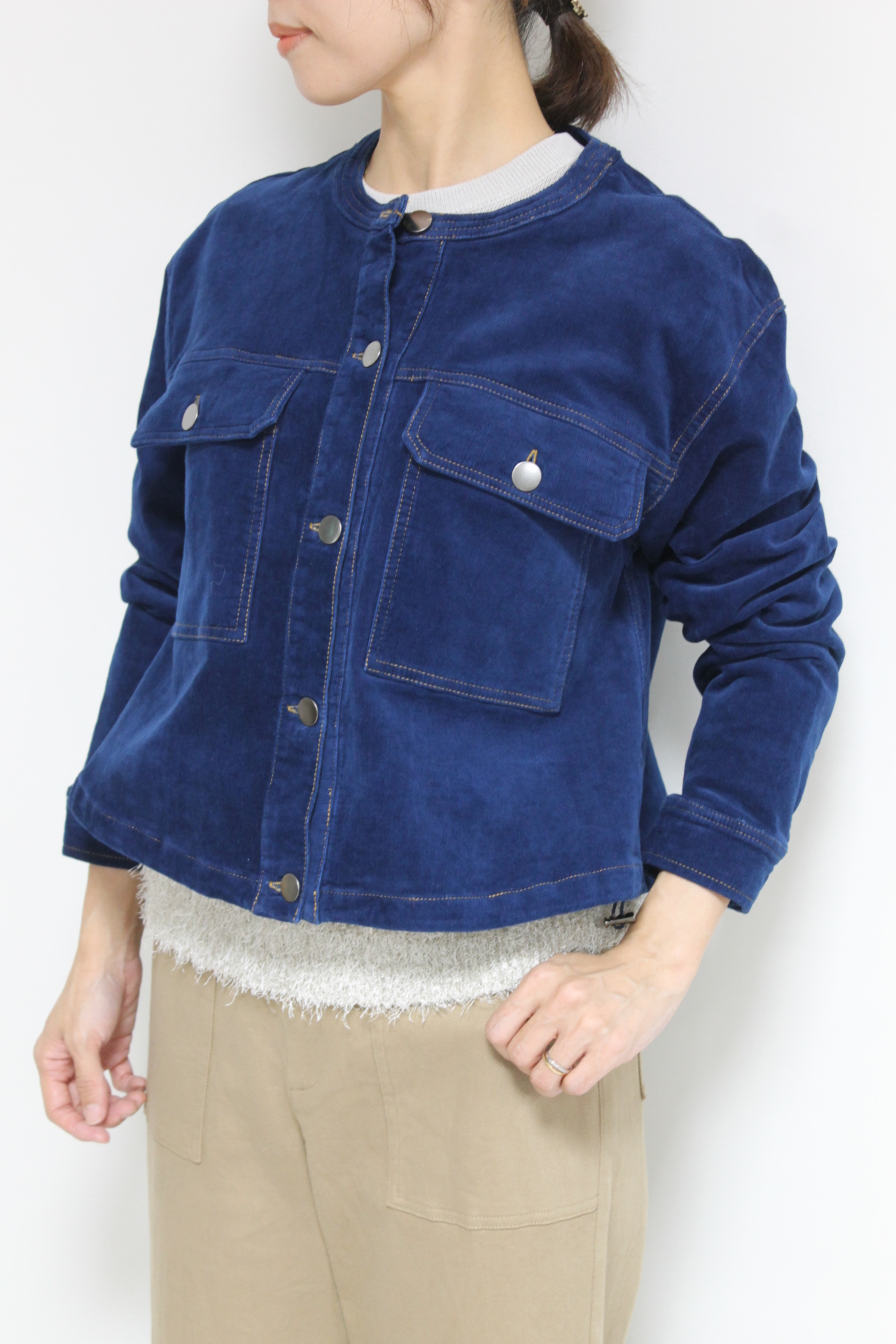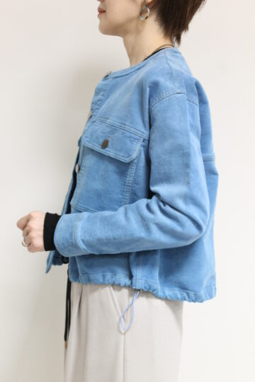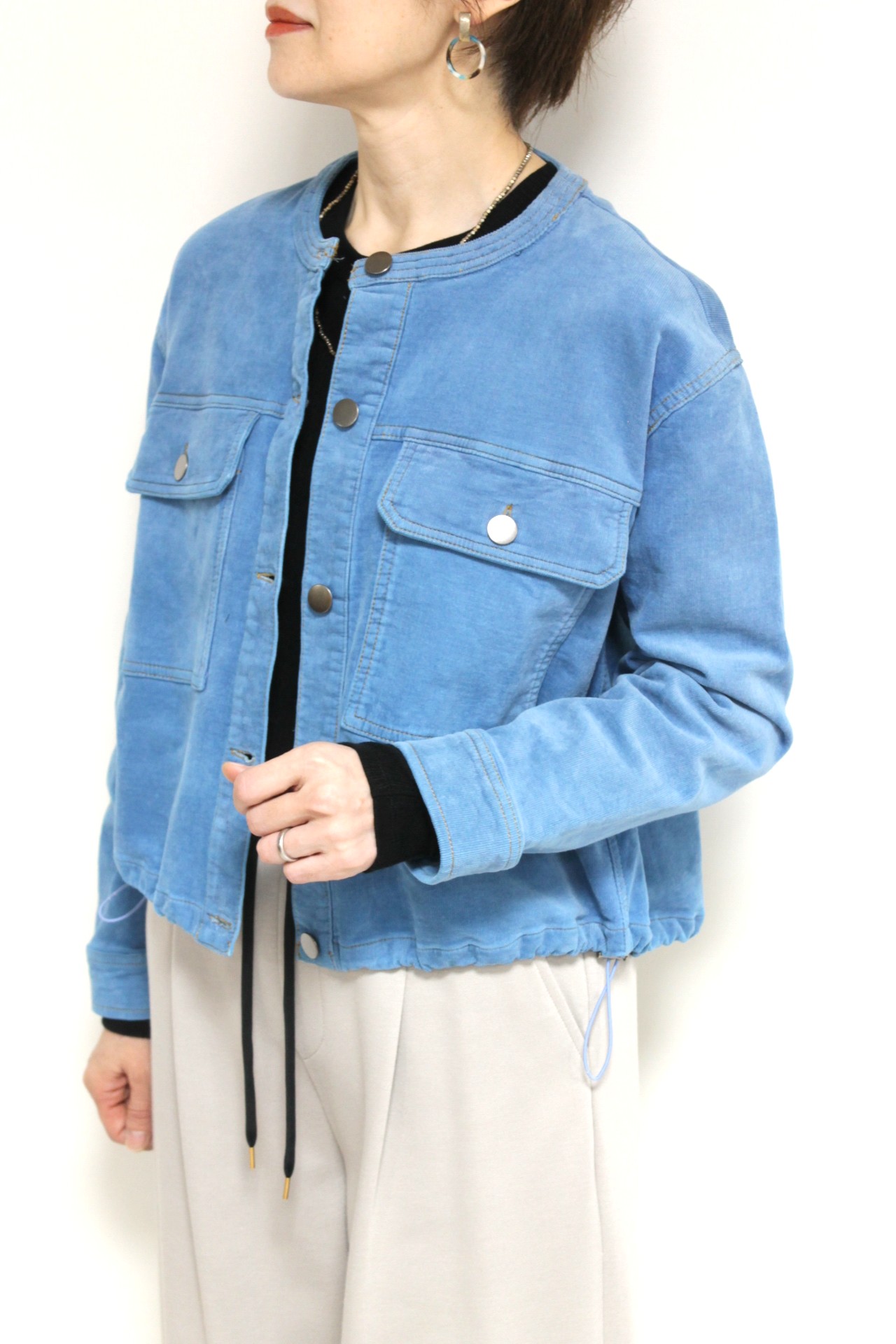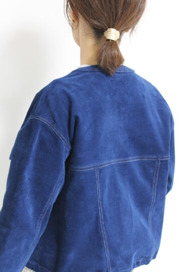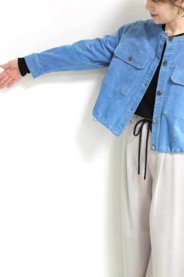 ↓↓マリードール(MARIED’OR)のノーカラーコーデュロイジャケット。柔らかな軽い着心地でたくさん出番がありそうな秋アウターです。「ブルー」17,000円(税込18,700円)マリードールMARIED’OR/パンツ 16,000円(税込17,600円)パシオーネPASSIONE