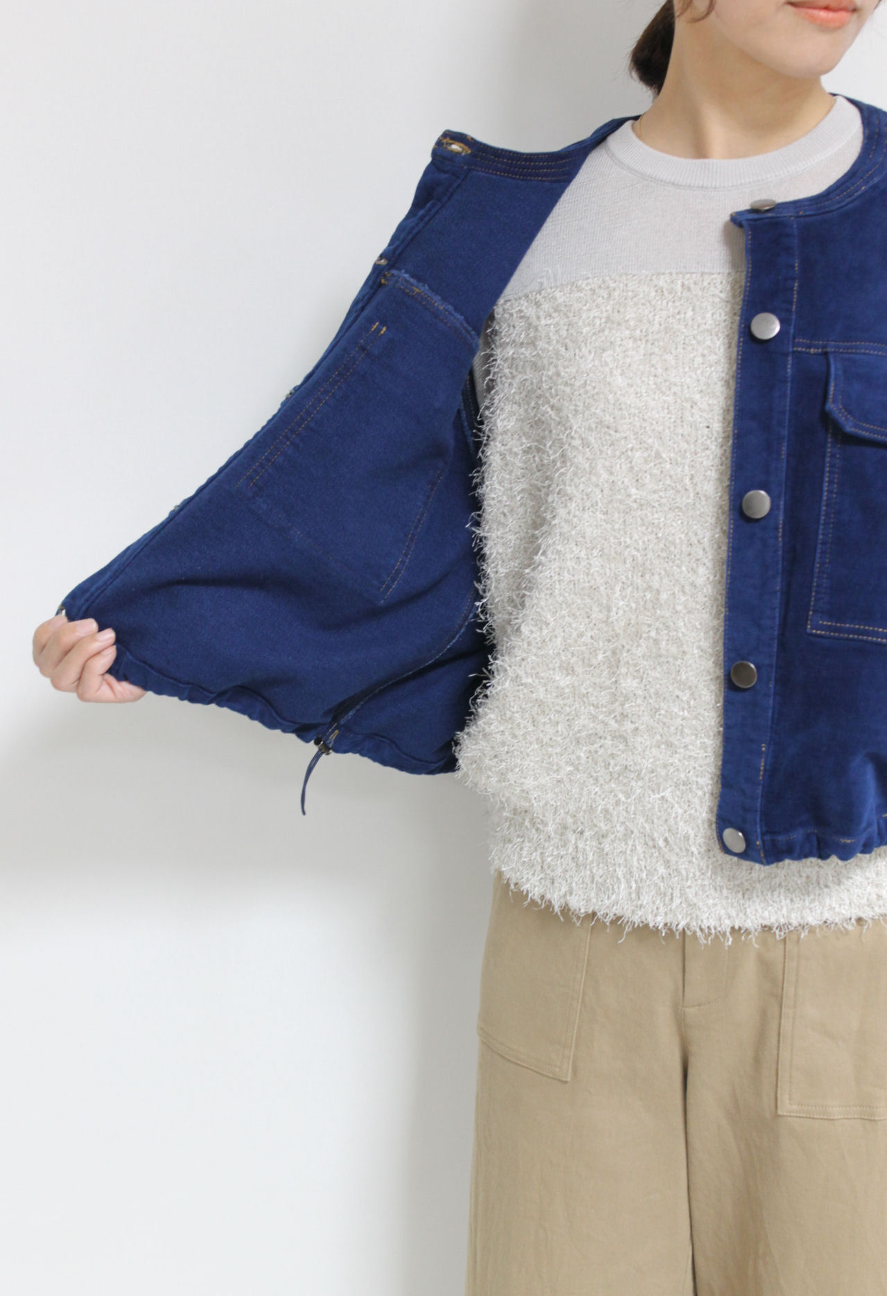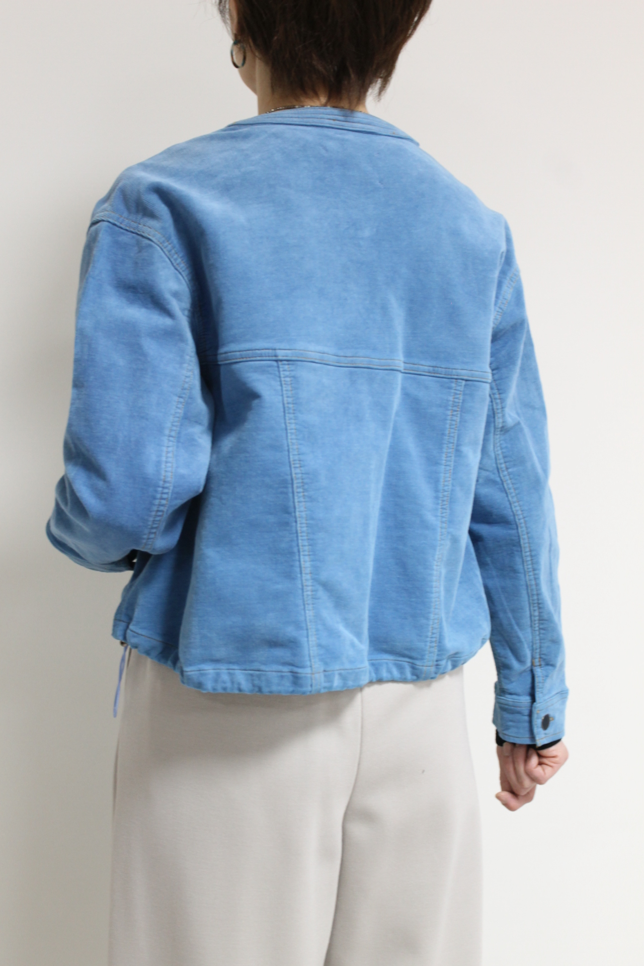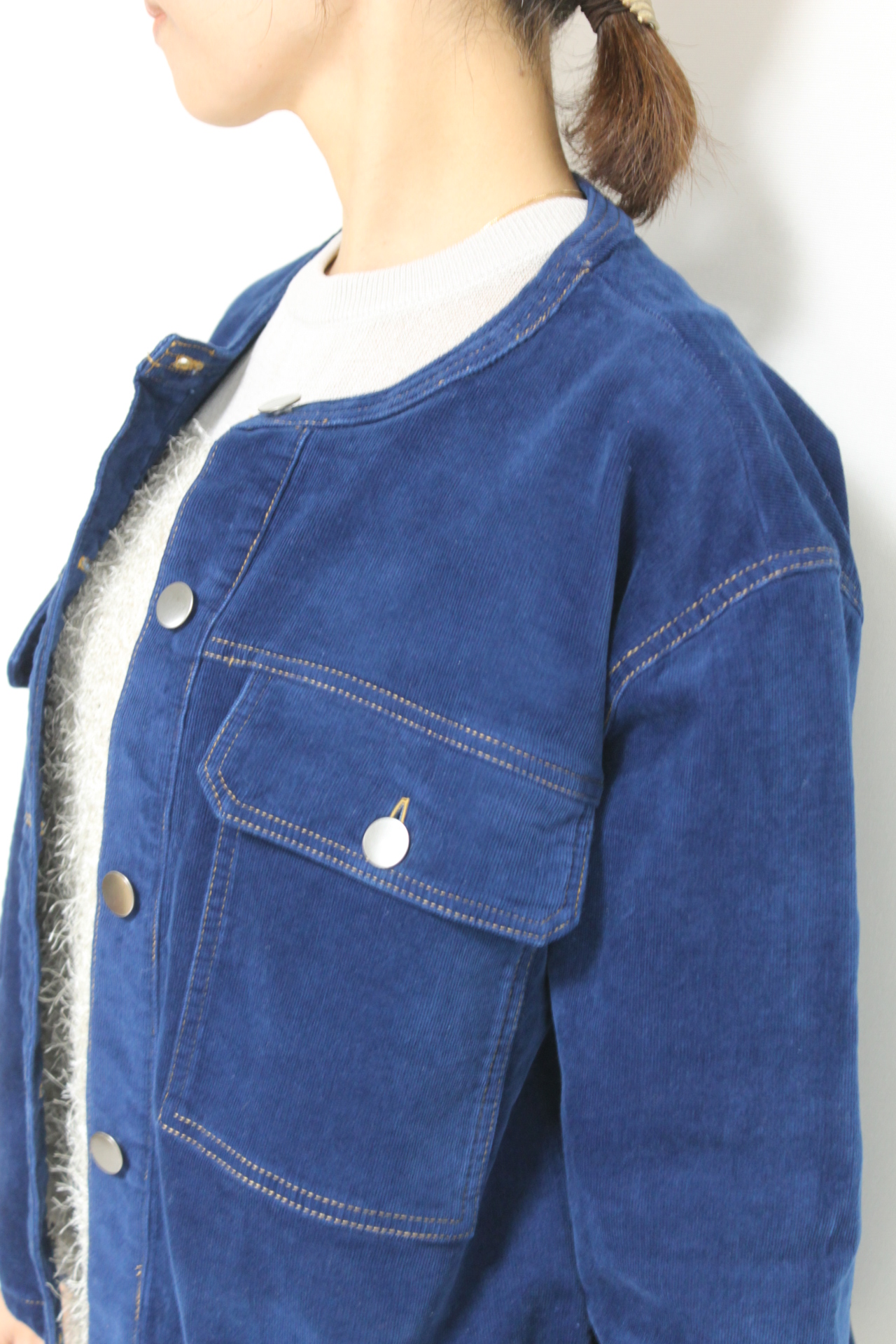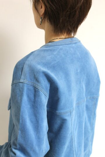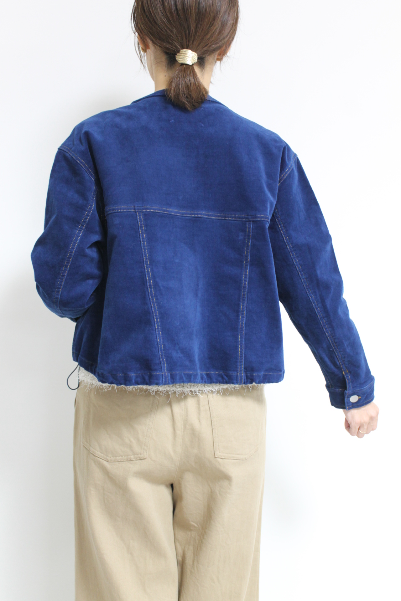 ↓↓マリードール(MARIED’OR)のノーカラーコーデュロイジャケット。柔らかな軽い着心地でたくさん出番がありそうな秋アウターです。「ブルー」17,000円(税込18,700円)マリードールMARIED’OR/パンツ 16,000円(税込17,600円)パシオーネPASSIONE