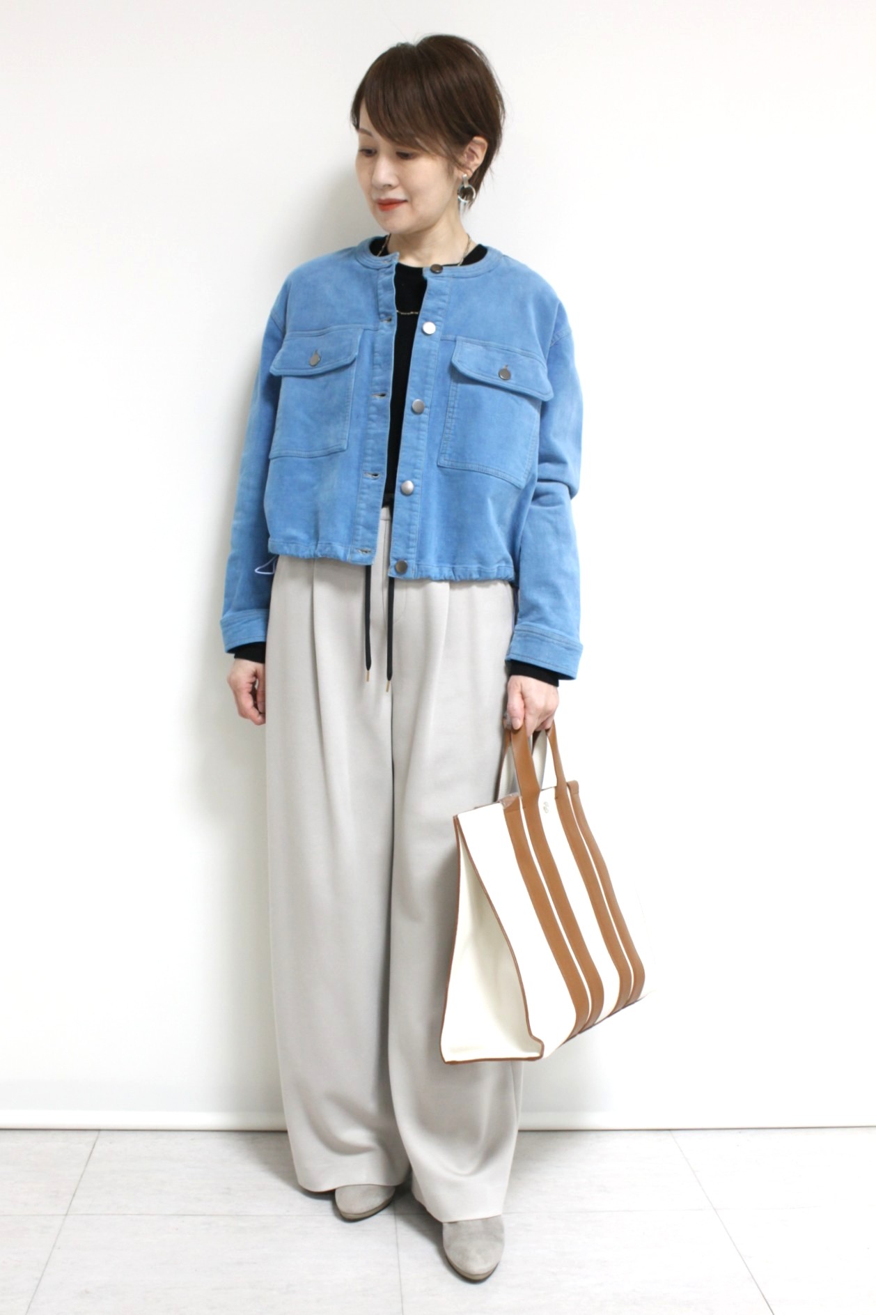 ↓↓トレンド感のあるショート丈で上半身をコンパクトに見せる華奢見せ効果◎