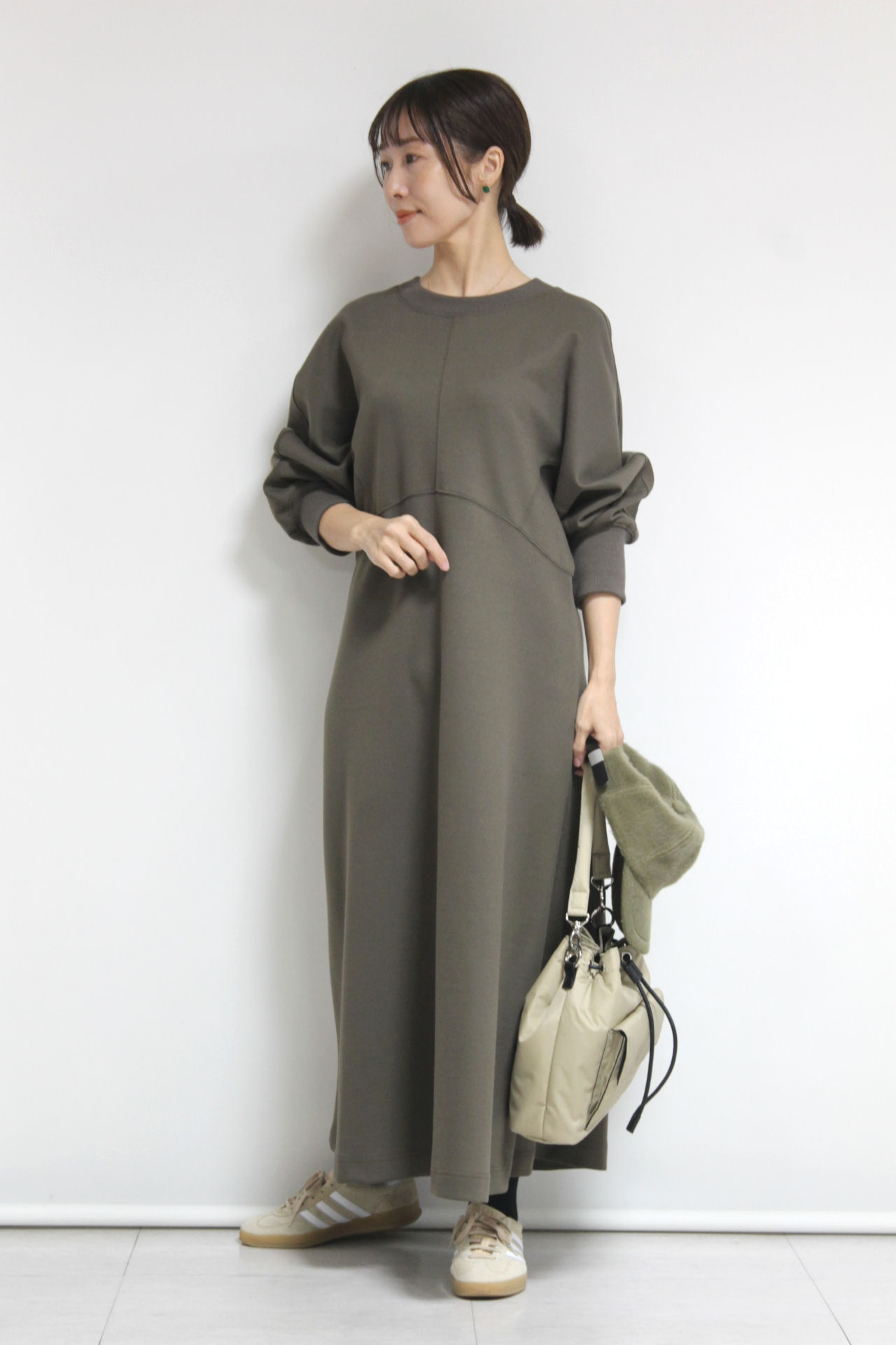 ↓↓ゆったりしたシルエットで身体のラインを拾いにくいのもうれしい。