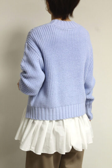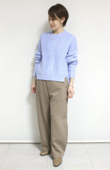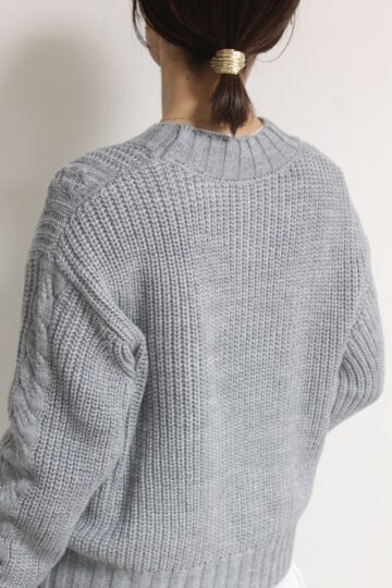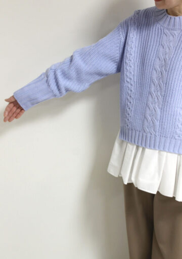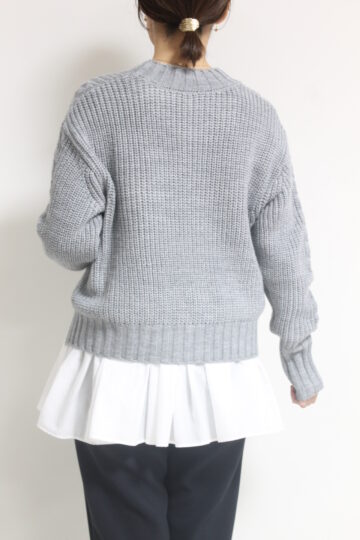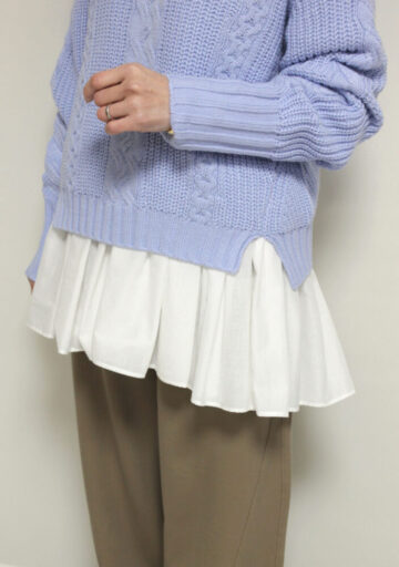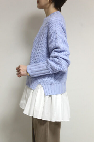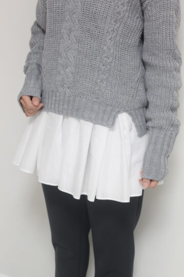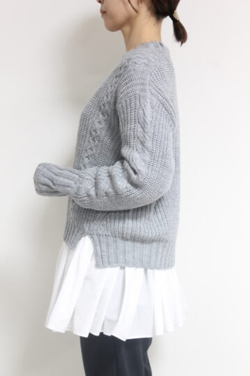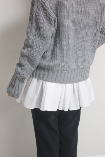 ↓↓ラフな感じで編み上げた正統派のケーブル柄セーターにフェミニンなシャツをレイヤードしたような雰囲気。「グレー」 18,900円(税込20,790円)ディニテコリエDignite Collier