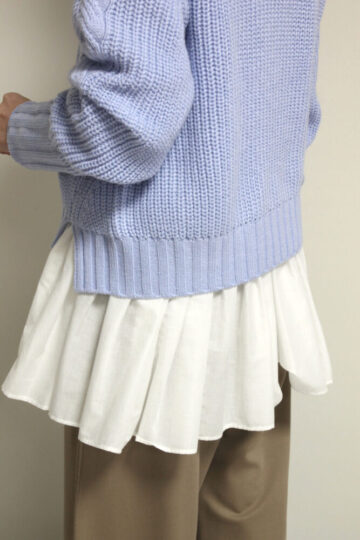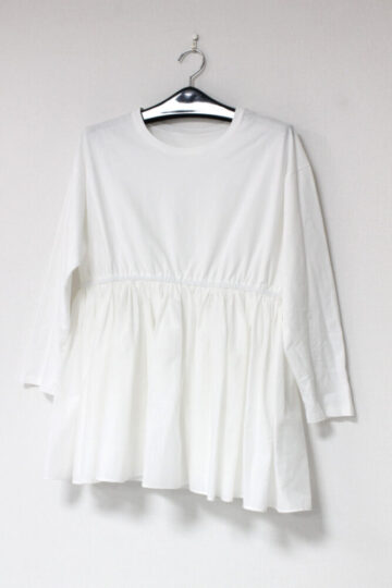 ↓↓ウエスト下部分を生地をたっぷり使用した布帛に切り替えたカットソーはお手持ちのニットとのレイヤードにもお役立ちします♪
