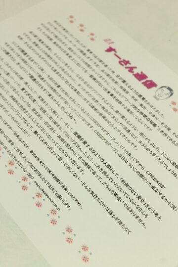 最初は「服屋がこんなものを送っていいんだろうか?」って感じで恐る恐る投函したんです( ´・ω・`)ゞ。でも驚くほど反響があって・・グッとお客様との距離が近くなった気がしました。その距離感が今のCREEKSを作ってくれたのでは・・っていつも思ってます。 Yさーん!貴重なお話をありがとーございました。