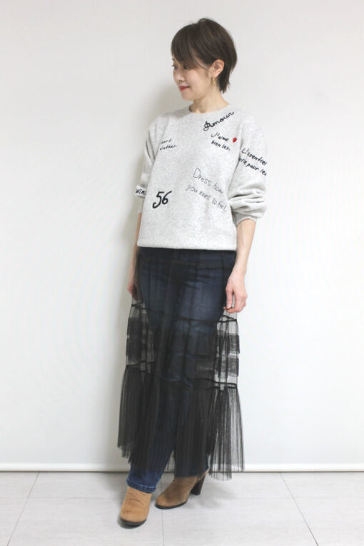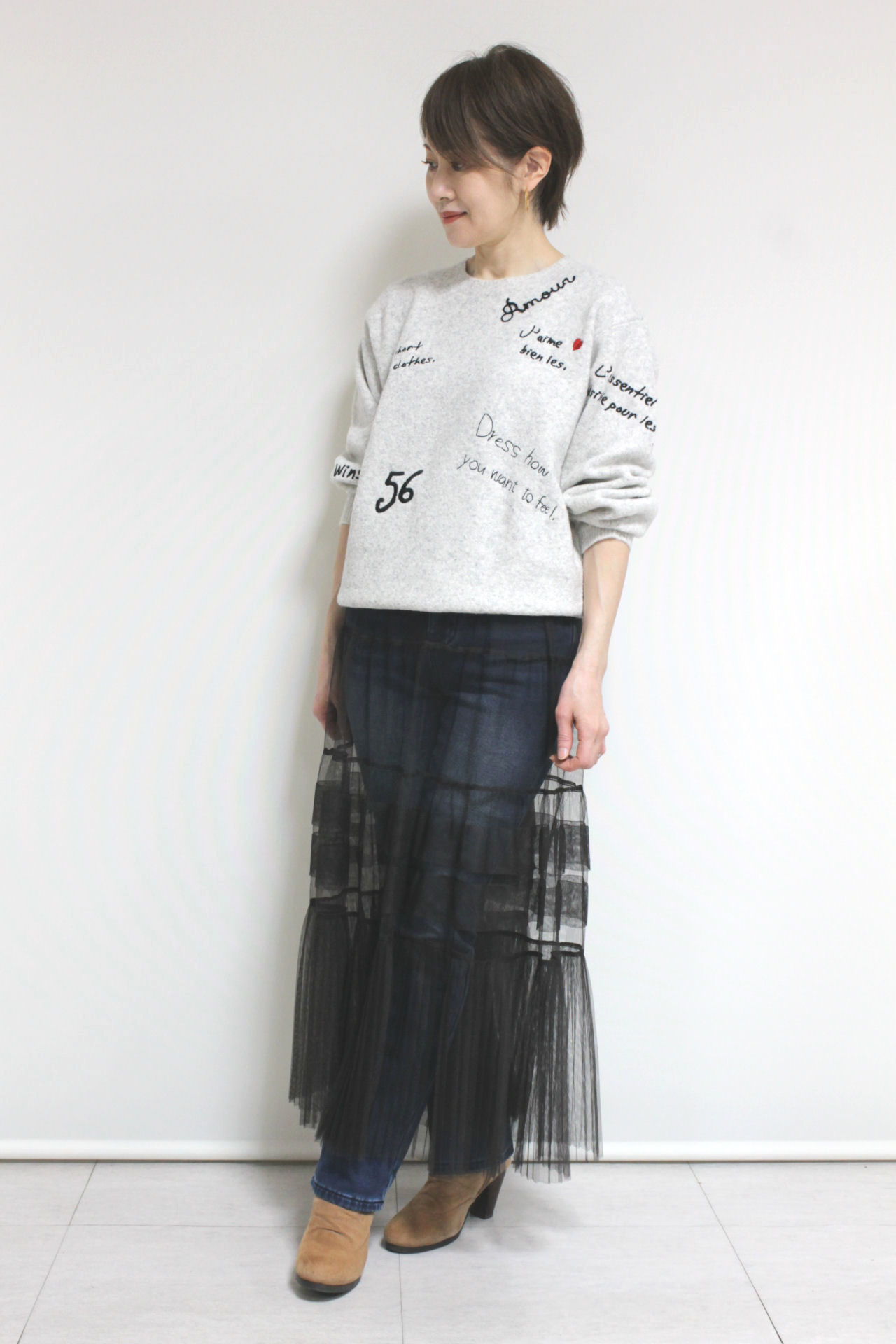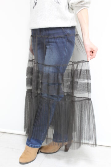 ↓↓二枚を重ねるのが基本ですが、チュールスカートはデニムとのレイヤードもOKです。