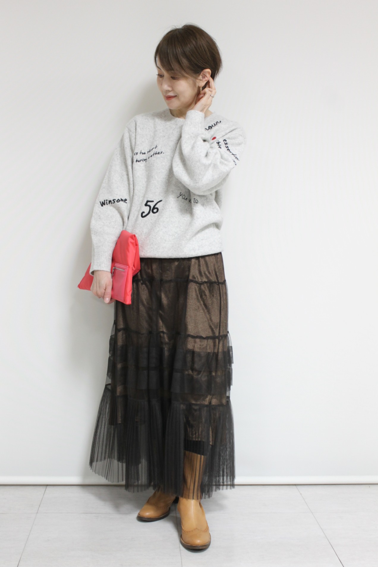 ↓↓このスカートはきちんと説明しないとわからないですね(笑)・・ディニテコリエ(Dignite Collier)チュール×サテンレイヤードSK。13,000円(税込14,300円)ディニテコリエDignite Collier/セーター 14,000円(税込15,400円)ロージーROSIEE