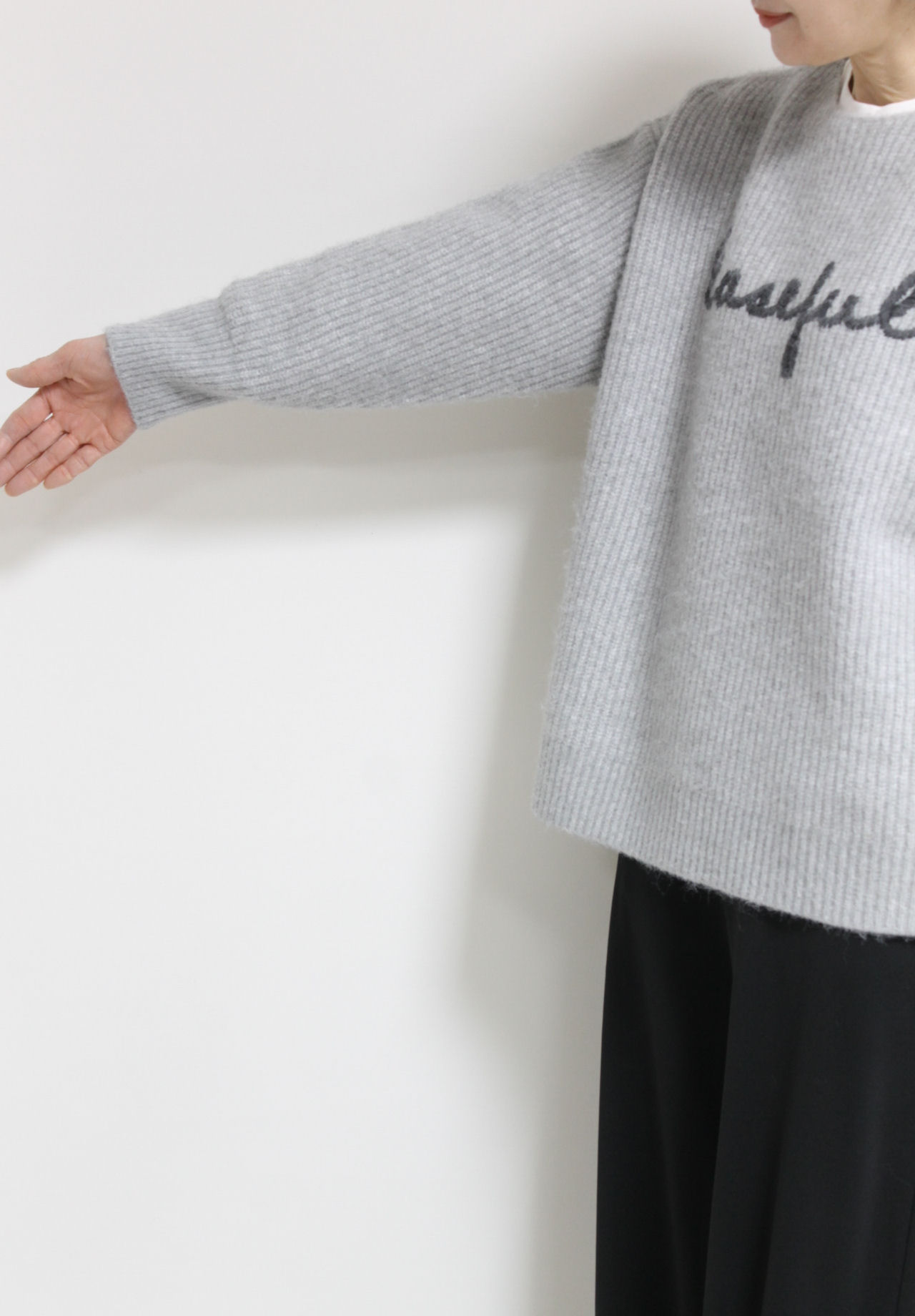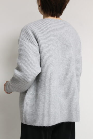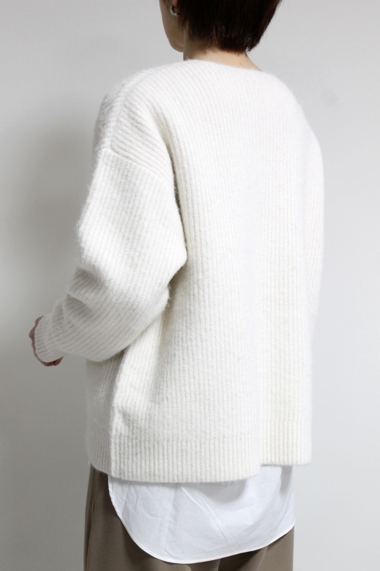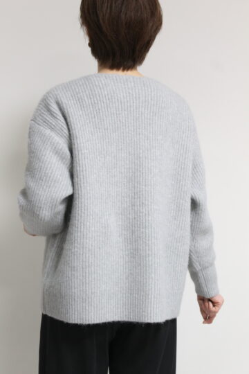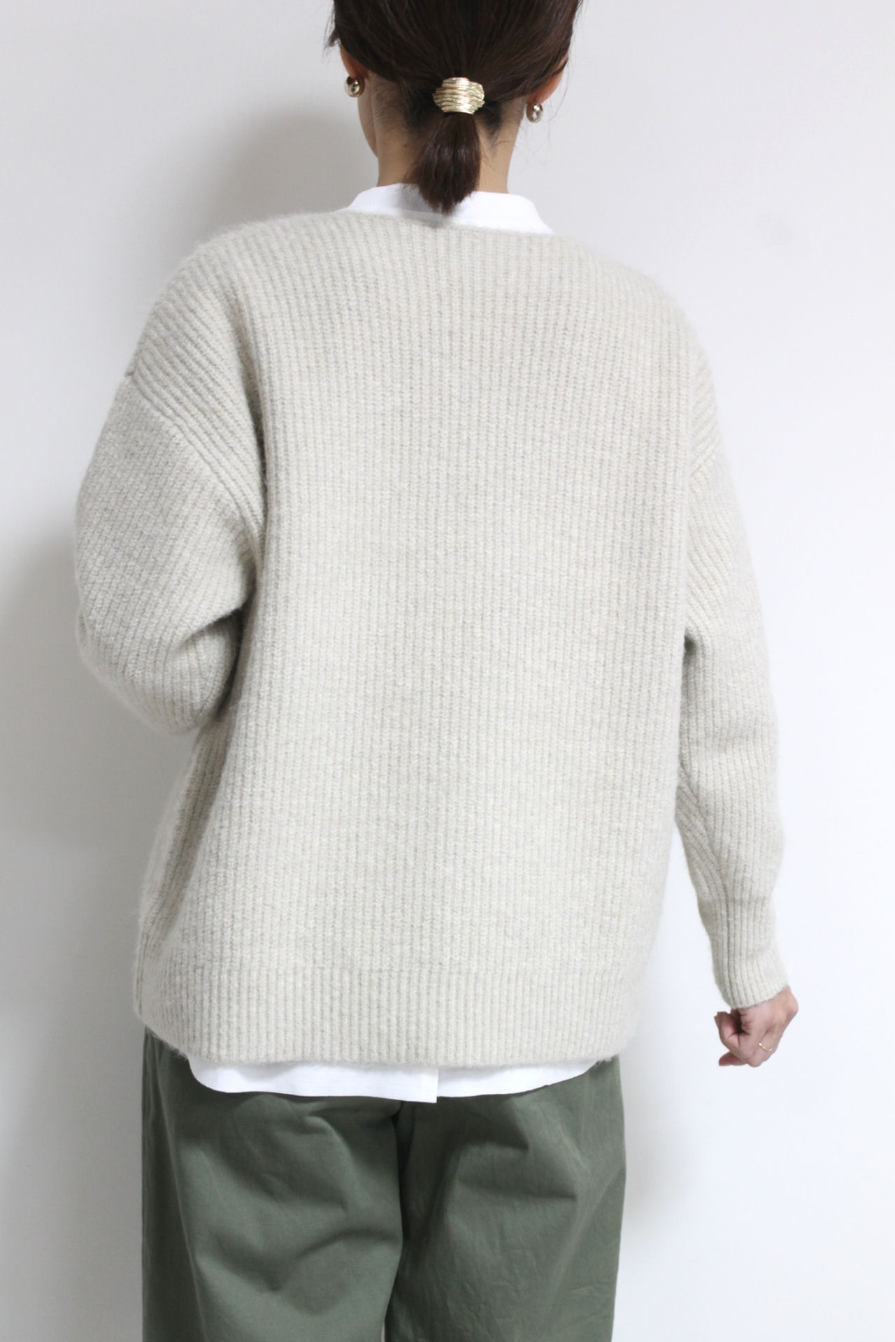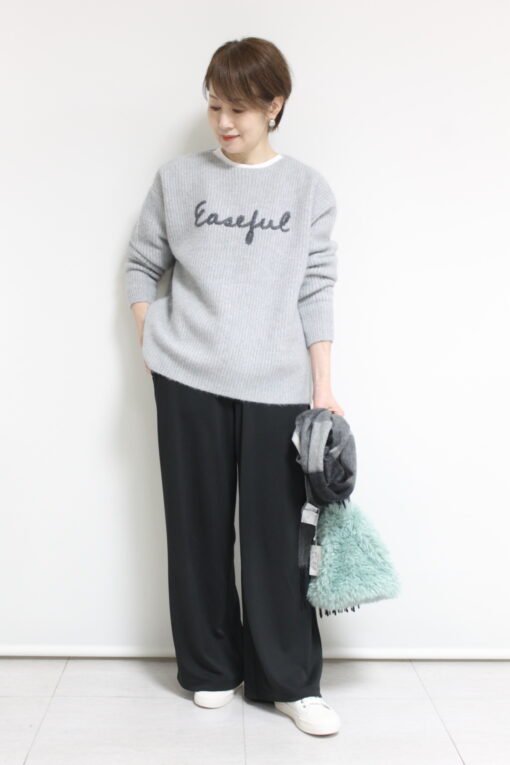 ↓↓畦編みならではの縦ラインがすっきり見えします。程よくボリュームのある風合いが冬のスタイリングによく合います。