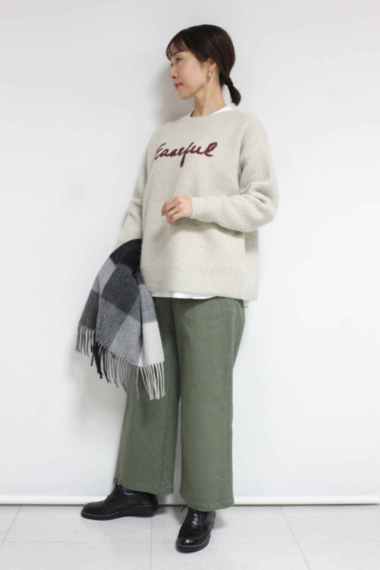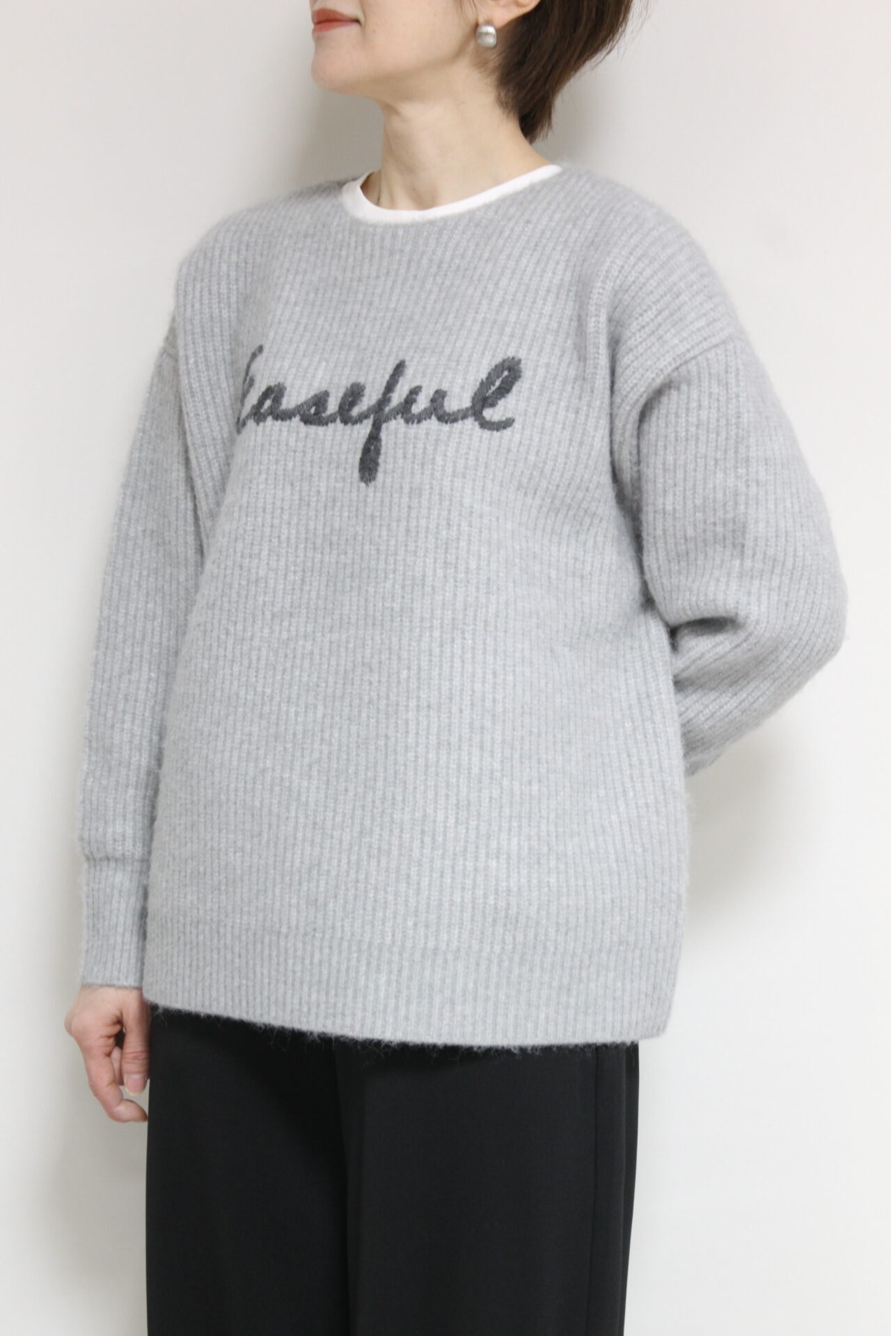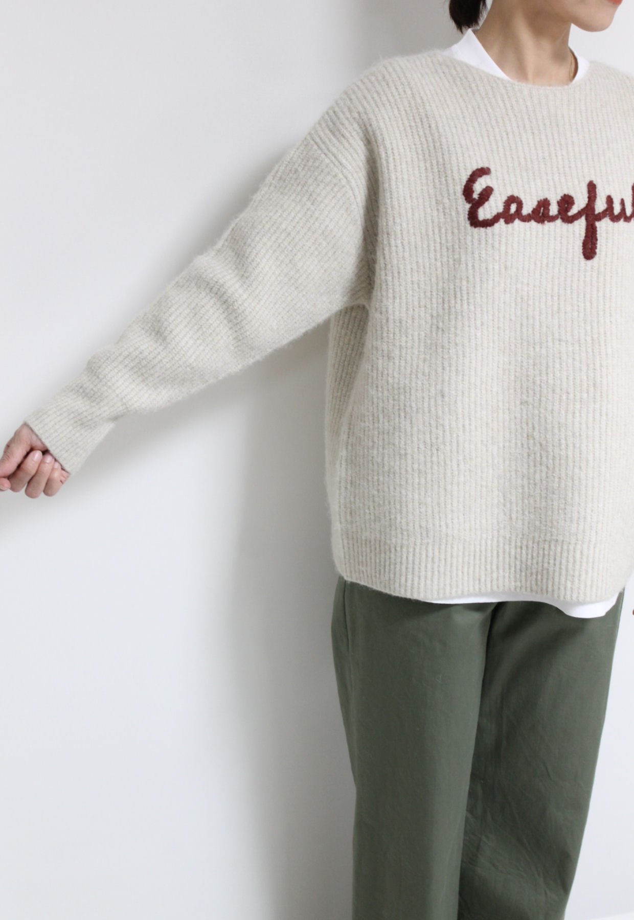 ↓↓畦編みならではの縦ラインがすっきり見えします。程よくボリュームのある風合いが冬のスタイリングによく合います。