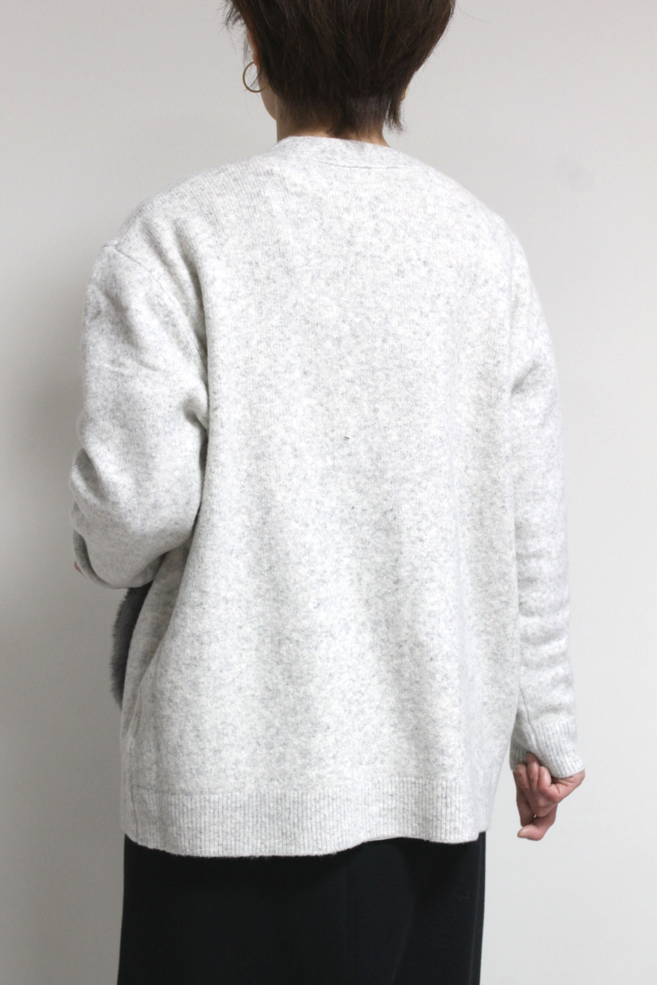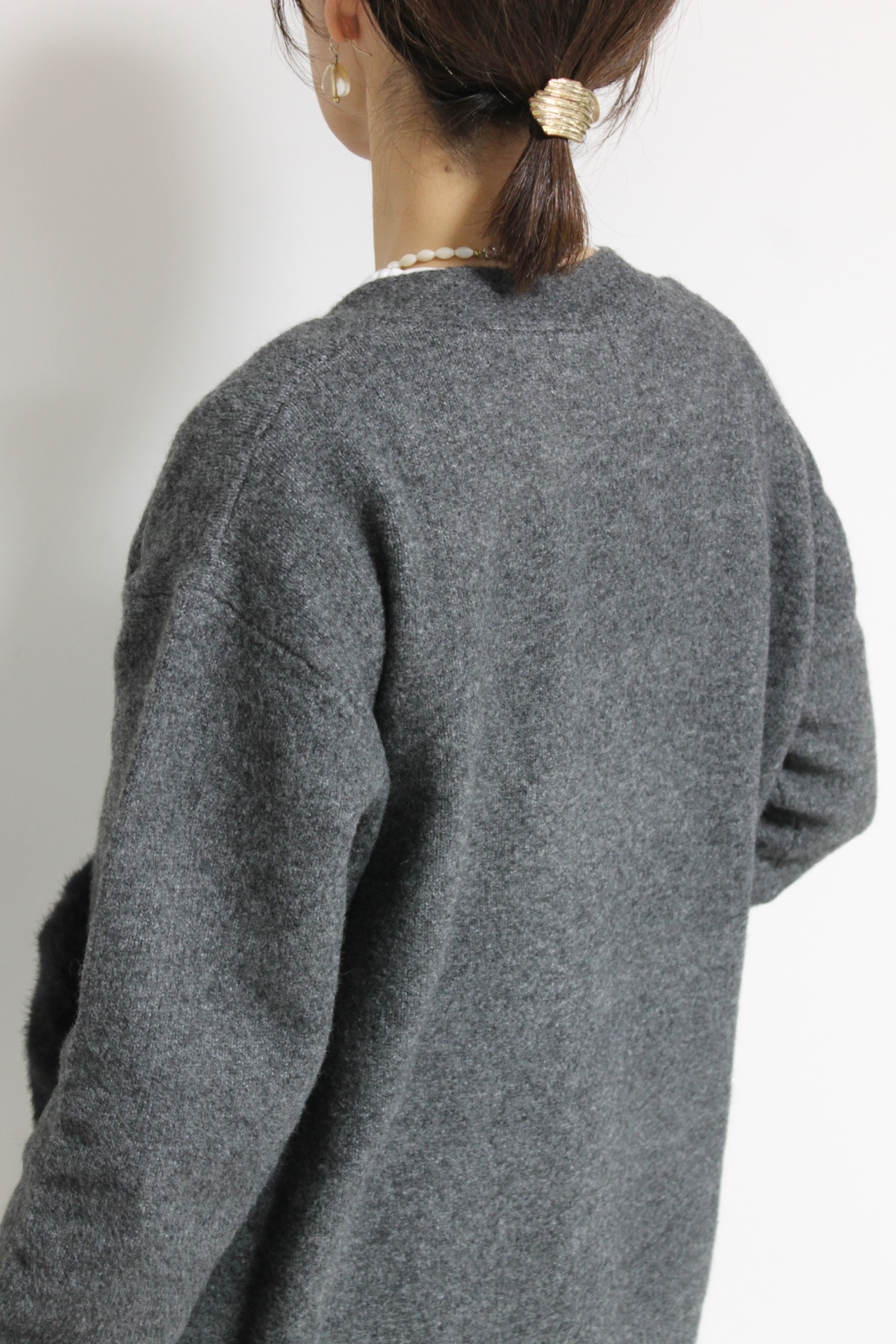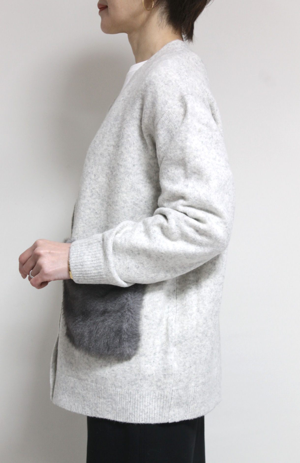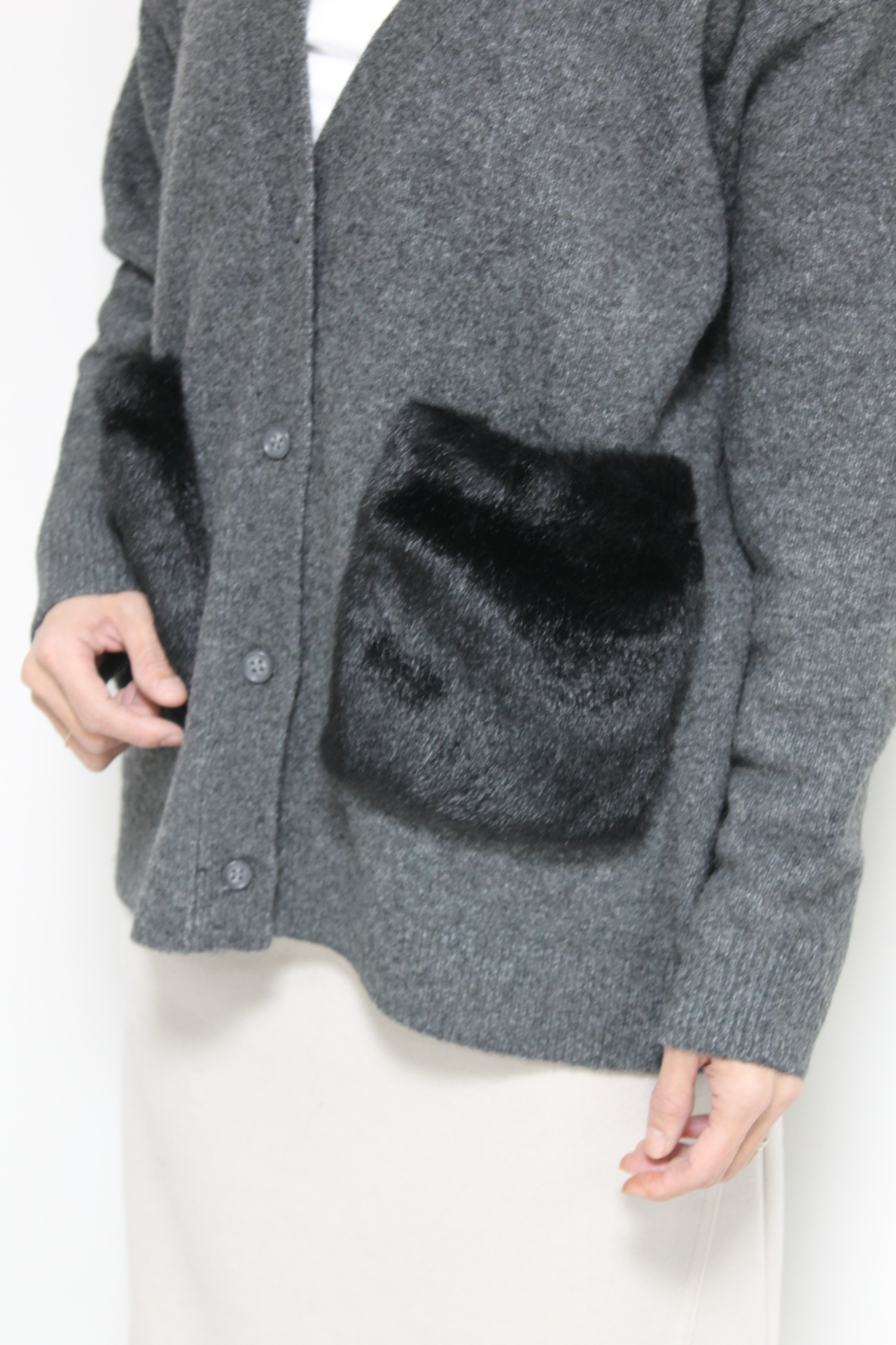 ↓↓シンプルな編地にフェイクファーのポケットで抜け感のある仕上がりに。