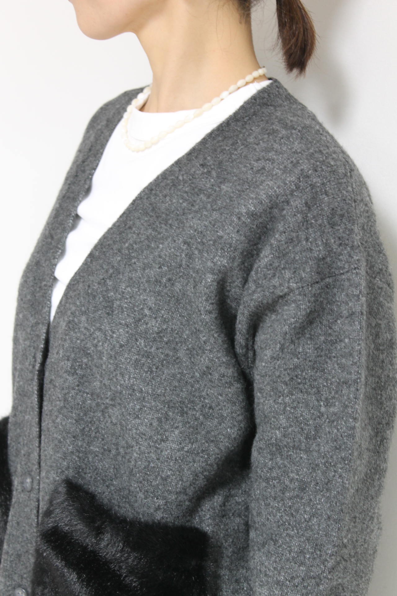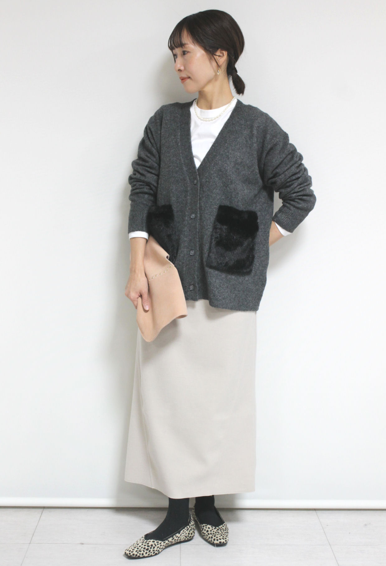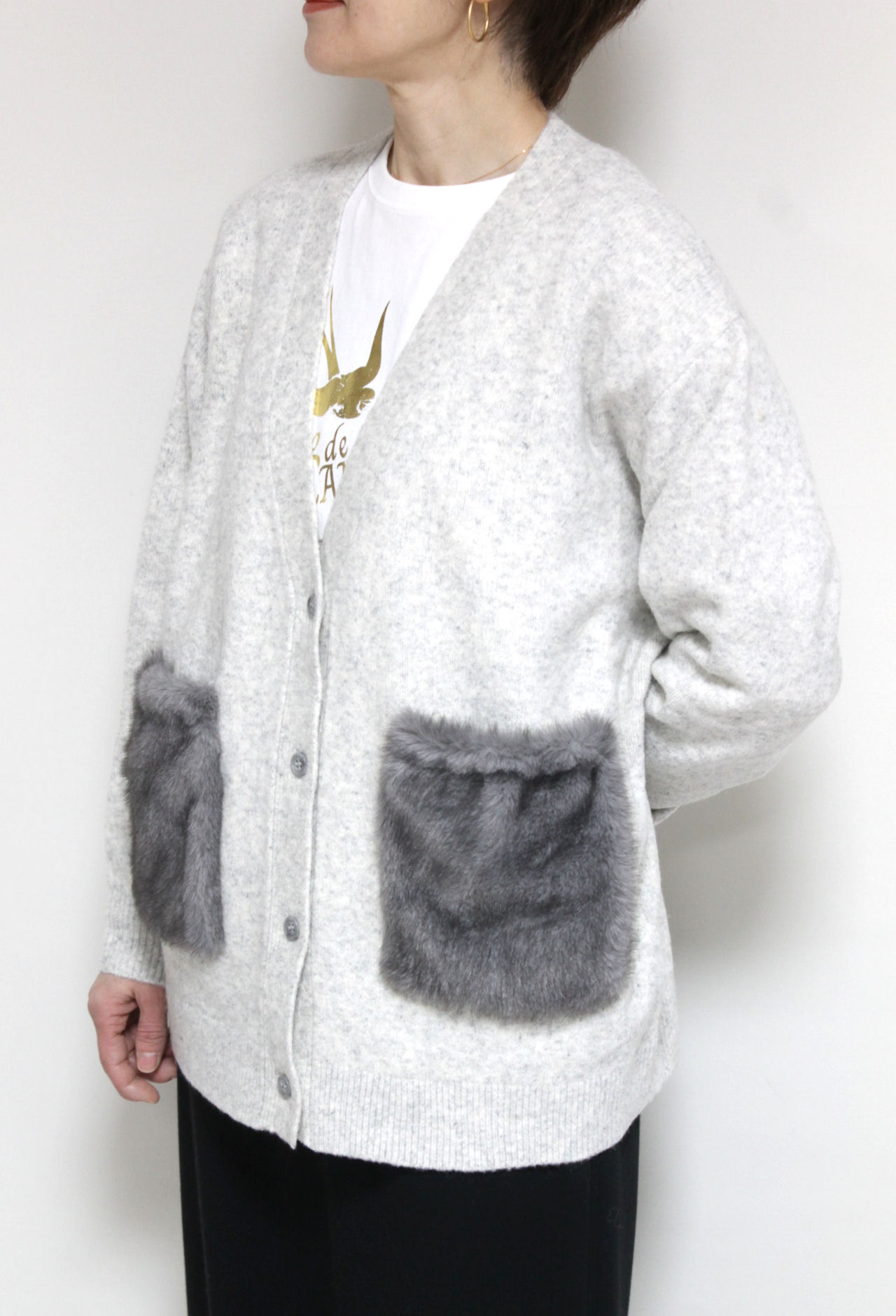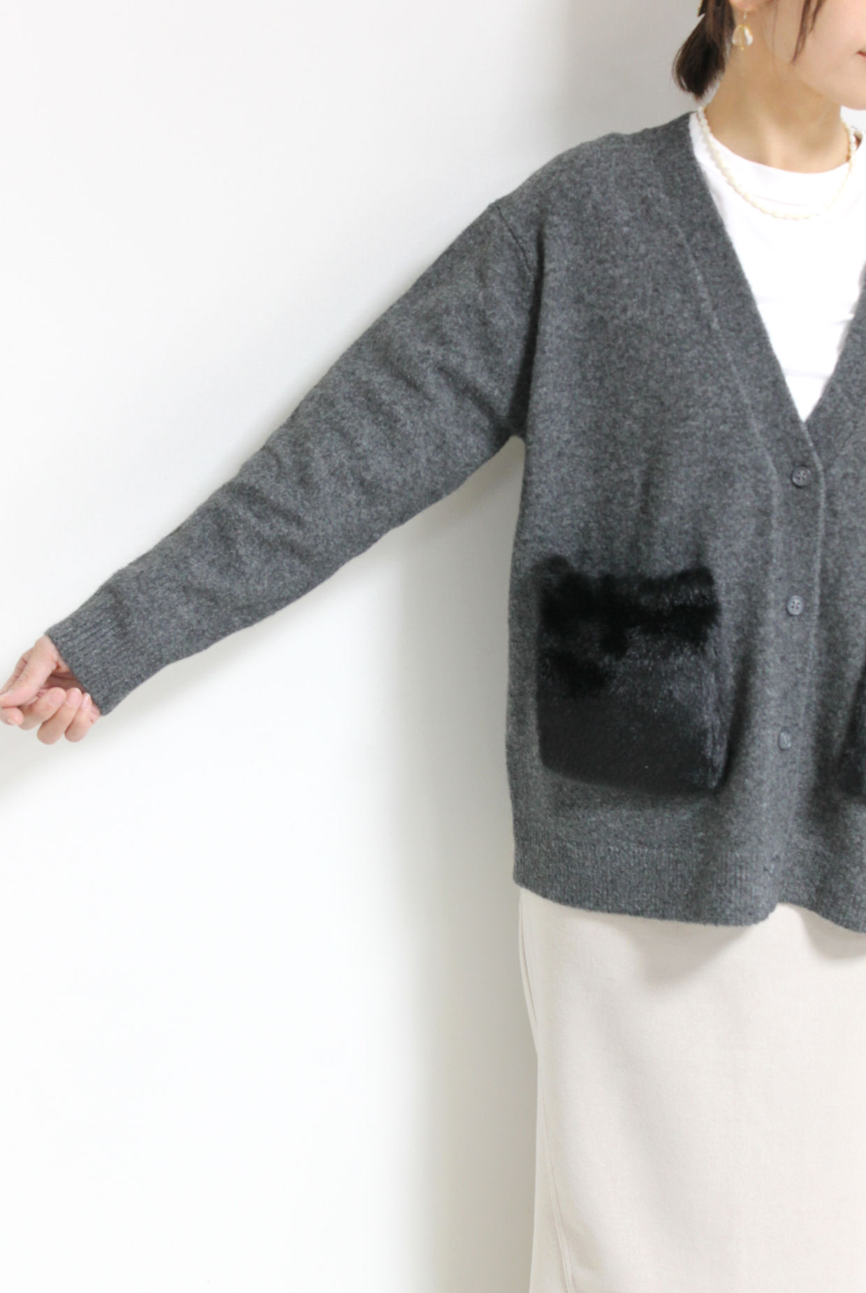 ↓↓シンプルな編地にフェイクファーのポケットで抜け感のある仕上がりに。