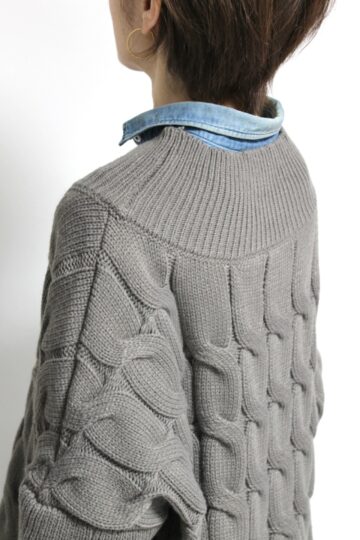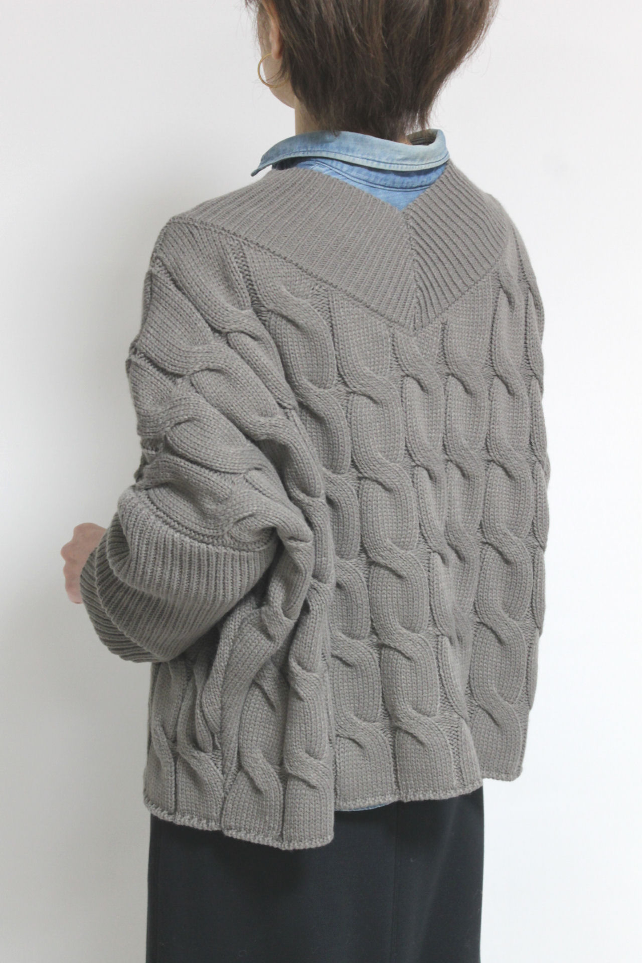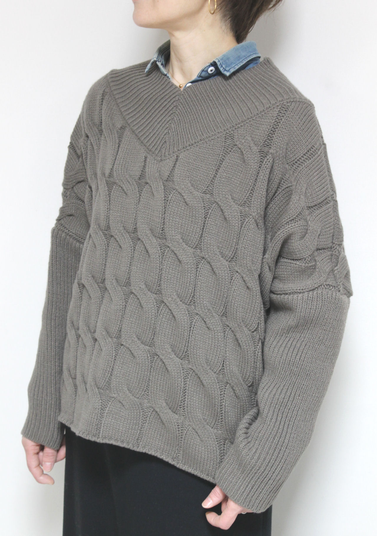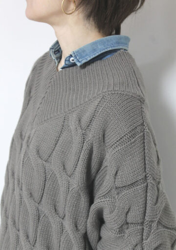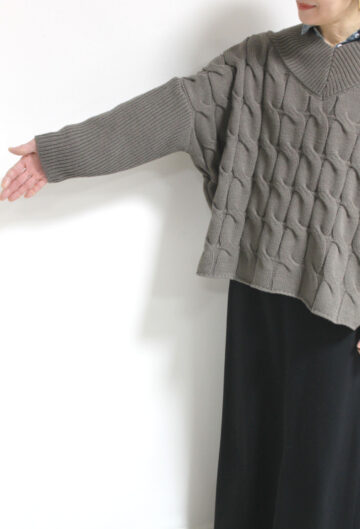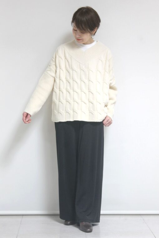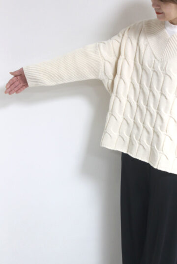 ↓↓ローゲージのざっくり感とV ネック、立体感のある編地がとっても上品です。
