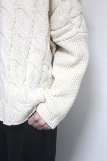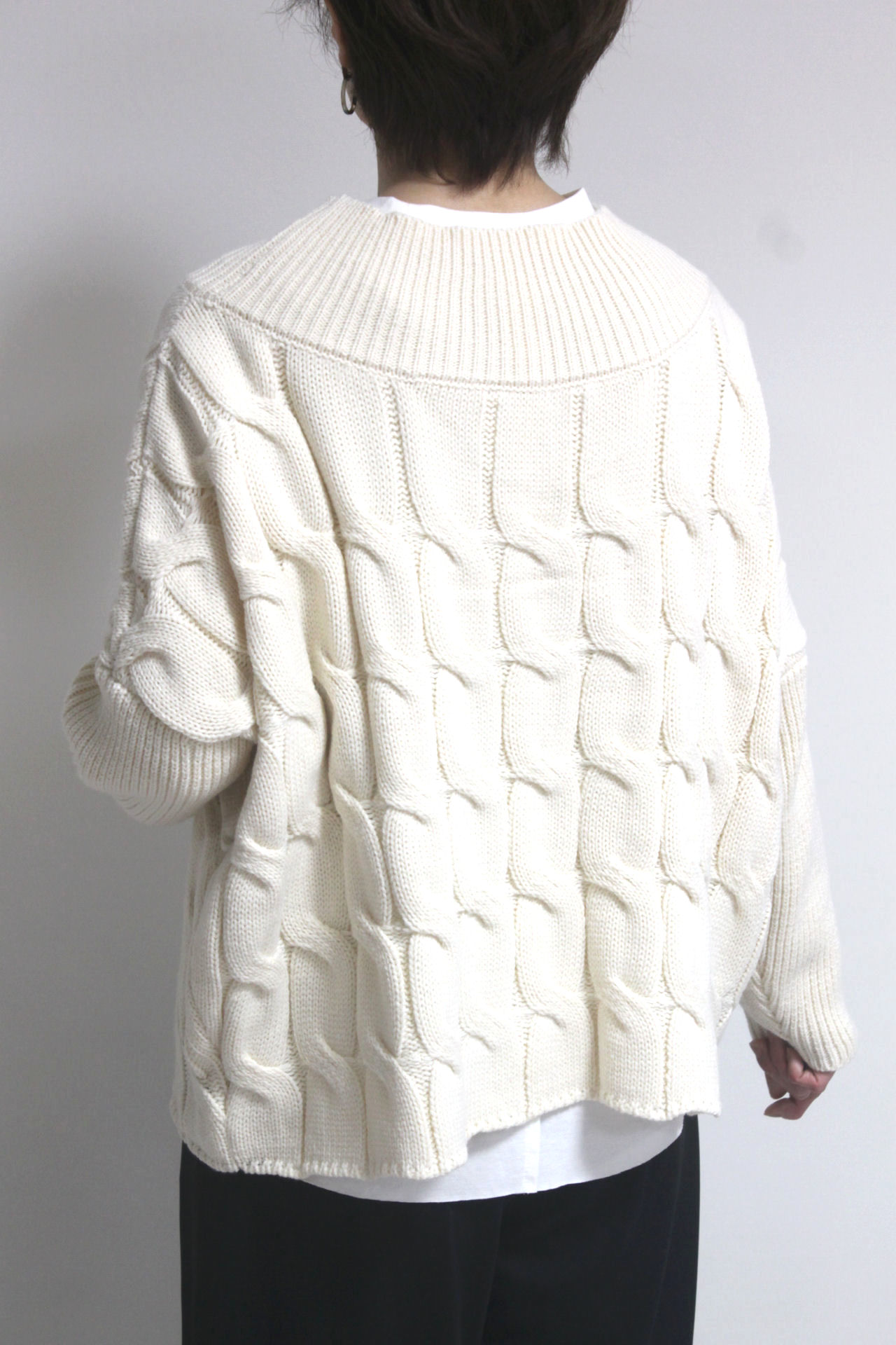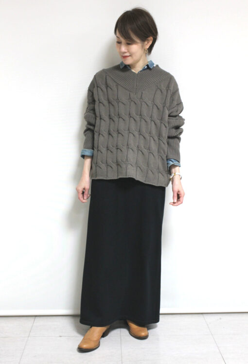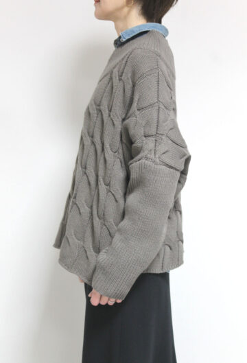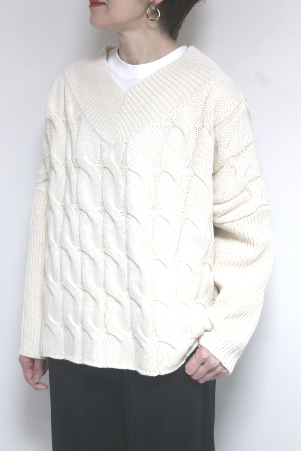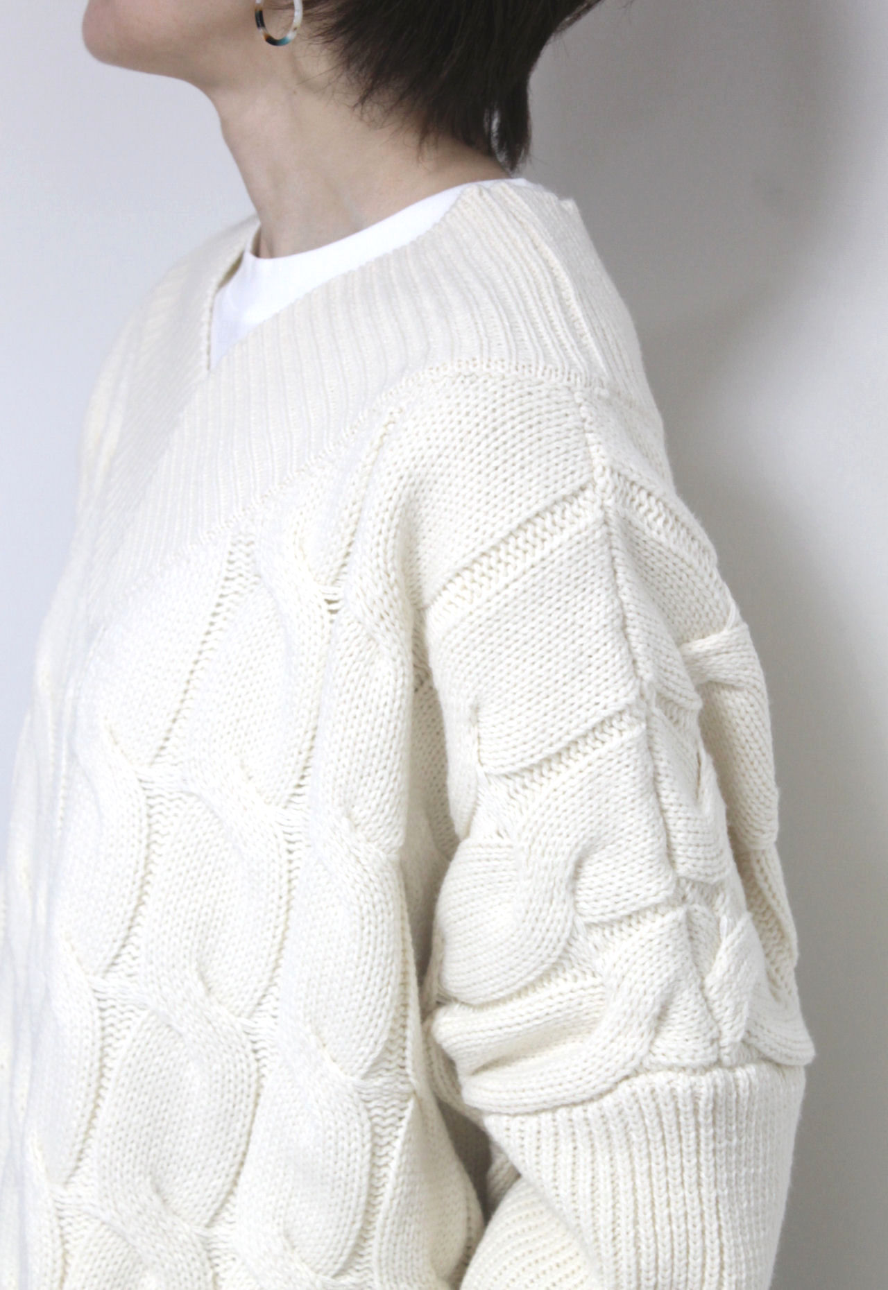 ↓↓ローゲージのざっくり感とV ネック、立体感のある編地がとっても上品です。