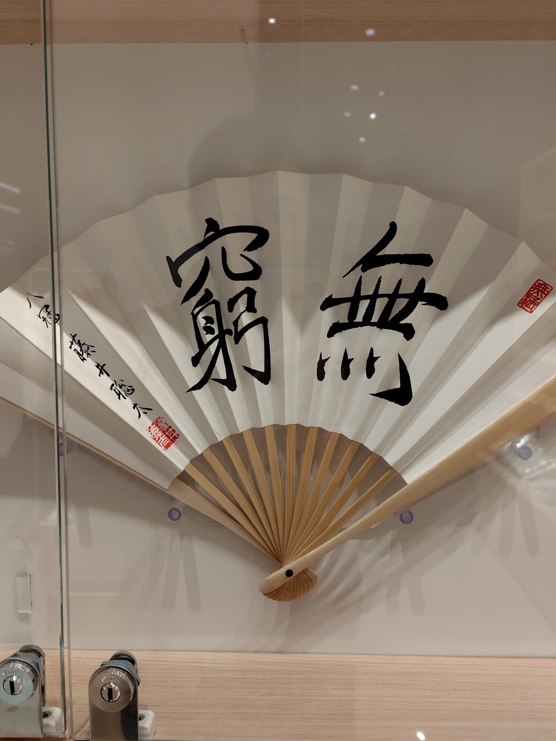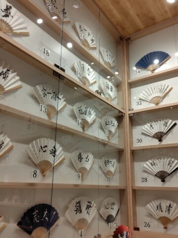 中には著名なプロ棋士たちの好きな言葉が書かれた扇子が飾られてました(売り物です)。