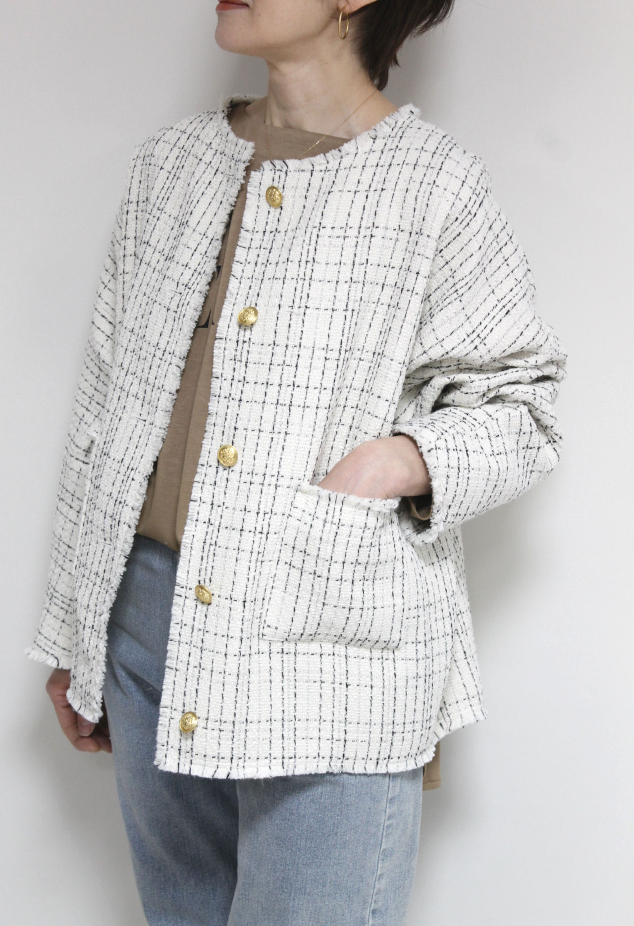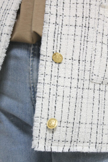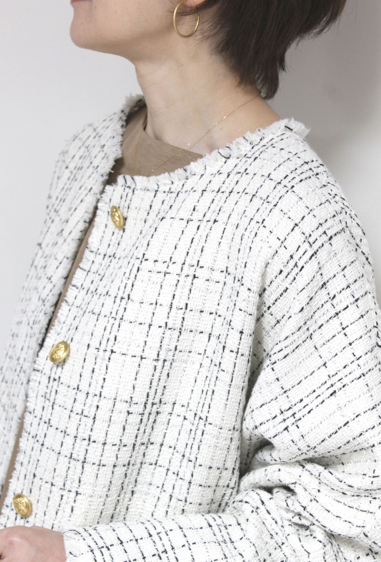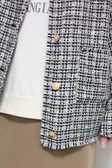 ↓↓何種類かの糸を組み合わせて仕上げたこだわりのツイードで金ボタンがアクセント。