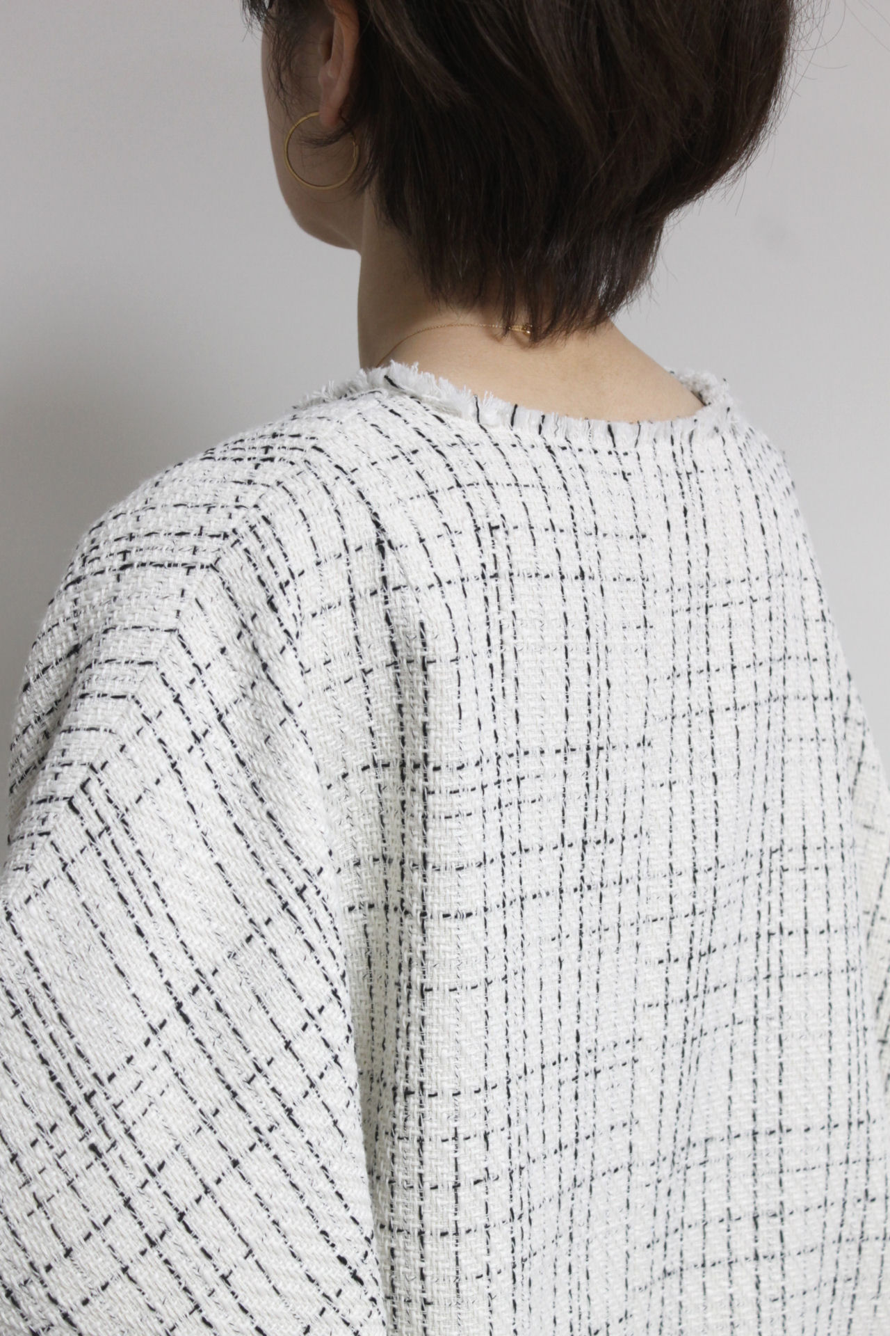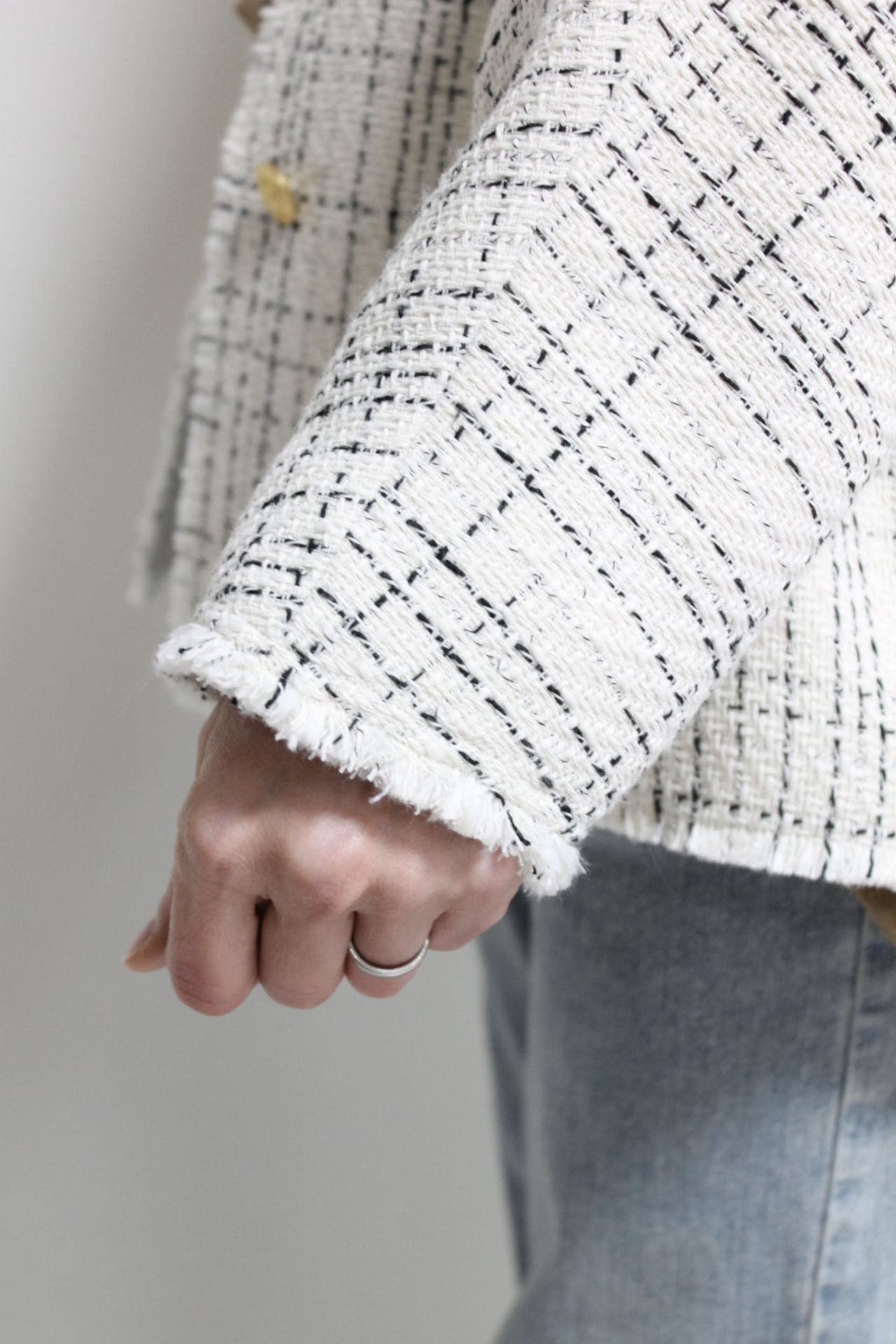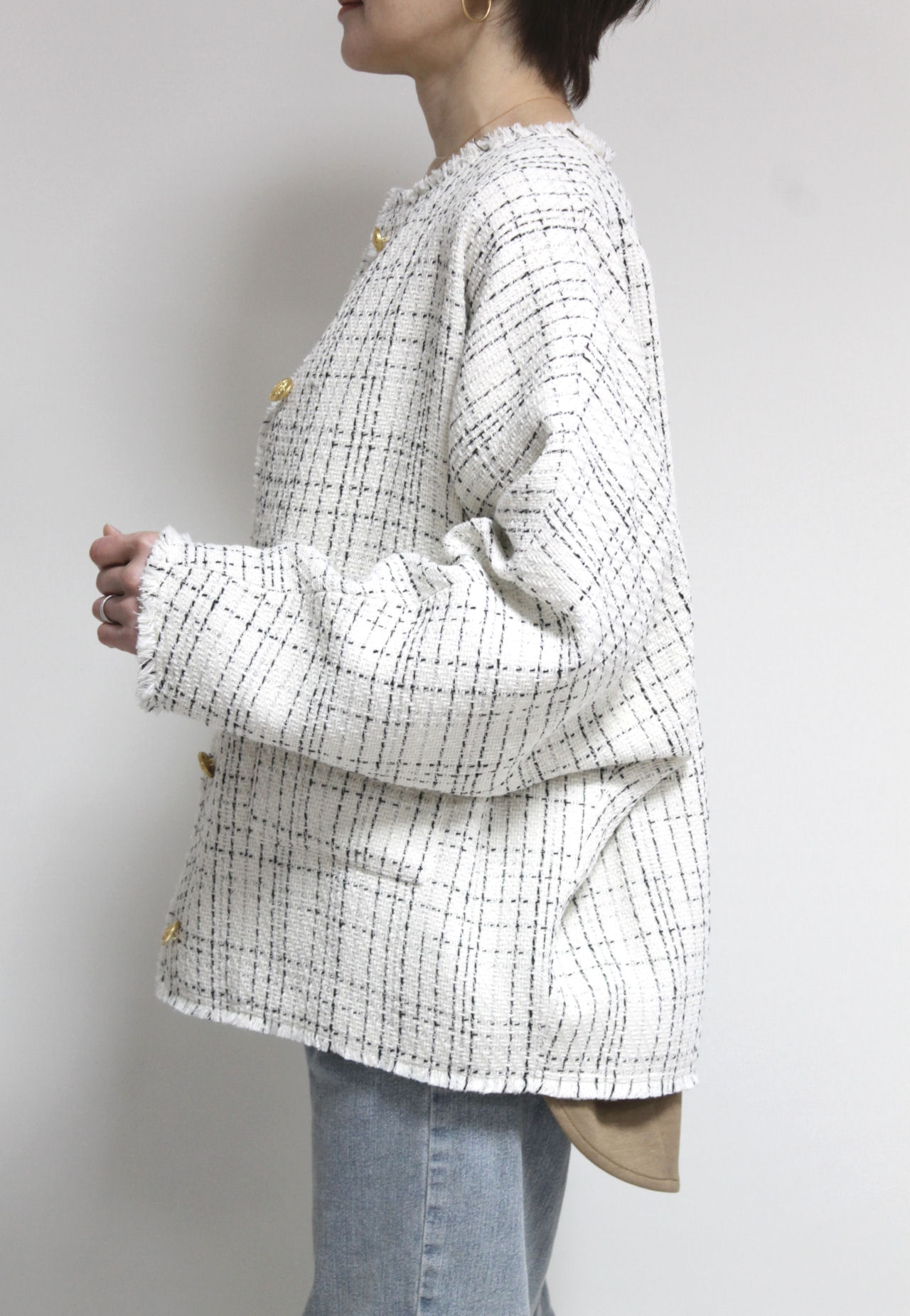 ↓↓何種類かの糸を組み合わせて仕上げたこだわりのツイードで金ボタンがアクセント。