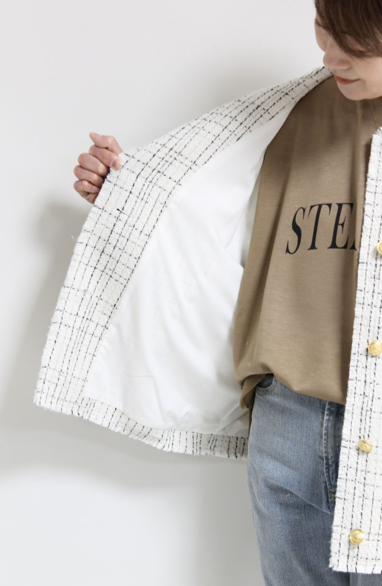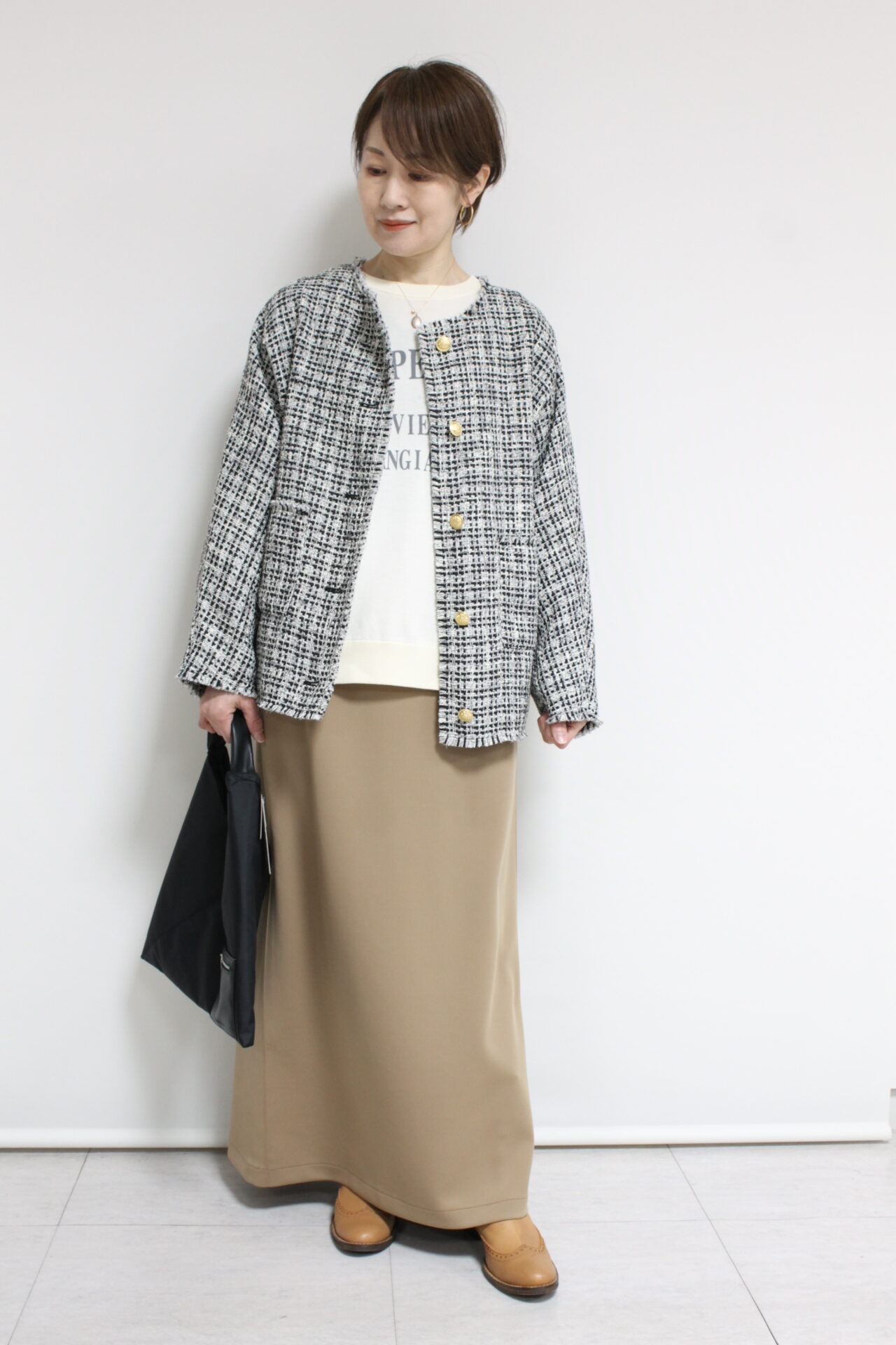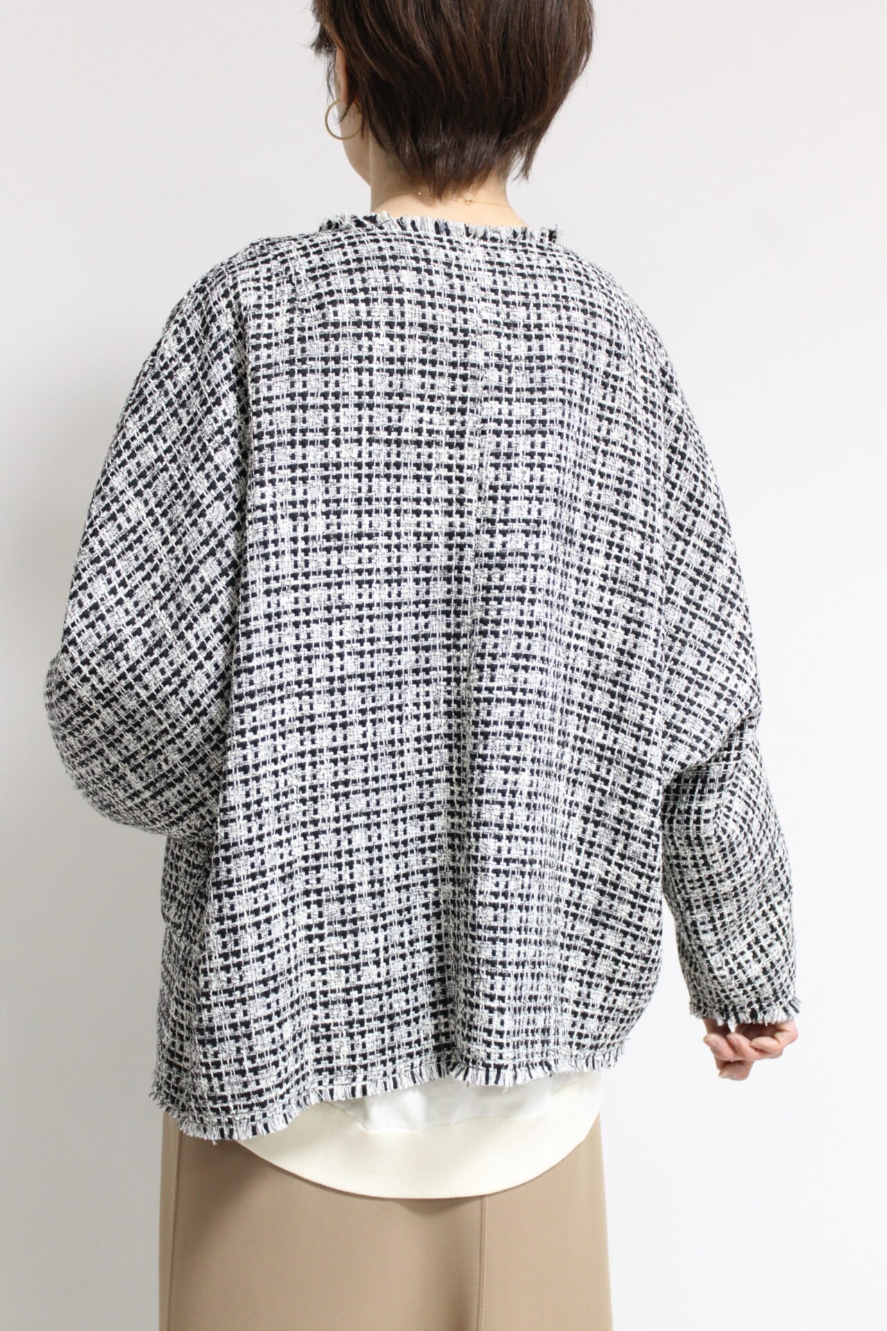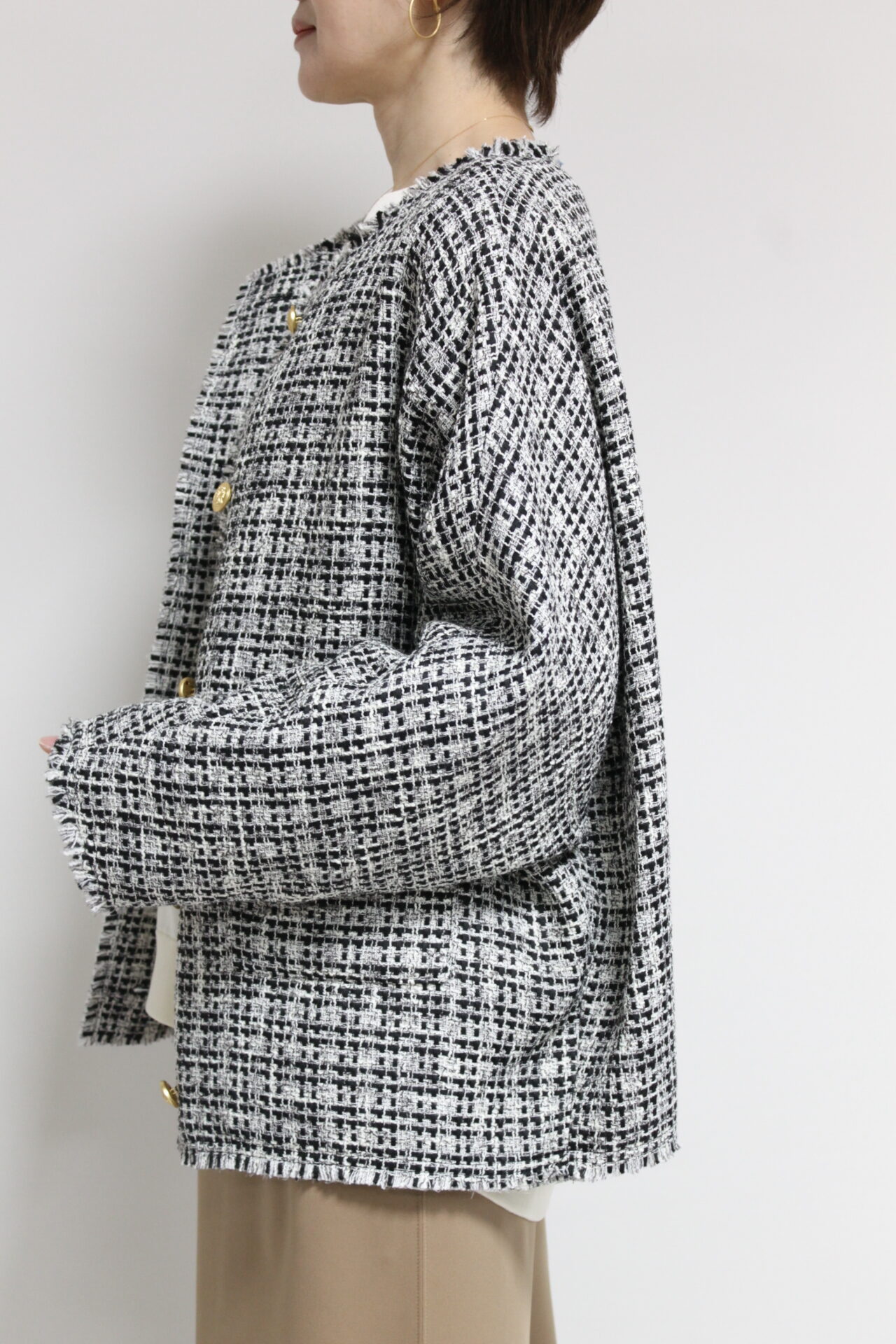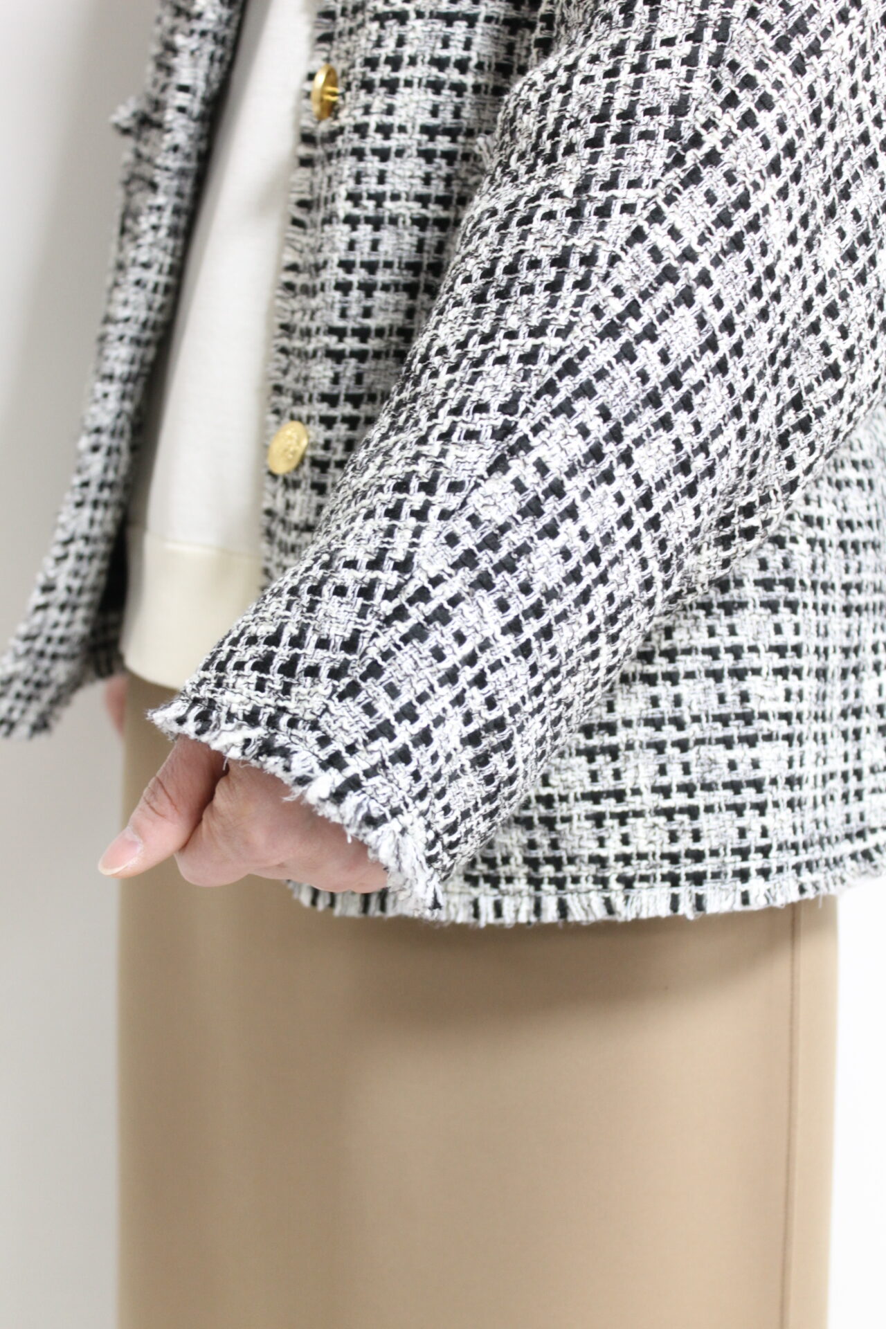 ↓↓ディニテコリエ(Dignite Collier)ツィードジャケットはオケージョンからオフスタイルにデニム合わせでカジュアルダウンさせるスタイリングもおすすめ。「ブラック」 18,900円(税込20,790円)ディニテコリエDignite Collier