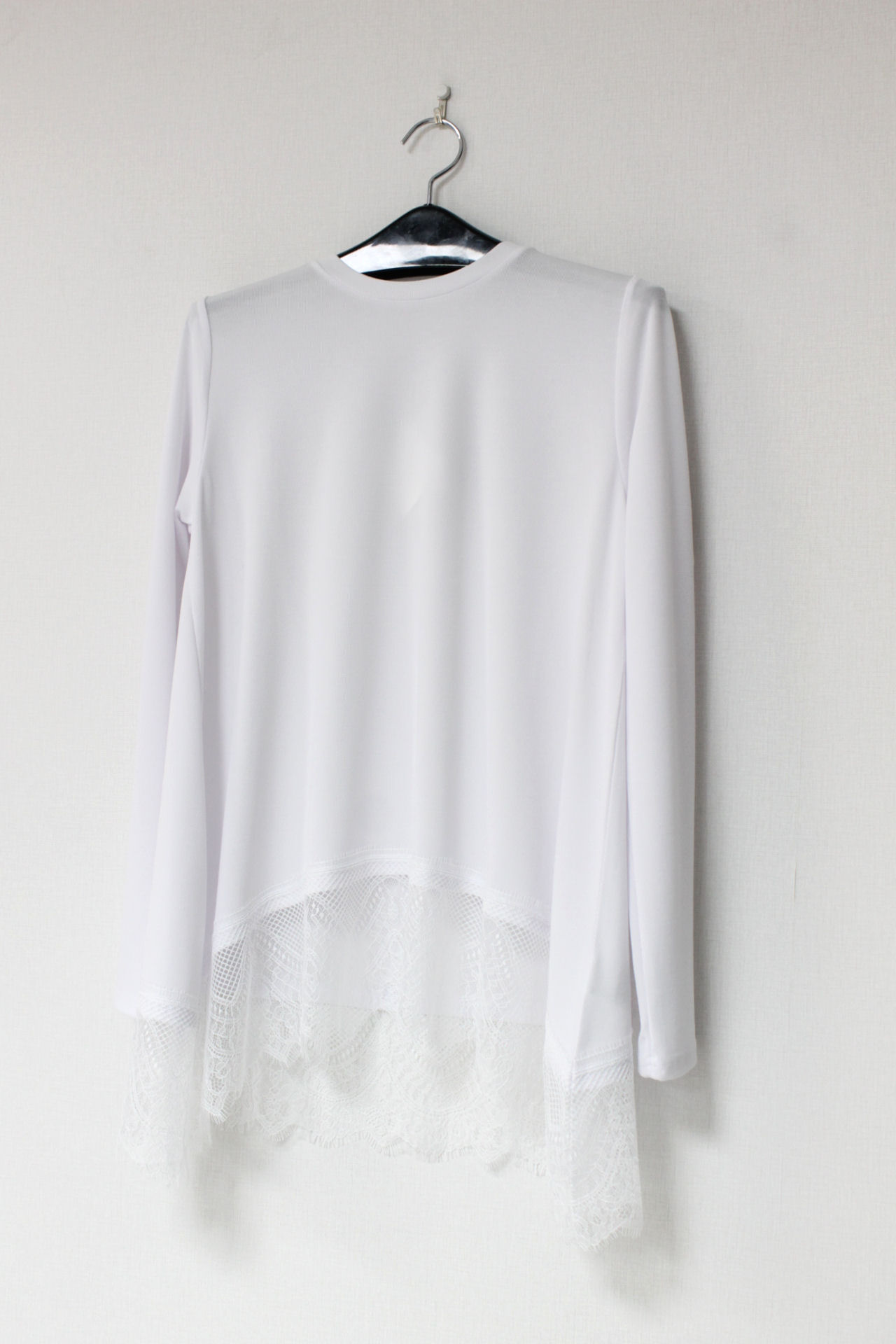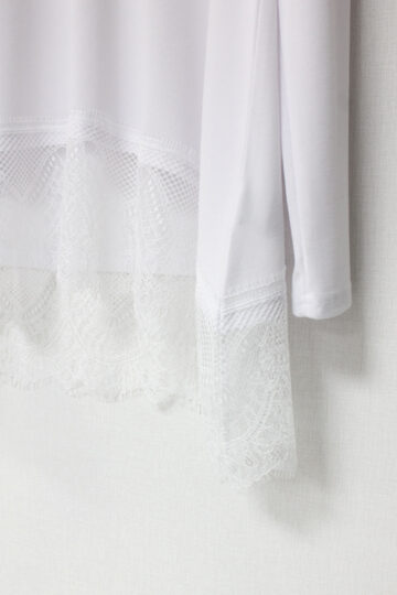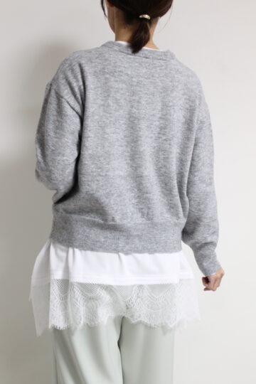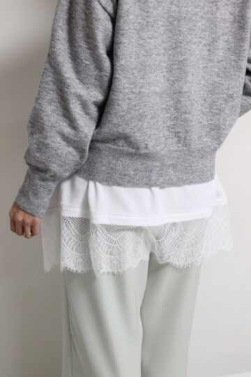 ↓↓【実は超人気】裾のレースがデザインポイントのプルオーバー。今シーズンはレイヤードスタイルに映える柔らかな色合いのオフホワイトをセレクト。裾に向かって広がる今年らしいAラインシルエット。動くたびにレースが揺れる軽やかな印象のアイテムです。11,000円(税込12,100円)ロージーROSIEE