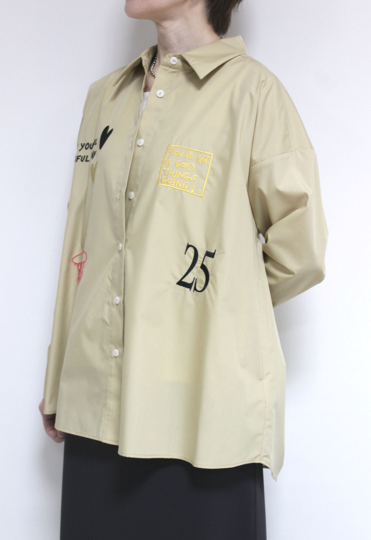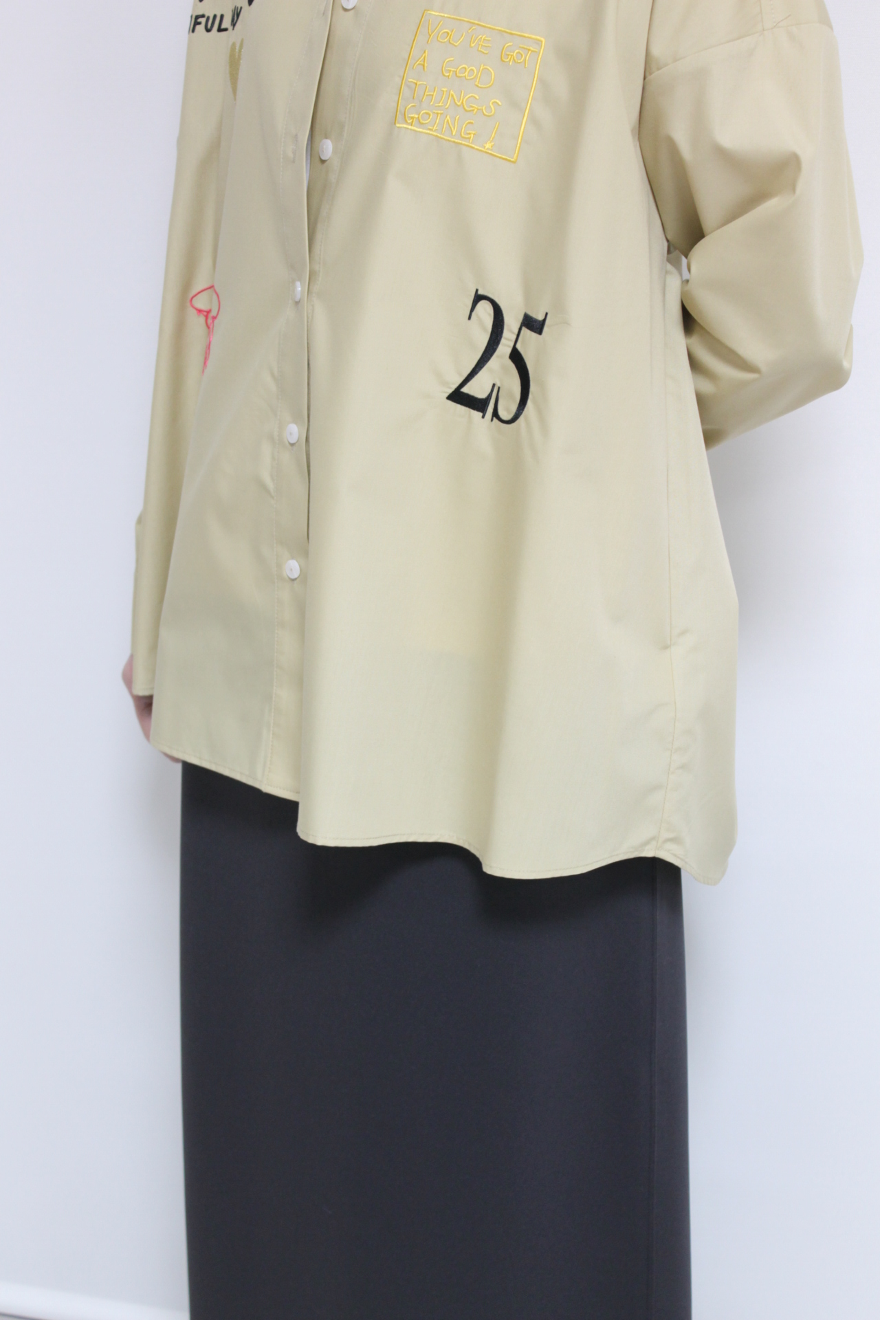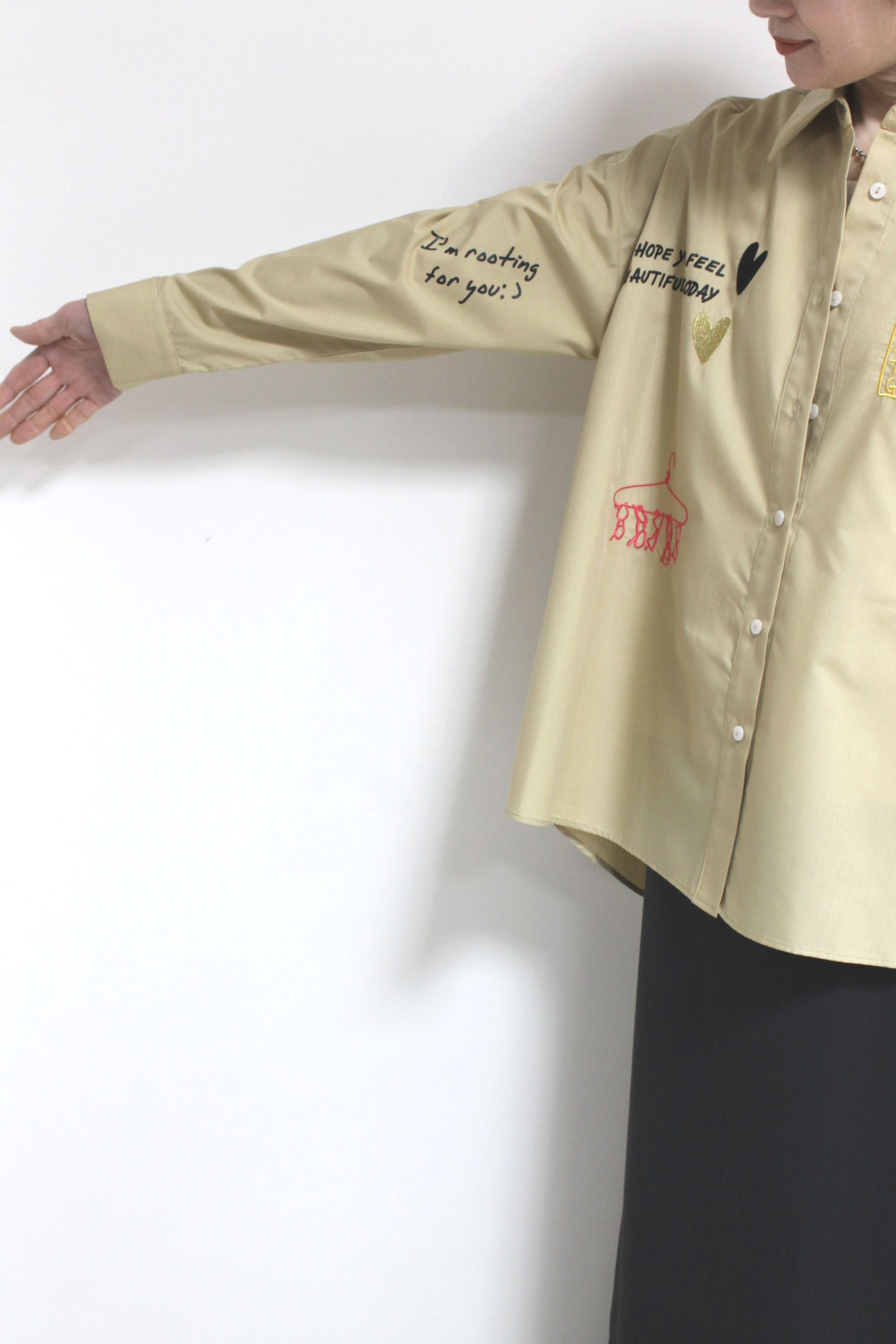 ↓↓秋から人気を集めている落書き風デザイン。前後にあしらわれた刺繍やプリントが目を惹く、ロージー(ROSIEE)のレタリング刺繍ブラウス。17,000円(税込18,700円)ロージーROSIEE