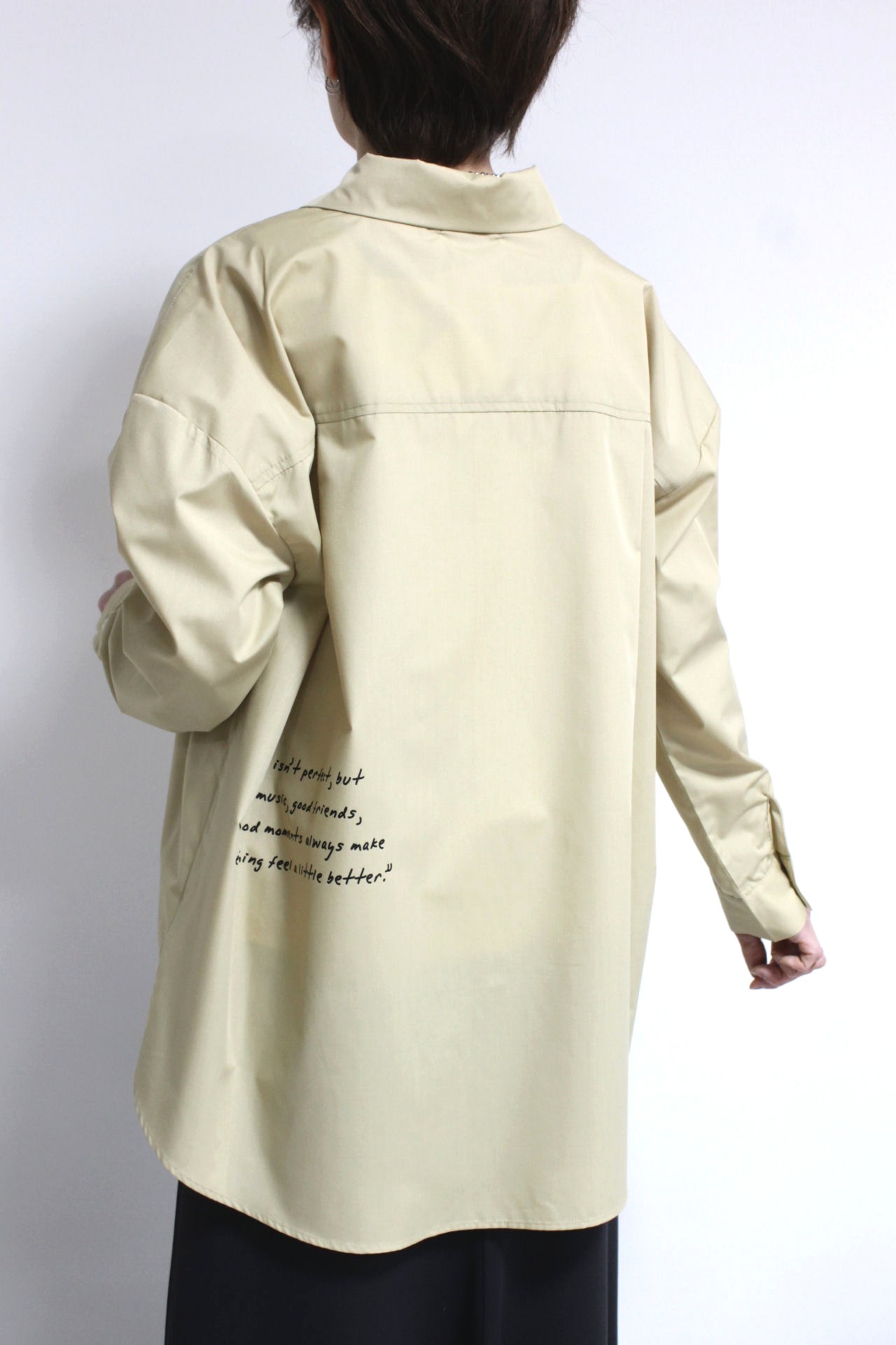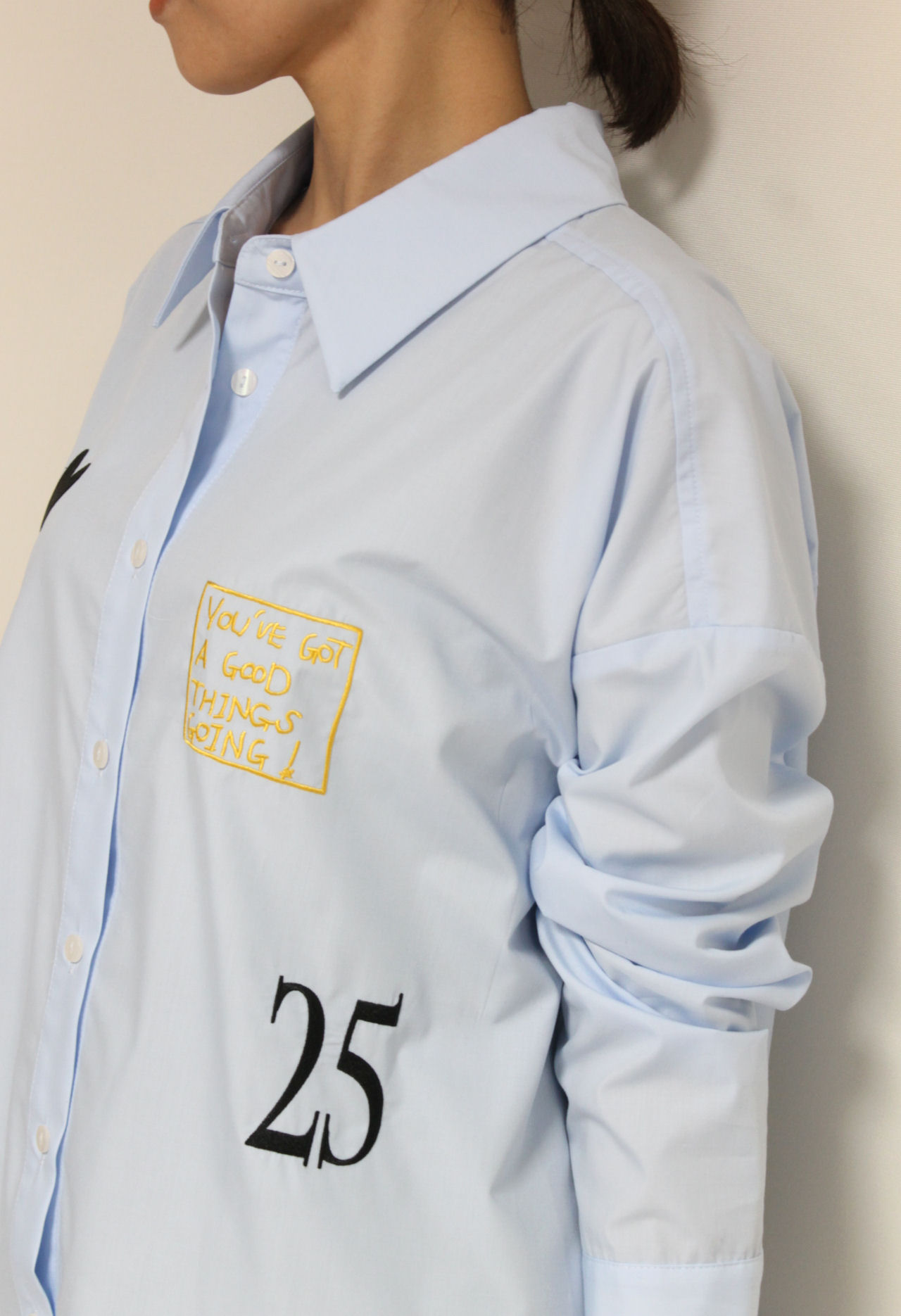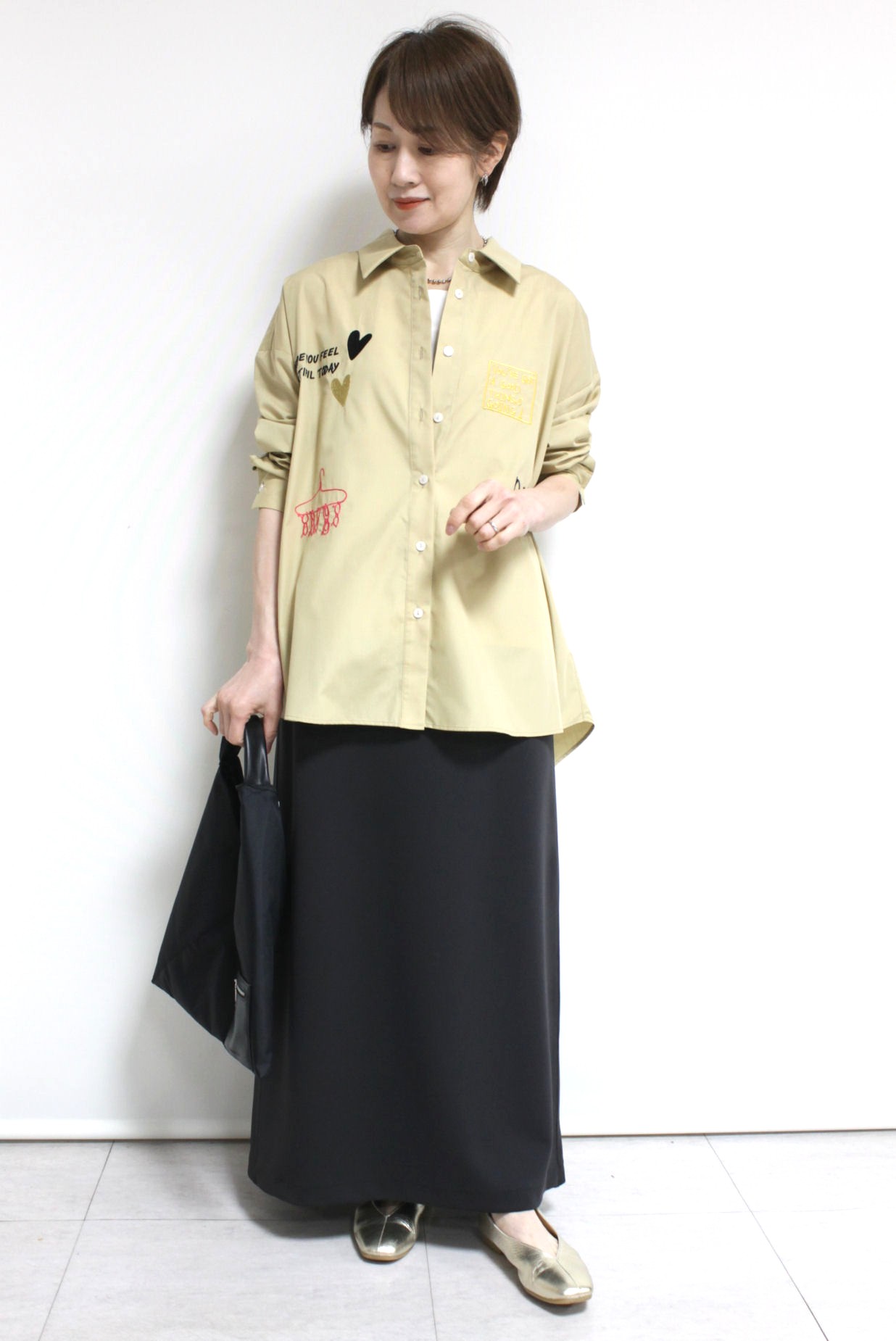 ↓↓秋から人気を集めている落書き風デザイン。前後にあしらわれた刺繍やプリントが目を惹く、ロージー(ROSIEE)のレタリング刺繍ブラウス。17,000円(税込18,700円)ロージーROSIEE