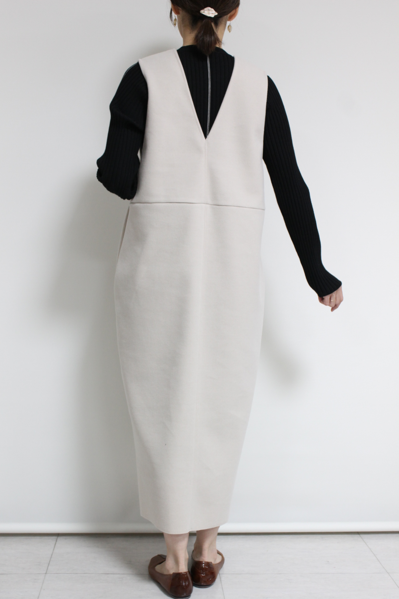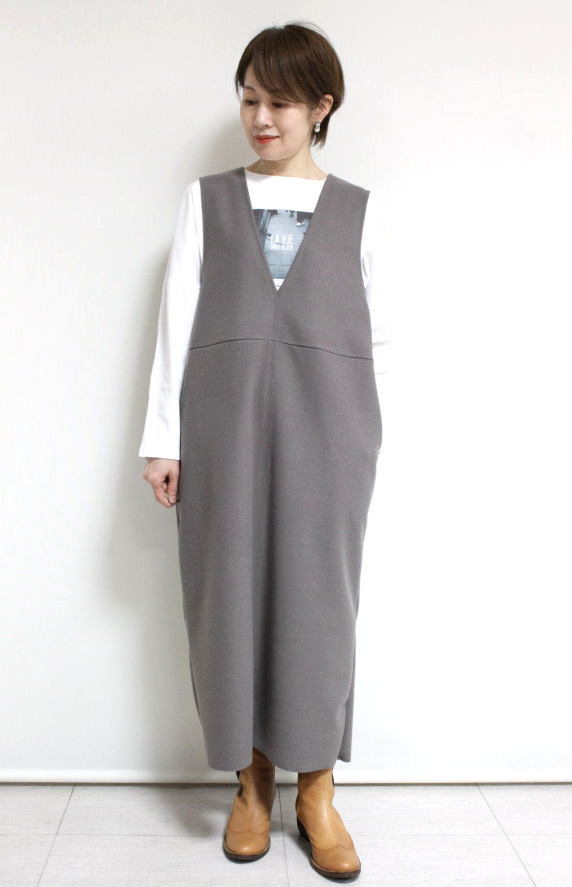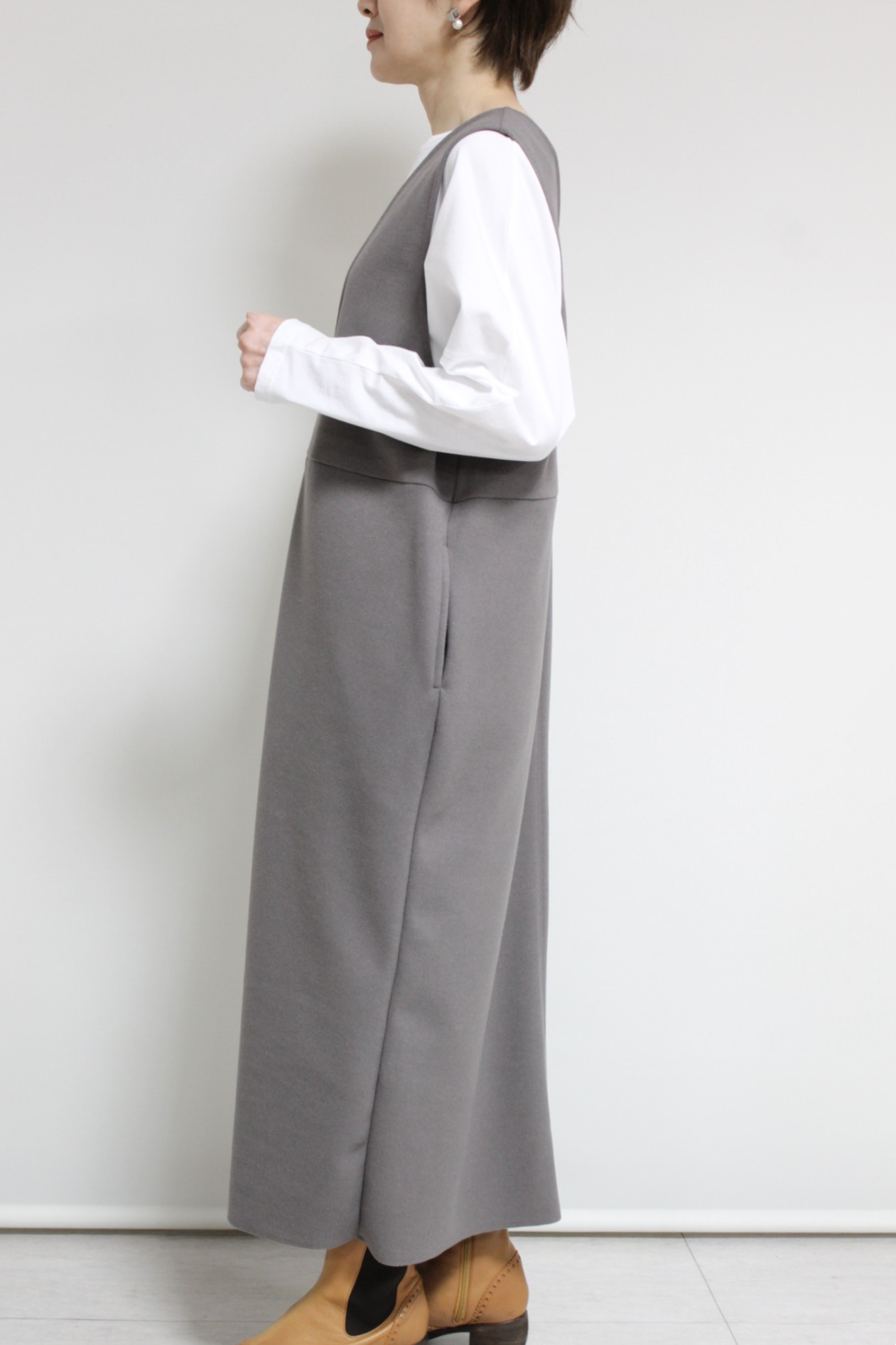 ↓↓着るだけでサマになるディニテコリエ(Dignite collier)ウーリージャージワンピースが入荷しました。ニットやカットソー、ブラウスなど、いろんなインナーが使えシンプルで着やすいジャンバースカートです◎「ライトベージュ」 15,000円(税込16,500円)ディニテコリエDignite collier