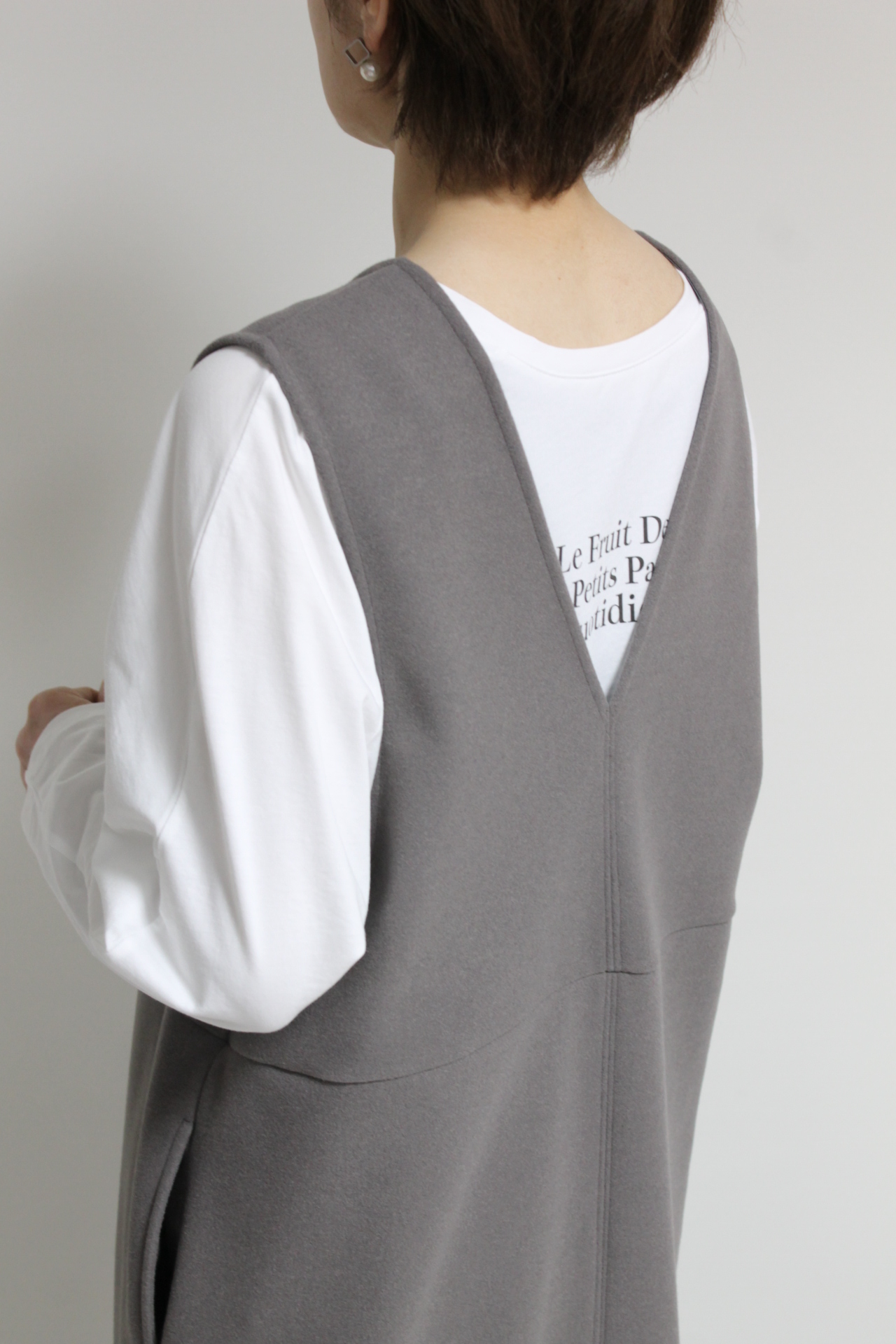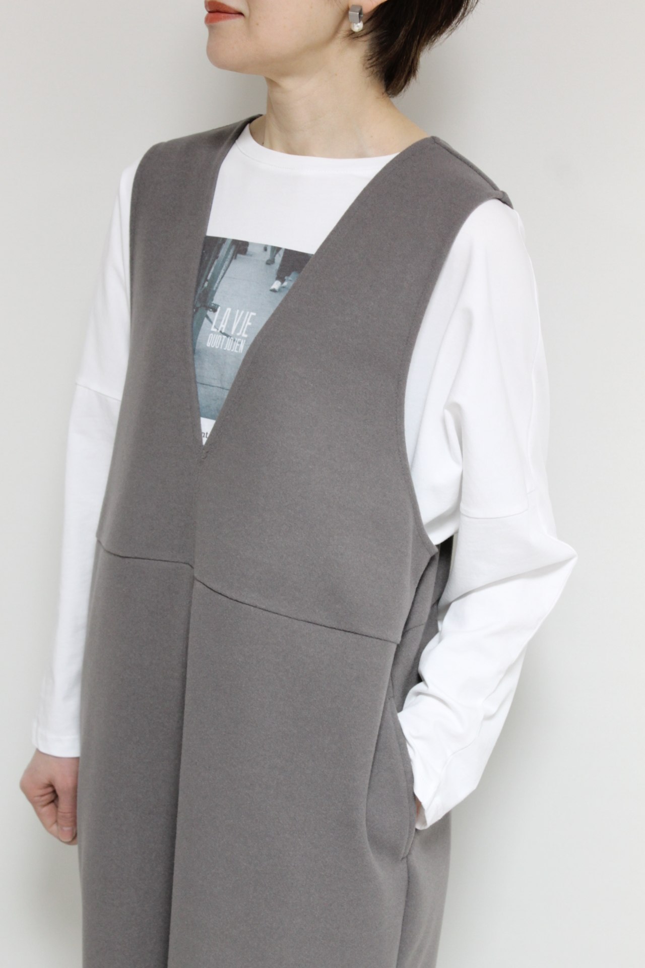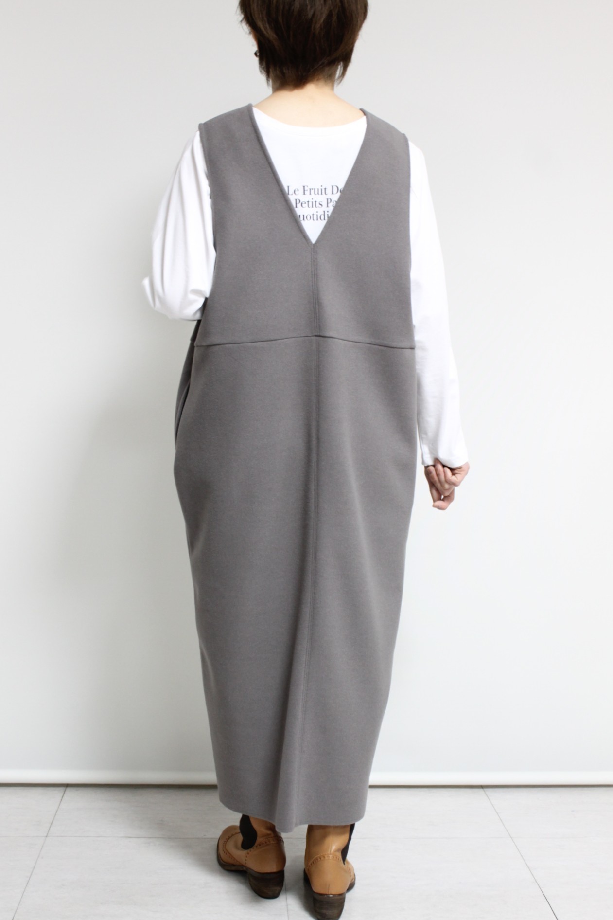 ↓↓スタイルアップして見える縦長のコクーンラインシルエット。「グレー」15,000円(税込16,500円)ディニテコリエDignite collier