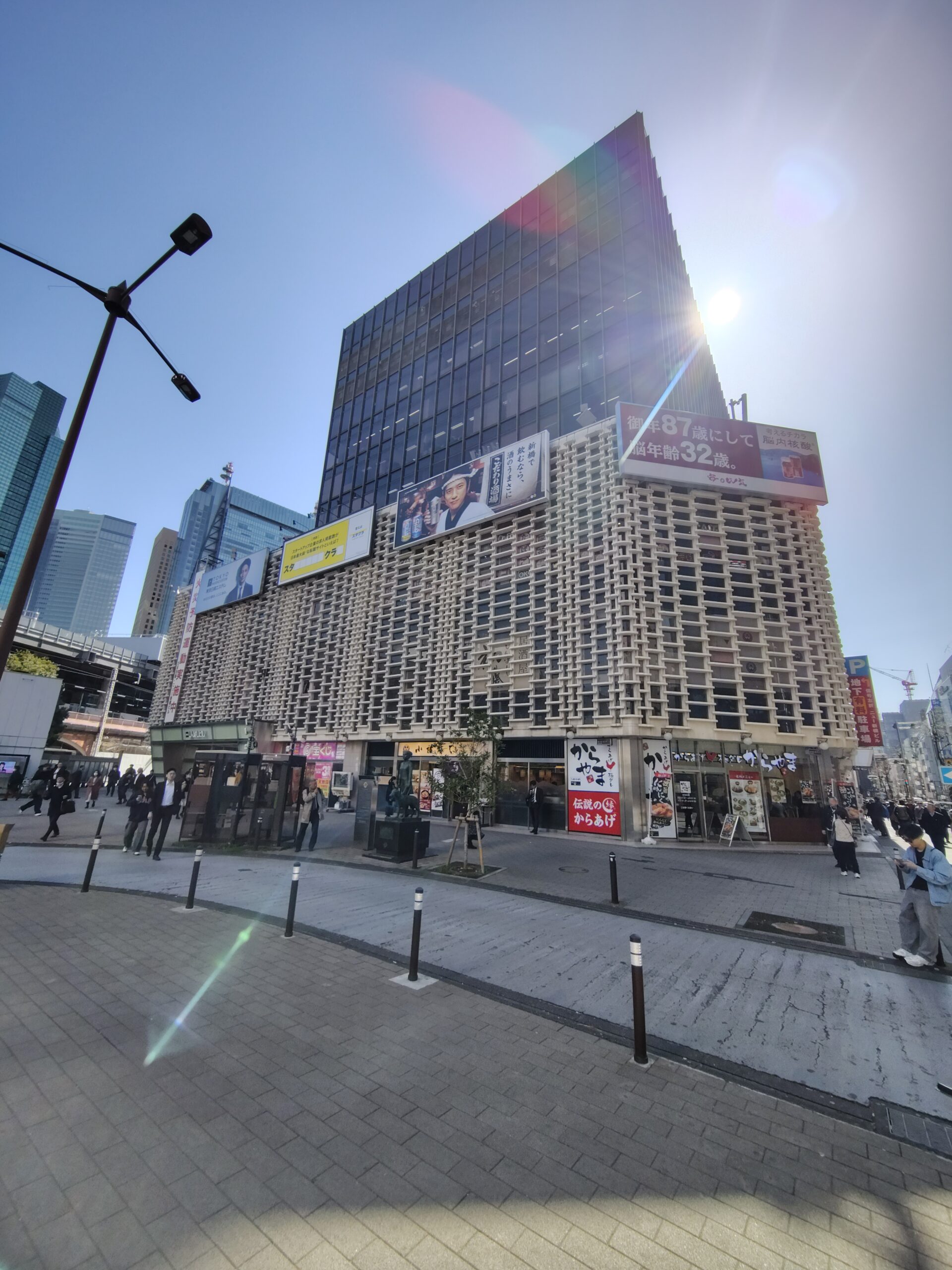 都内は再開発でどんどん洗練されたガラス張りの高層ビルが増えて行くのに、新橋駅の真ん前にあるこのビルだけは少し色あせたまま立っています(昭和46年竣工)。