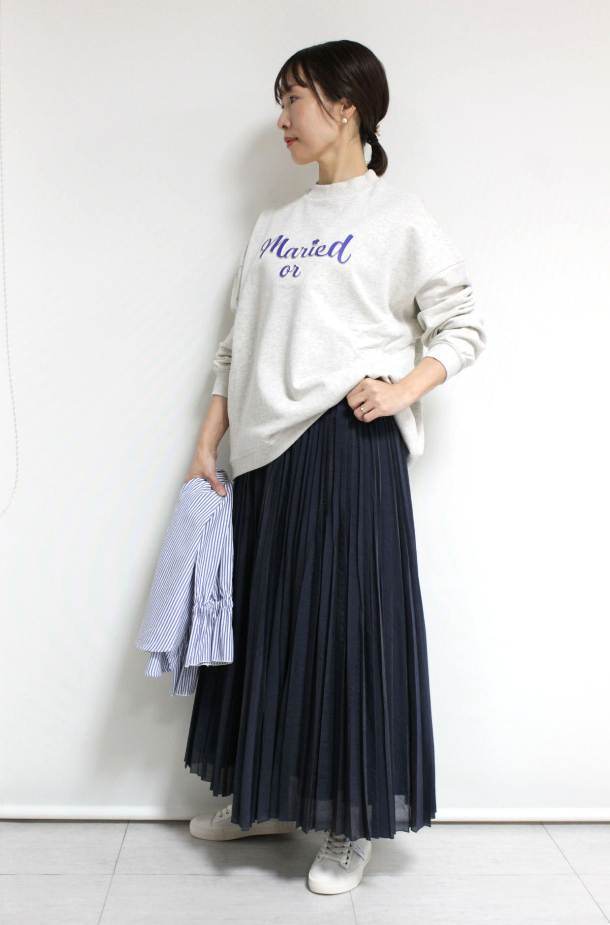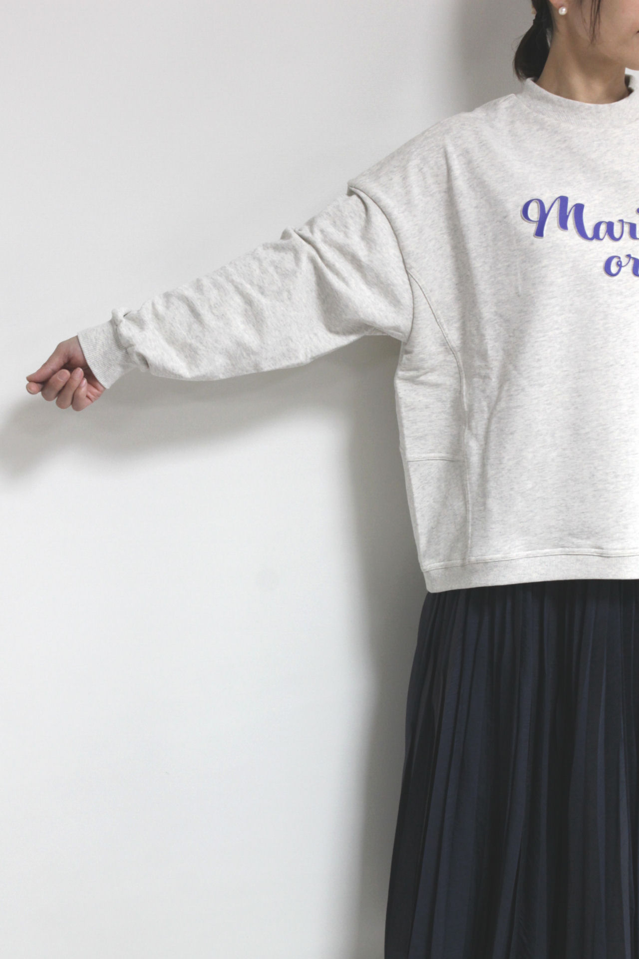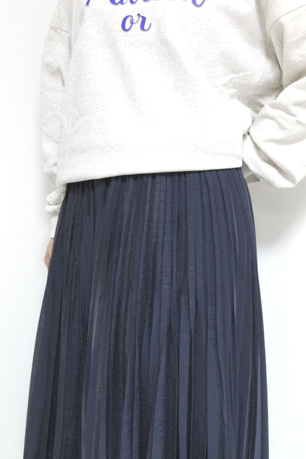 ↓↓ロゴスウェット+プリーツスカートで抜け感コーデはいかがでしょう?ふんわりと揺れるシルエットが魅力。ディニテコリエ(Dignite Collier)のランダムプリーツスカートは細かいプリーツが自然な陰影をつくり、広がりすぎないシルエットで大人っぽい仕様になってます。14,800円(税込16,280円)ディニテコリエDignite Collier