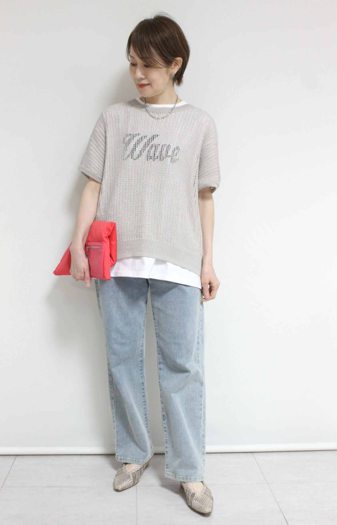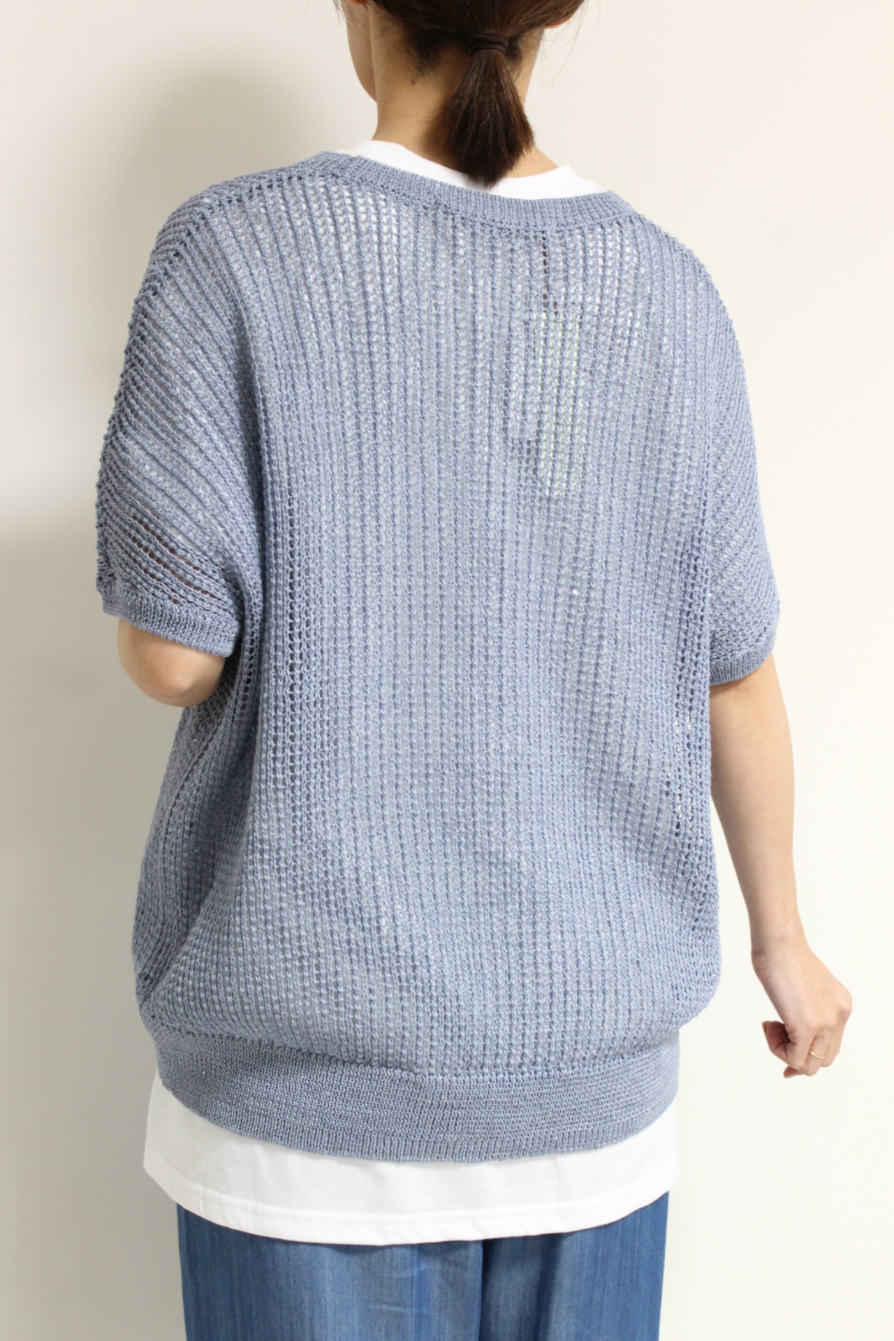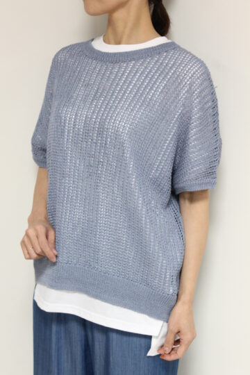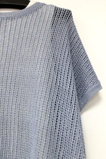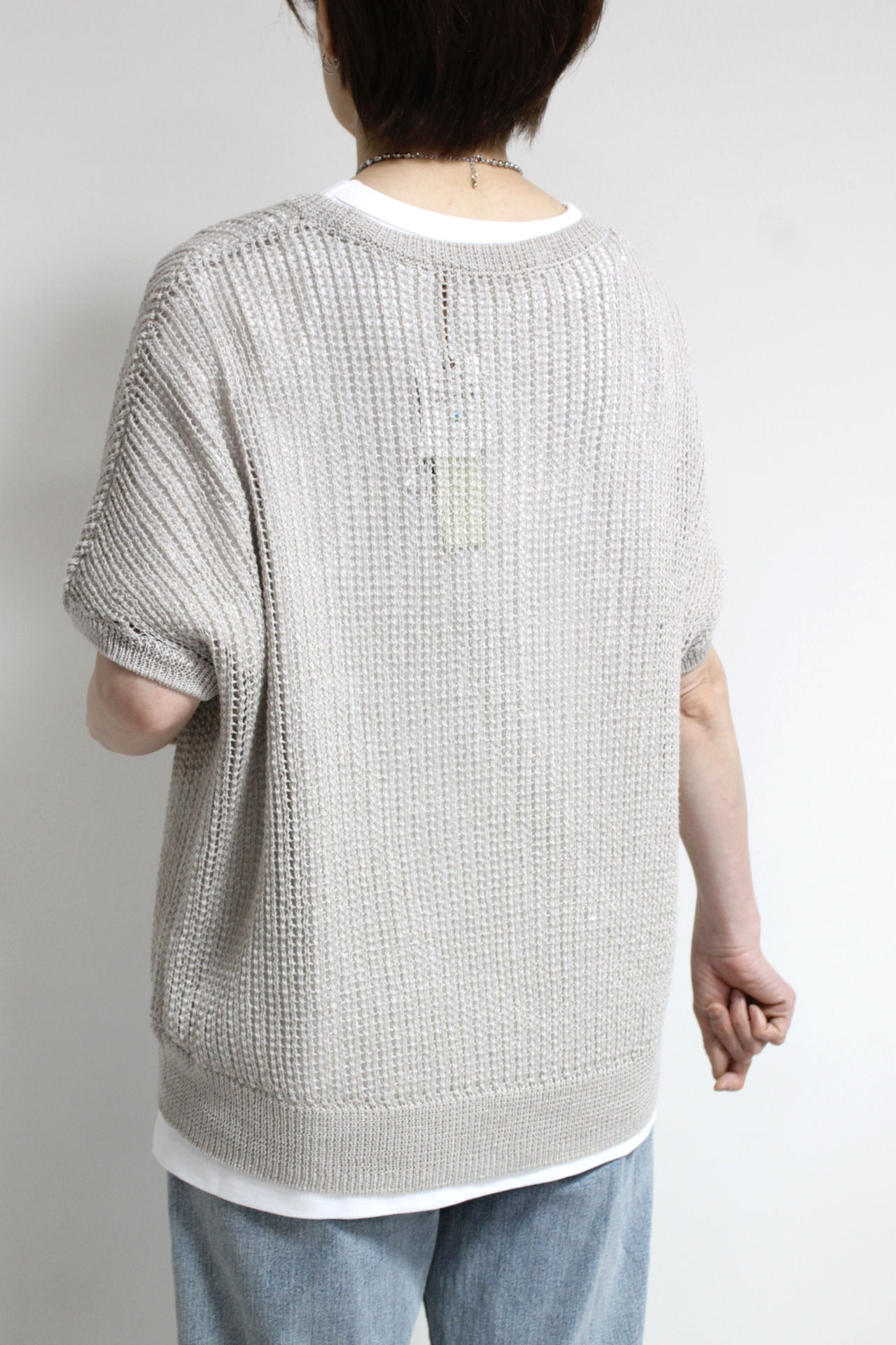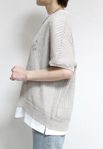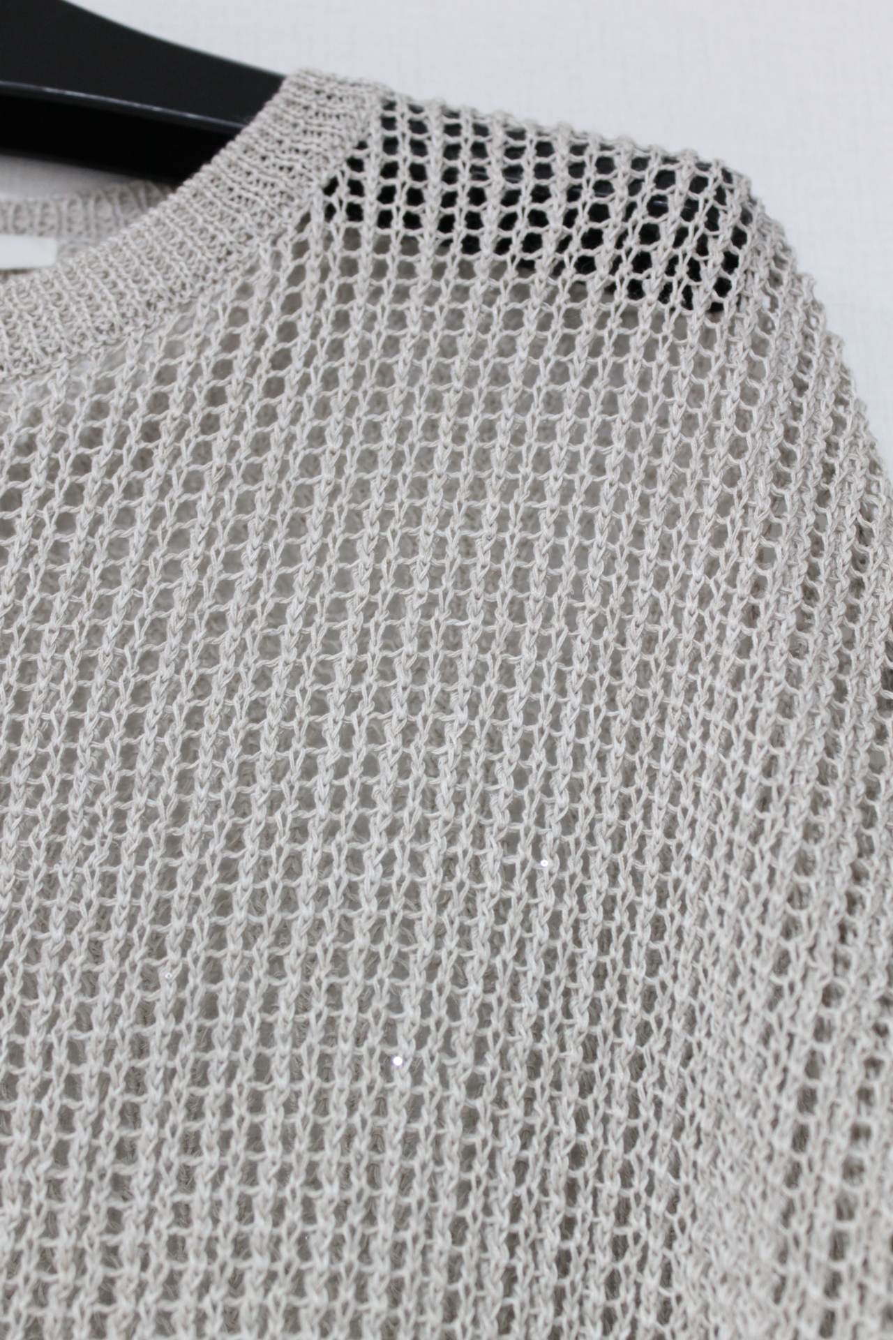 ↓↓軽やかな抜け感のある編み地に、直径1mmほどの小さなスパンコールをさりげなく縫い付けた上品な一枚。光を受けてほのかにきらめく表情が美しく、キラキラしすぎない大人の華やかさを演出します。