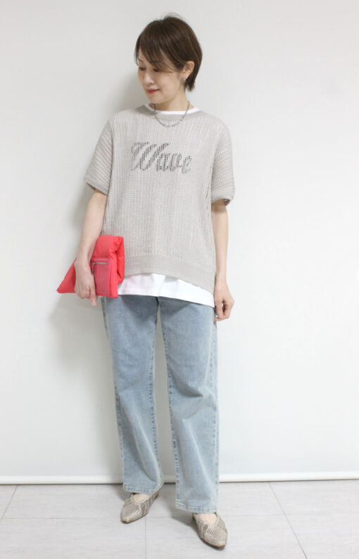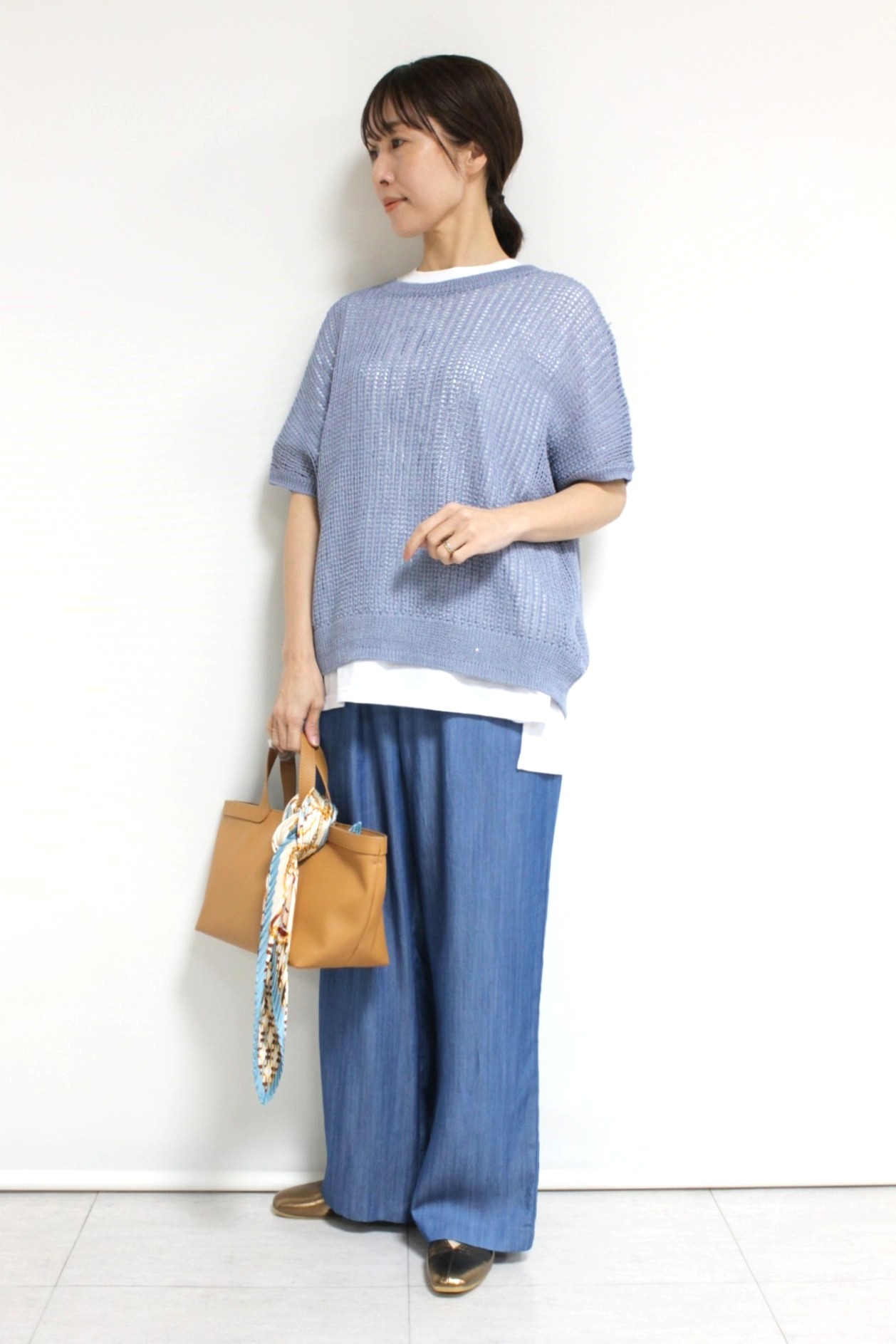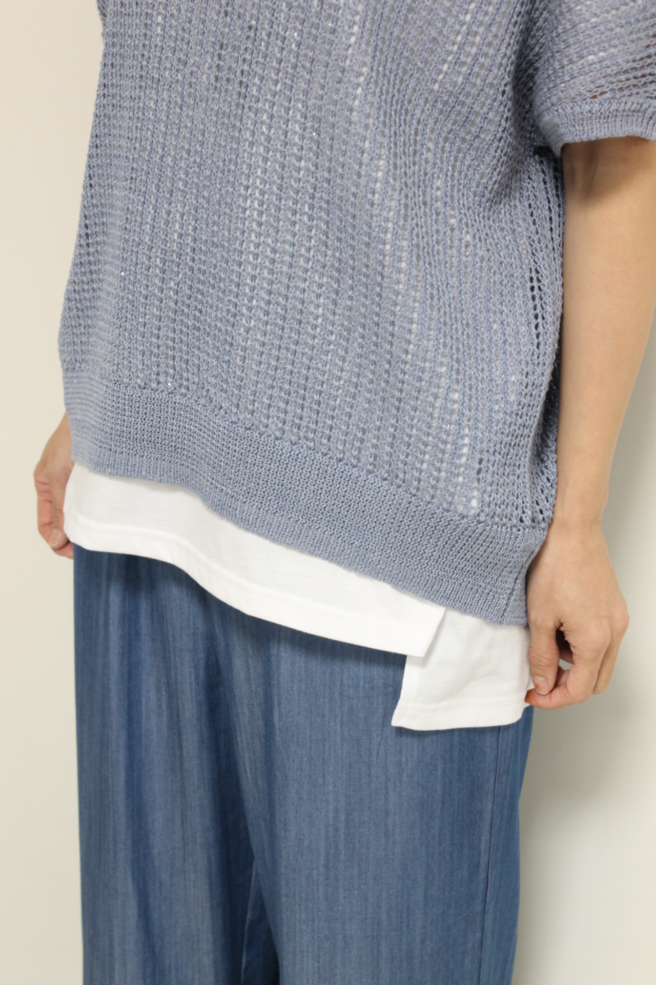 ↓↓アンカルネ(Un carnet)の透かし編みベスト。Tシャツやシャツに重ねるだけで、いつものコーデをぐっと今年らしく見せてくれる主役級ベストです☆ 「ブルー」9,800円(税込10,780円)/テンセルデニムイージーパンツ12,000円(税込13,200円)共にアンカルネUn carnet/Tシャツ8,900円(税込9,790円)アンナケリーAnna Kerry
