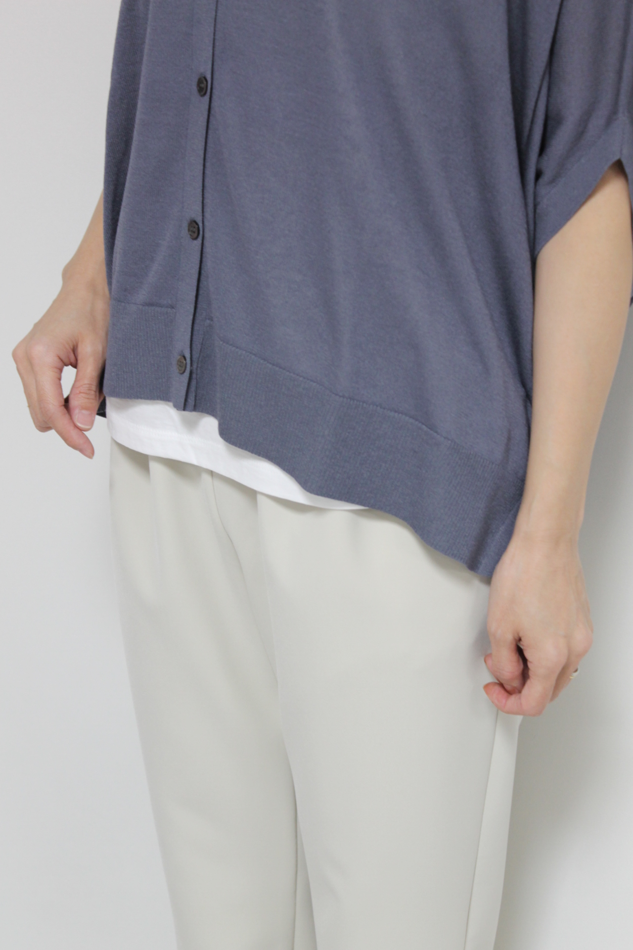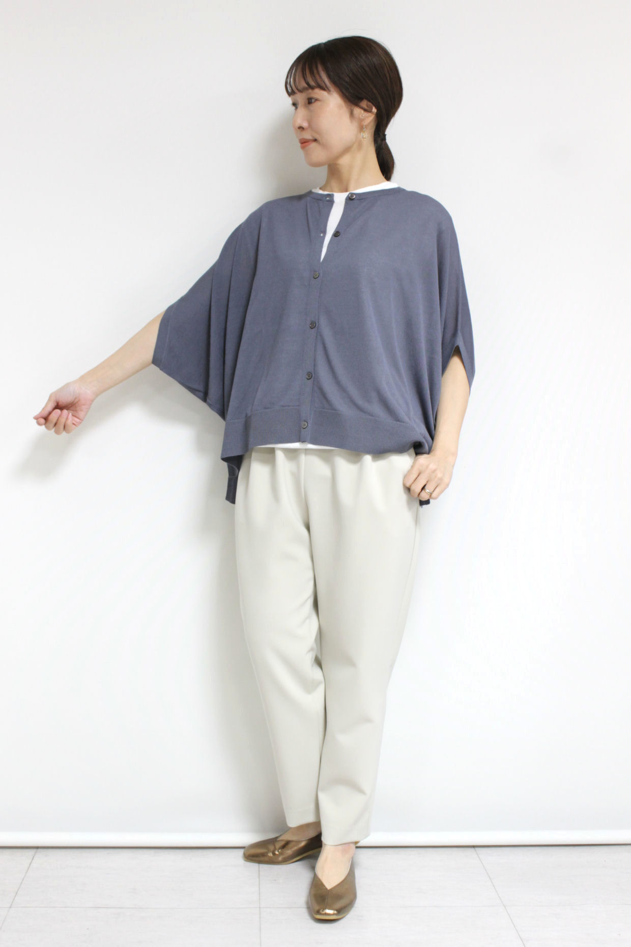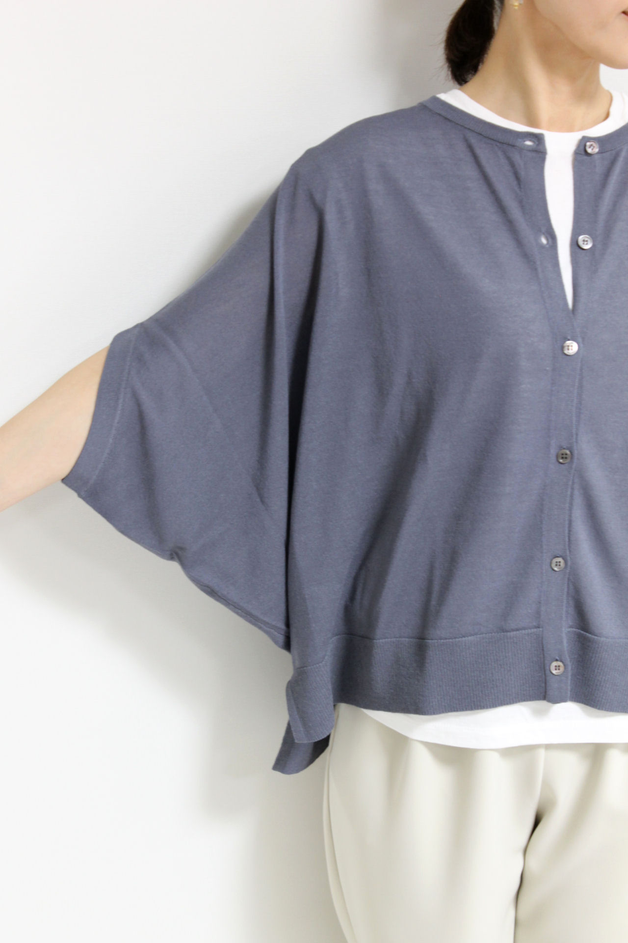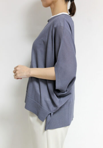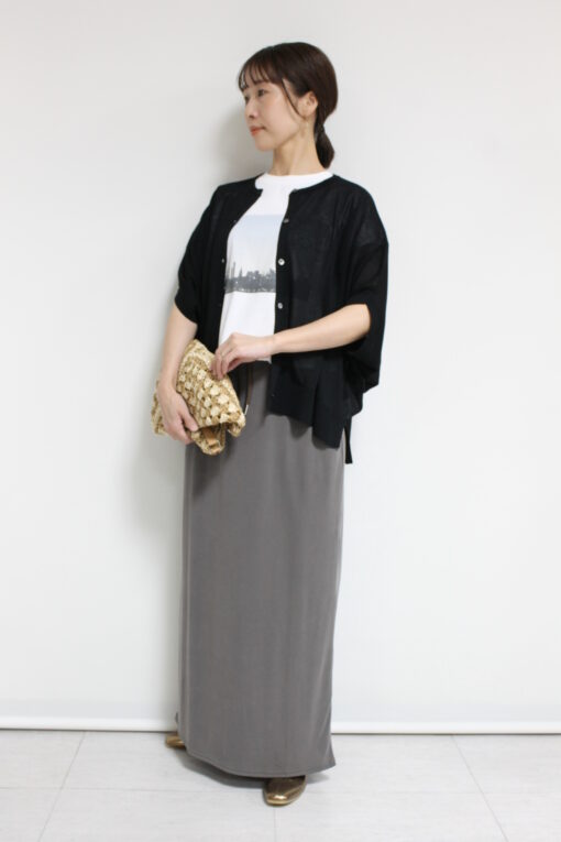 ↓↓ゆったりとしたシルエットが肩や腕まわりを自然にカバーし、軽やかな素材感で抜け感のある着こなしに。