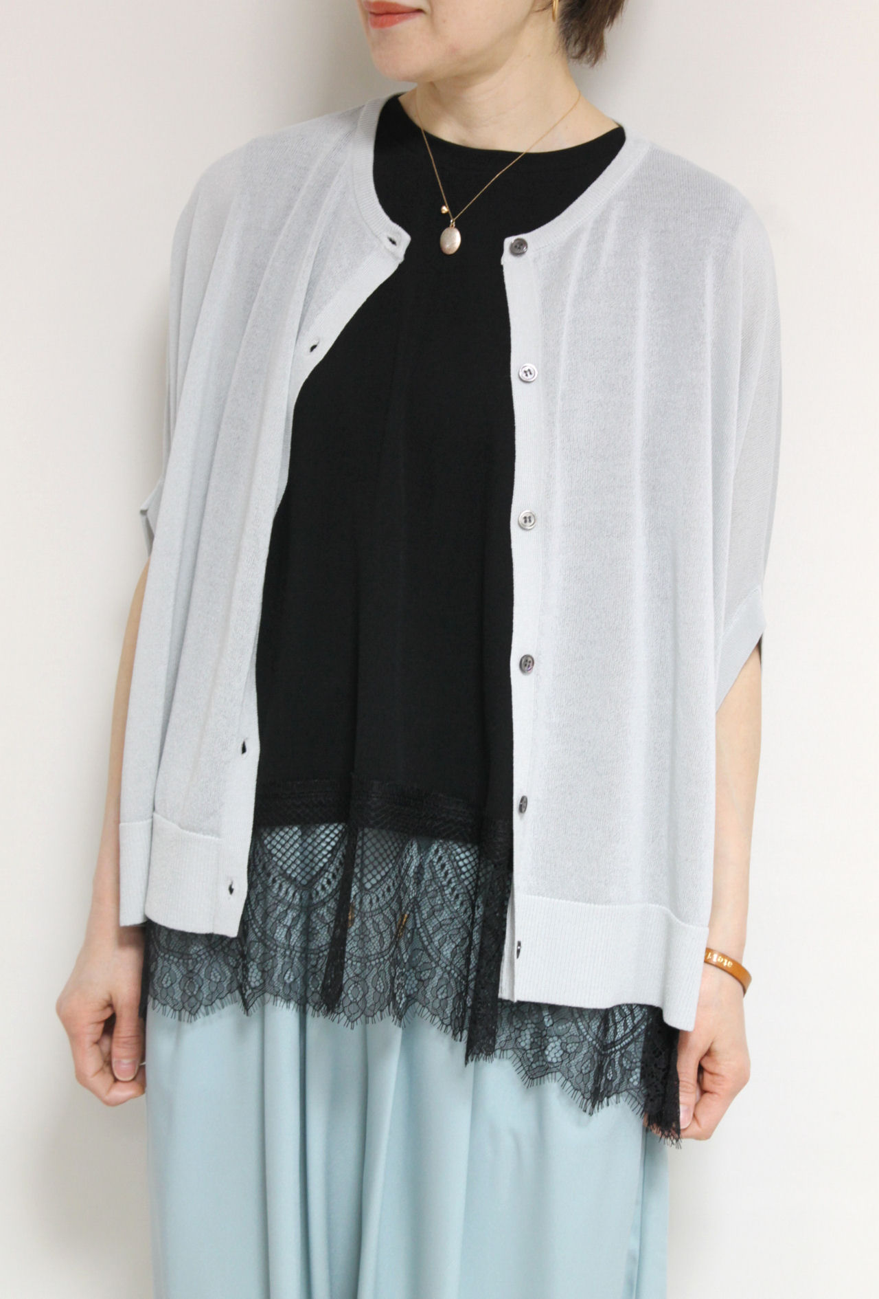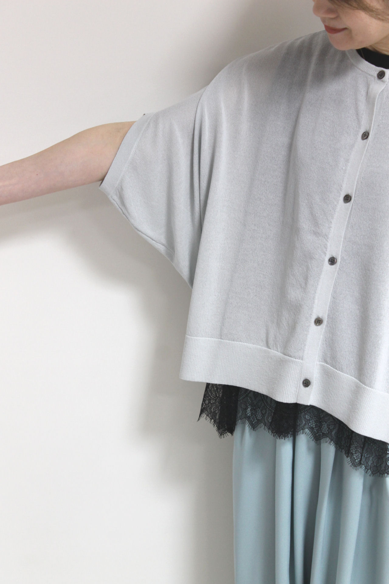 ↓↓前開き仕様で羽織りとしても活躍しレースインナーとのレイヤードも好相性。