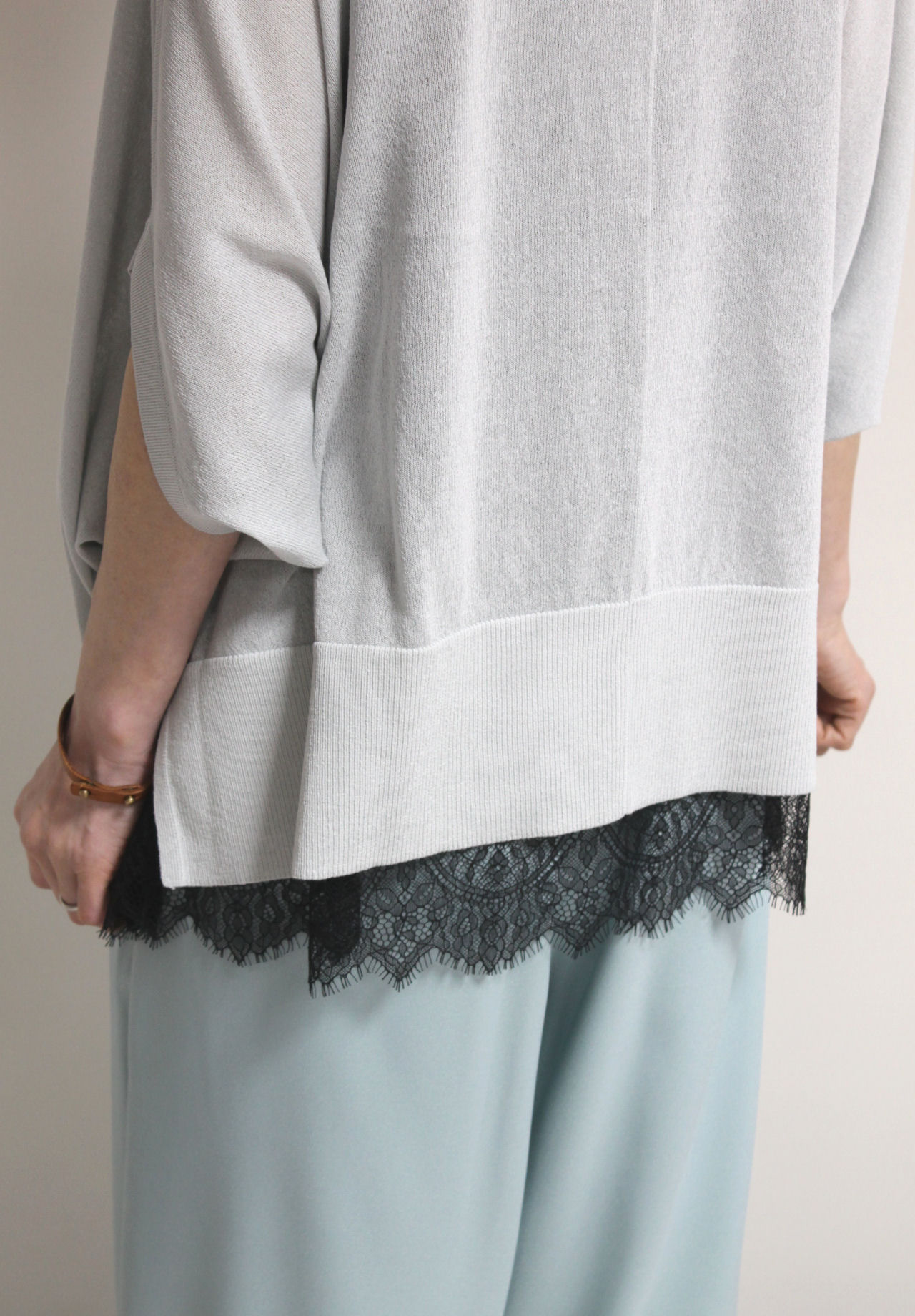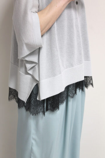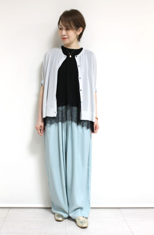 ↓↓淡いグレーなら軽やかで上品な印象に。白やベージュでやさしくまとめても黒で引き締めてもバランスよく決まります。「ライトグレー」 13,000円(税込14,300円)シュガーローズSugar Rose/レースキャミソール7,900円(税込8,690円)アンカルネUn carnet