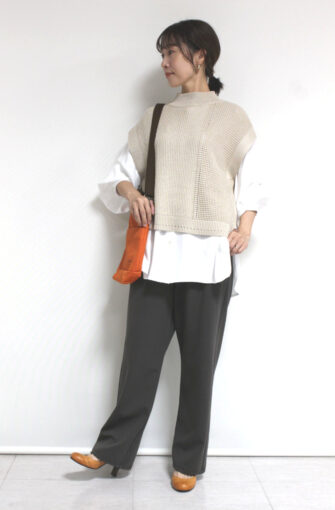 表情ある編地と適度なサイズ感がクラシックな印象・・コムアンファム (comme une femme)編地切替ハイネックベスト。フロントの左右でリブ編みとワッフル編みで切り替わってます。軽やかで肌触りが良く、ご家庭での洗濯が可能なのもうれしいポイント。 合わせるインナーで着こなしの幅が広がるアイテムです☆