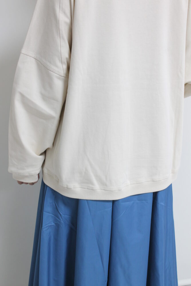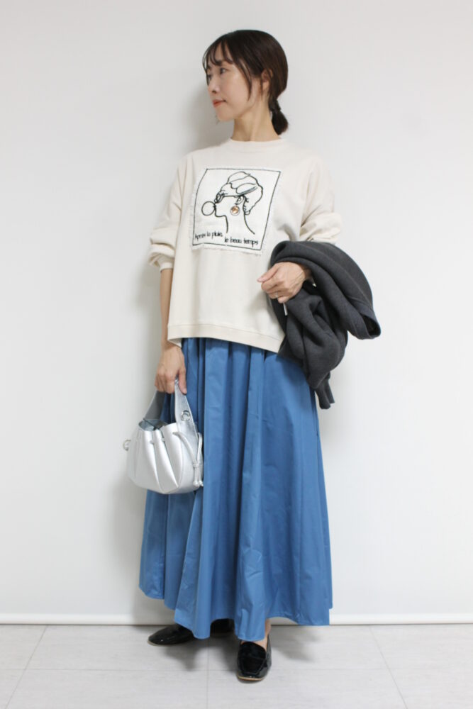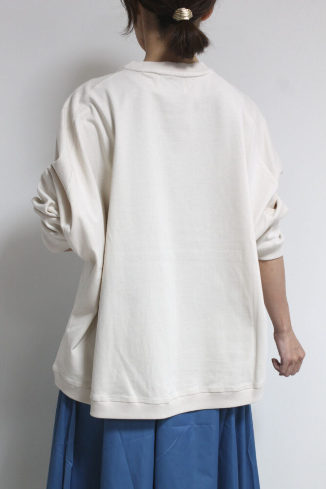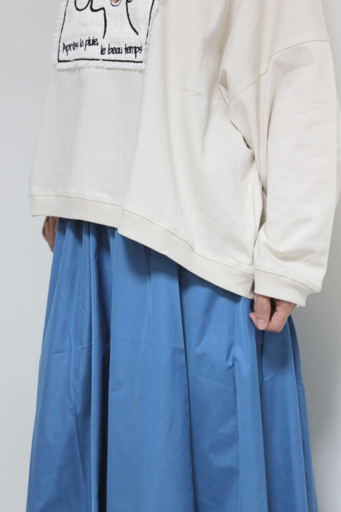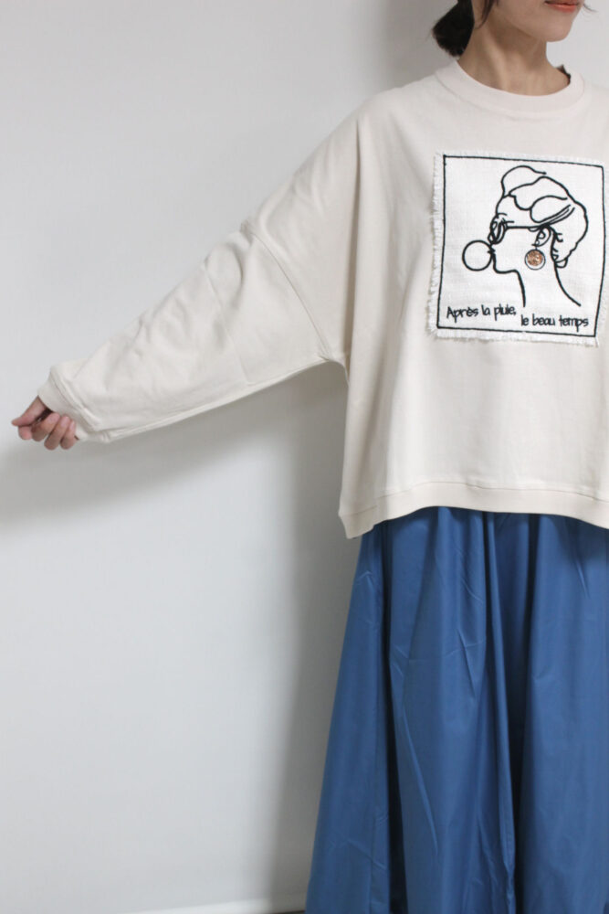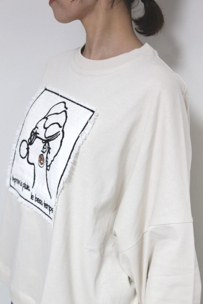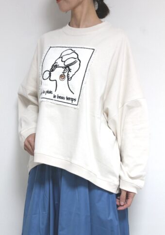 マリードール(MARIED'OR)の人気シリーズ☆ 刺繡貼り付け身幅ワイドプルオーバー。身体のラインを拾わないワイドな身幅、しっかりした生地感で長いシーズン着られます。胸元はツィード生地に女性の後ろ姿が刺繍されたチャーミングなデザインです。