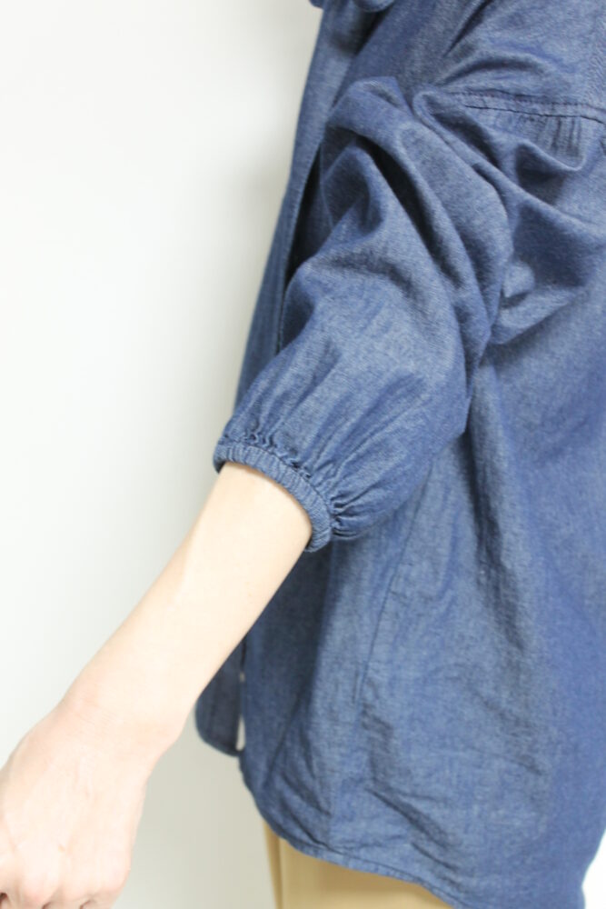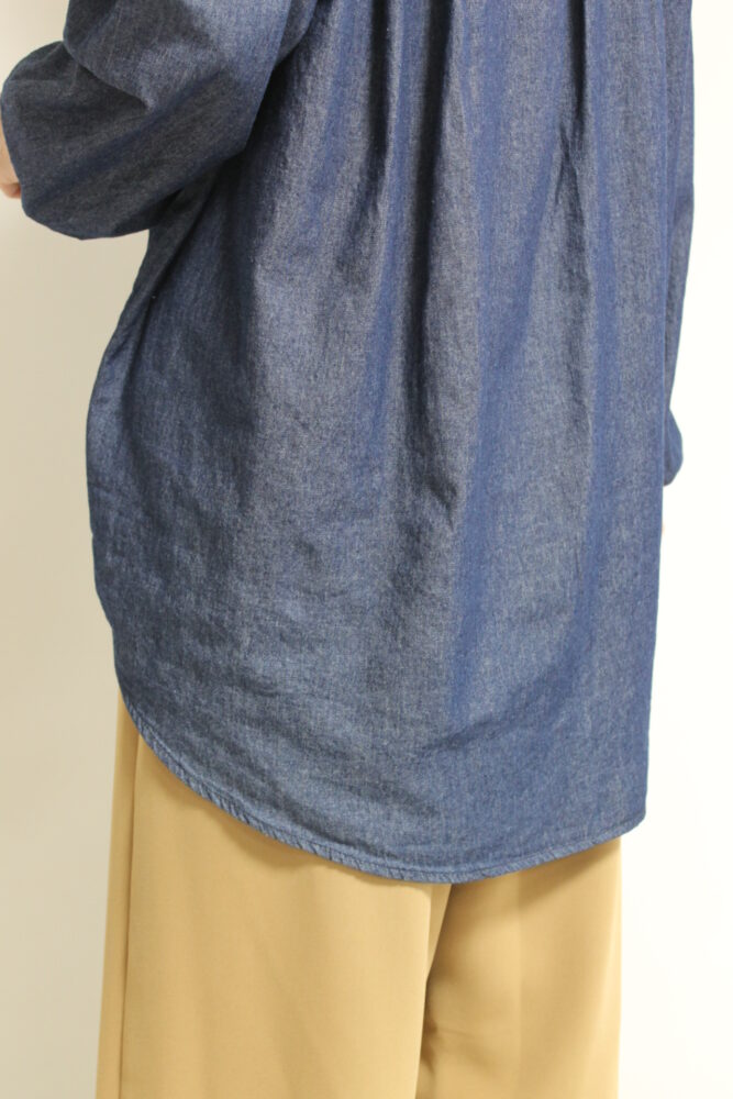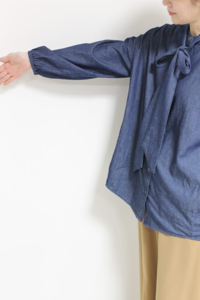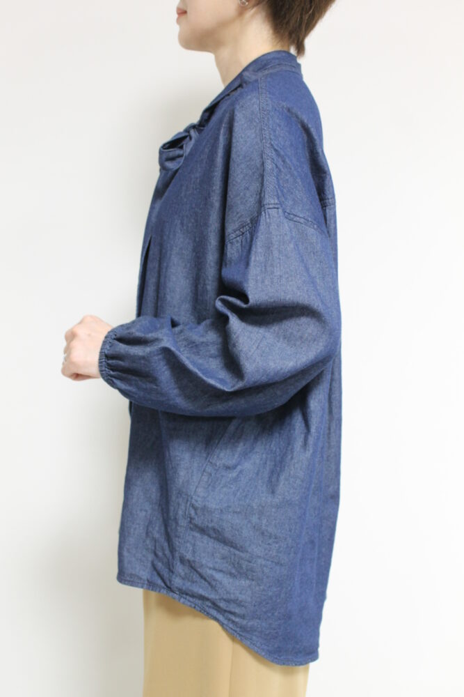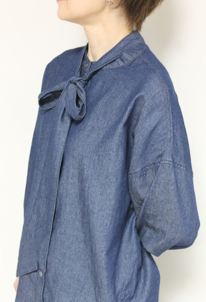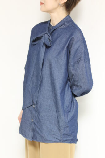 ボウタイディテールがフェミニンな要素をプラスするディニテコリエ(Dignite Collier)ライトデニムブラウス。ボウタイは衿後ろのボタンで取り外すことが出来るのでシンプルなデニムシャツとしても着ていただけます。袖はゴム仕様でプッシュアップも楽々◎