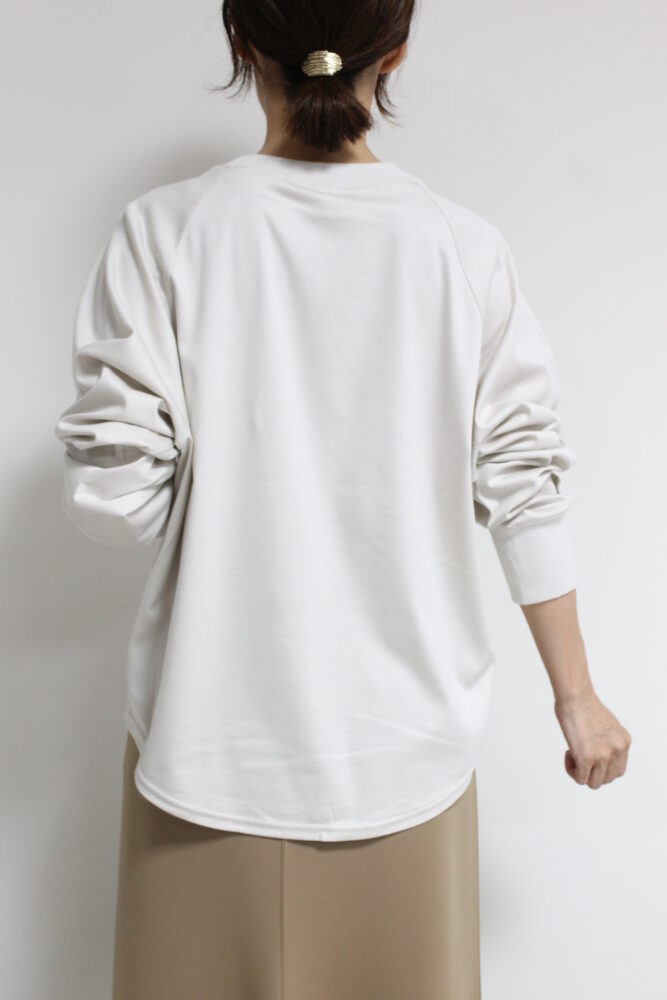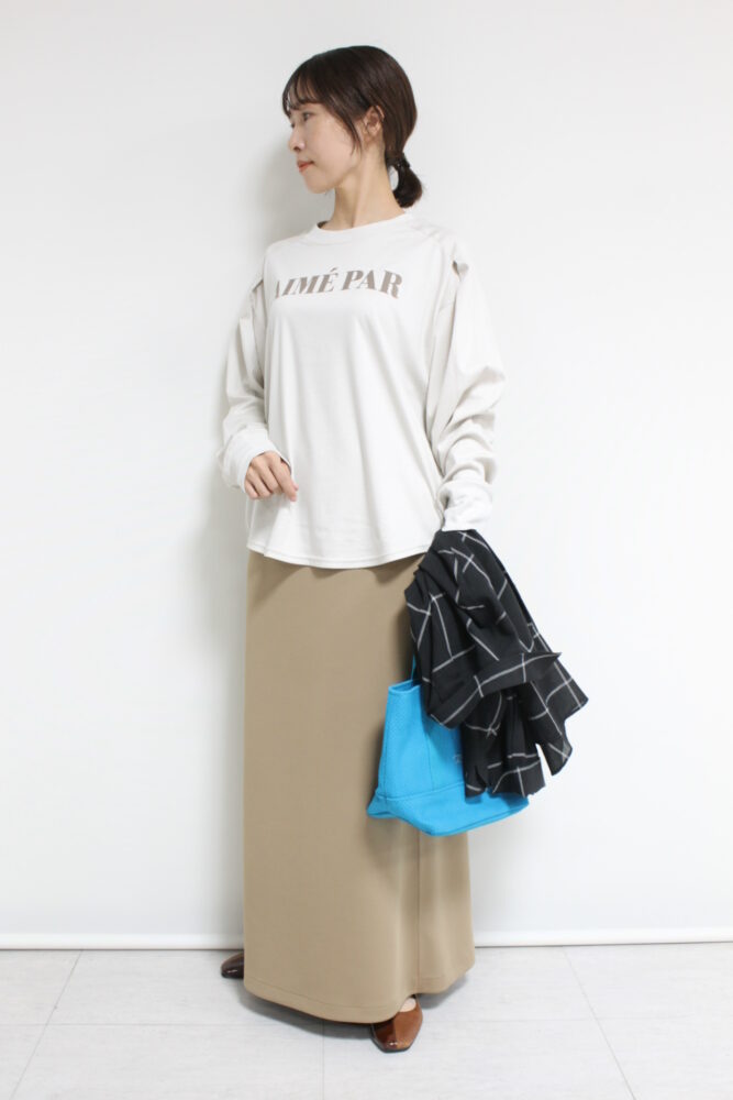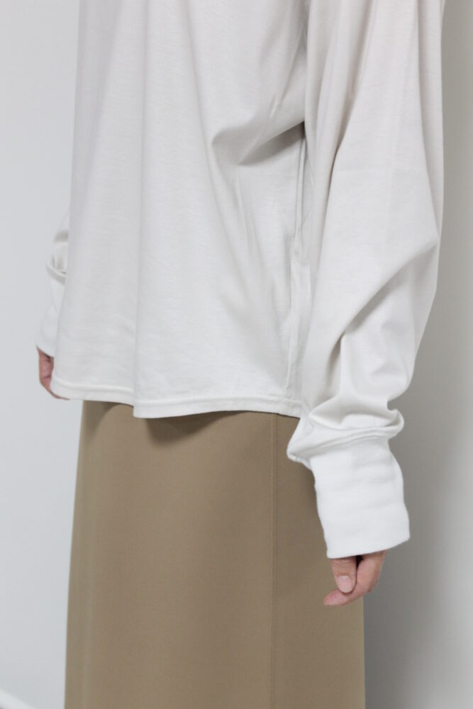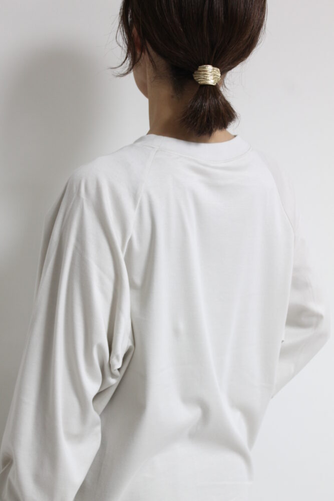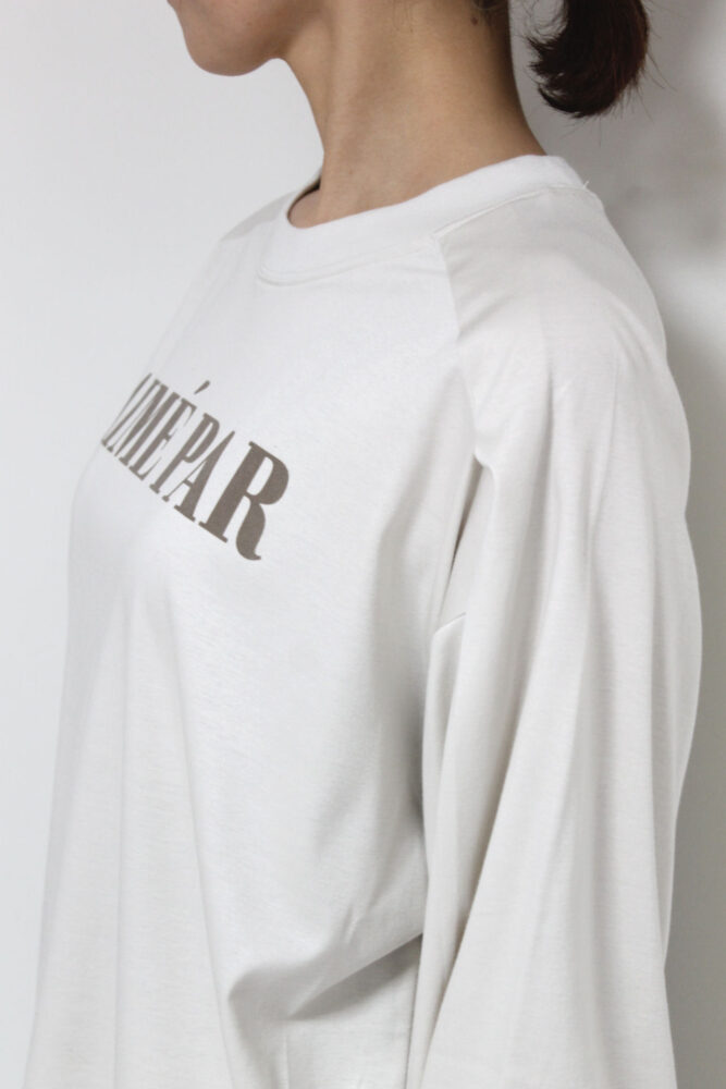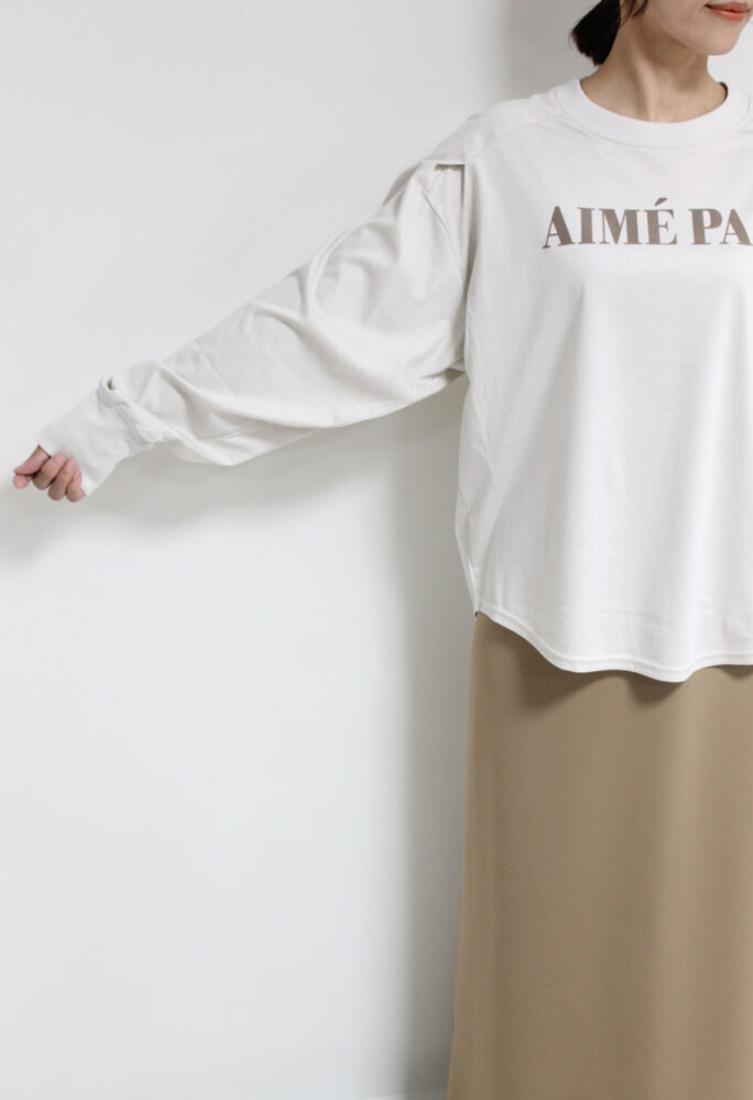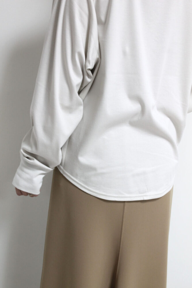 表面感のあるフロッキープリントを施したディニテコリエ(Dignite Collier)ロングTシャツはドロップショルダーでリラックスしたシルエット。一枚着はもちろん、羽織り物のインナーにもおすすめのアイテムです。どんなスタイリングにも合わせやすい、ベーシックカラーでご用意しました♪