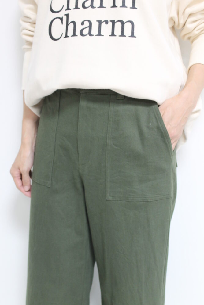 フロントの大きなスクエアポケットがアクセントになるフォンタナ(Fontana)のストレッチベイカーパンツ。伸縮性が高くて動きやすいチノ素材。ちょっとゆったりとしたワイドなリラックスシルエット。あえてフェミニンなアイテムを組み合わせたり、カジュアルに振ったり、いろいろなスタイリングを楽しめるパンツです。
