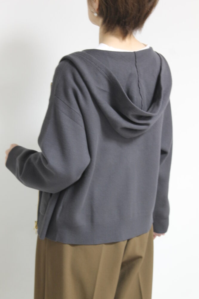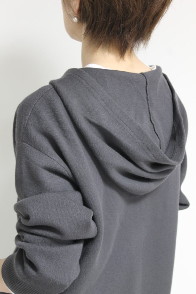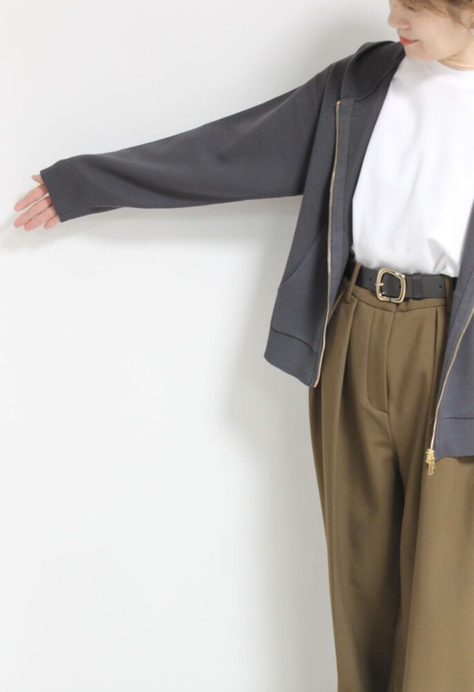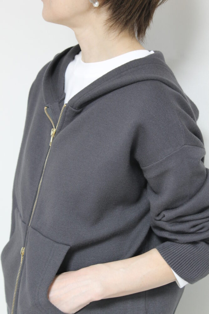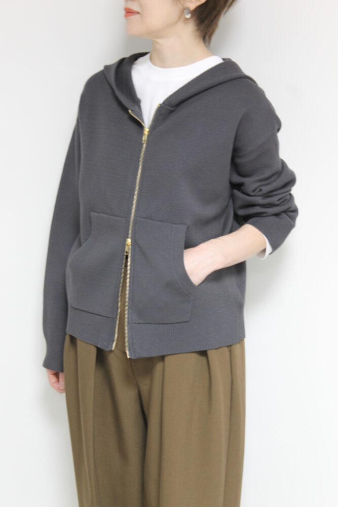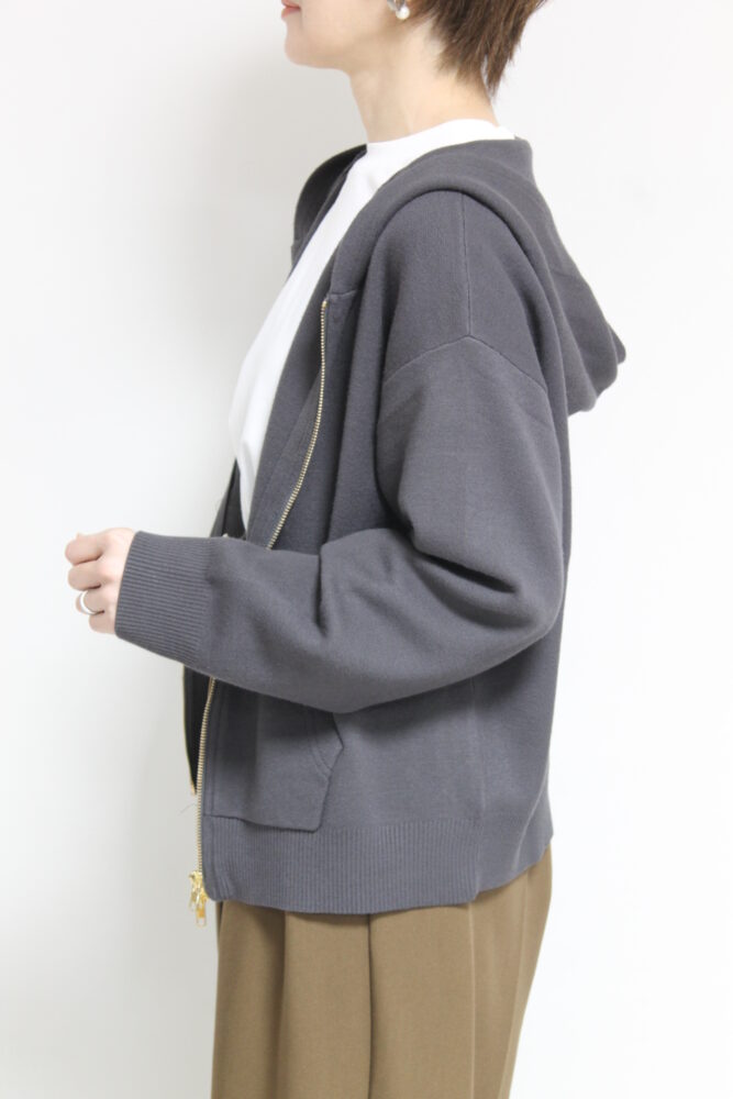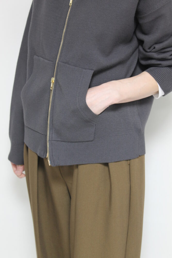 厚手のアウターの前のアウターとしておすすめ。柔らかな膨らみと肉感が心地いいシュガーローズ(SUGAR ROSE)Wジャガードニットパーカー。ダブル組織のため、生地に厚みとハリがあり、しっかりとした風合い。上下のジップの空き具合でスタイルも変更可能です。ポケットがついており機能性も◎。