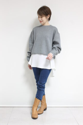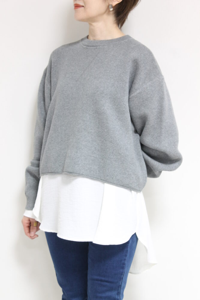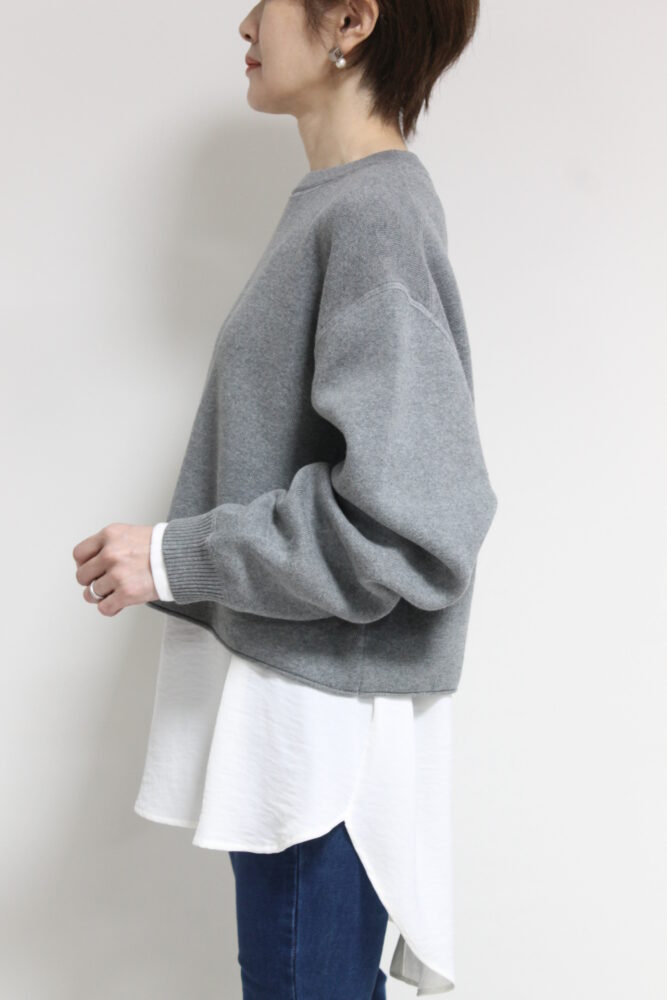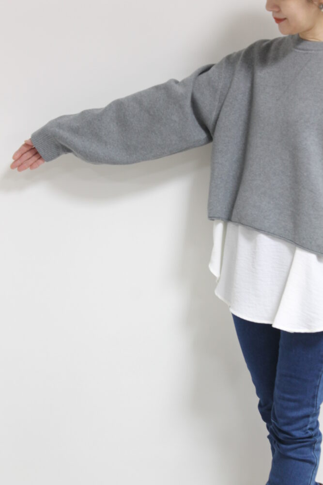 パシオーネ(PASSIONE)ショート丈ニットソー。軽くてふくらみのある糸で編まれており、カットソーとニットの中間くらいの生地感です。画像では「ふんわりニット×とろみブラウス」にしてみました。合わせるアイテム次第でデイリーからお出かけまで幅広く着ていただけます◎