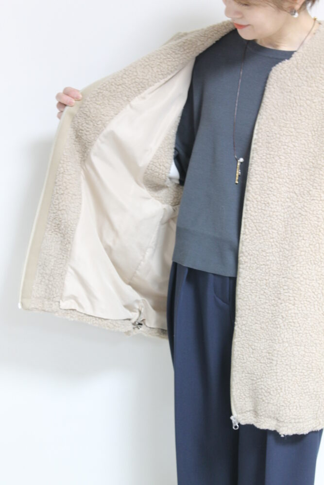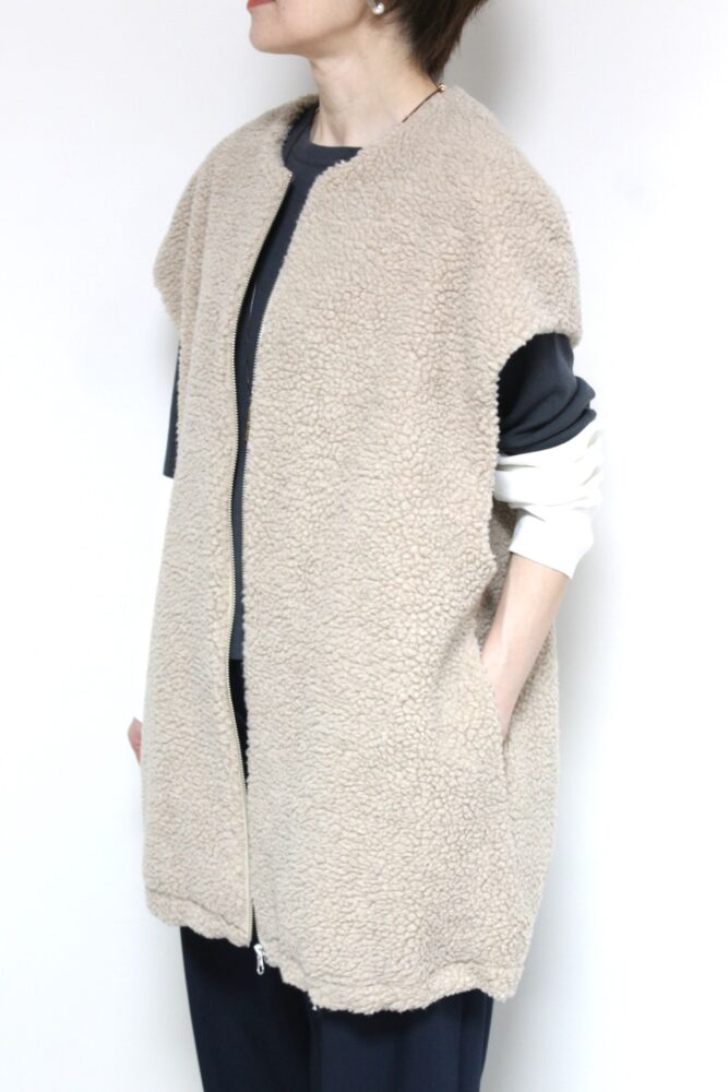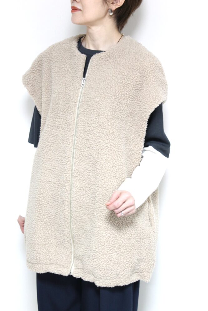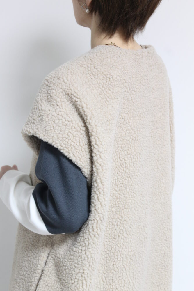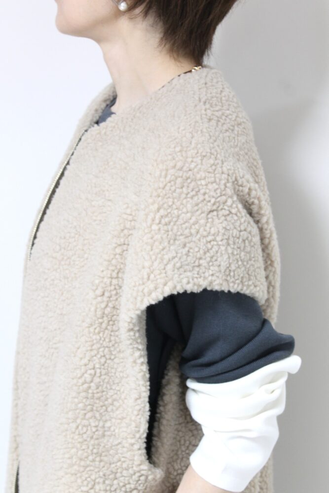 ベスト感覚で着られる・・ふっくらモコモコのパシオーネ(PASSIONE)フレンチスリーブボアジャケットはカジュアルなコーデに1枚羽織ってもトレンド感がUPする万能アイテム。すっきりしたラインのミドル丈でパンツのシルエットやデザインがきれいに見えます。裾にドローコードが付いてラインの調整可能。裏地付いていて脱ぎ着がしやすいです◎
