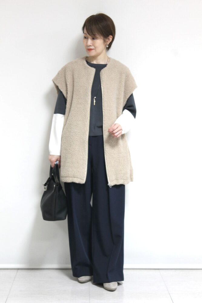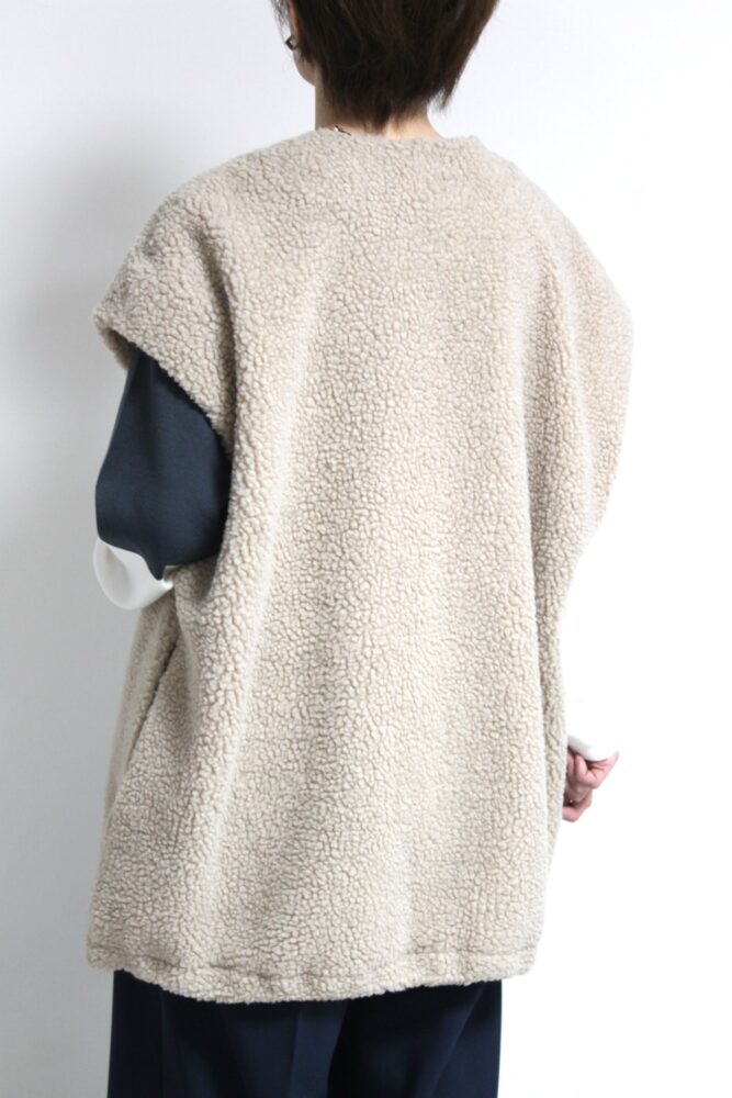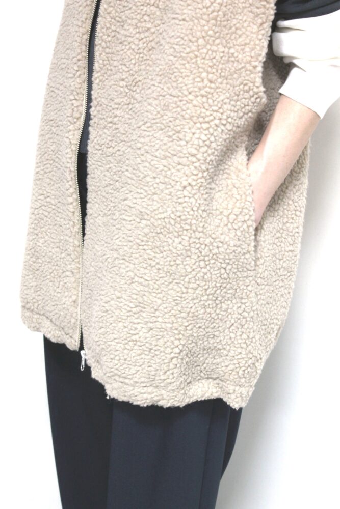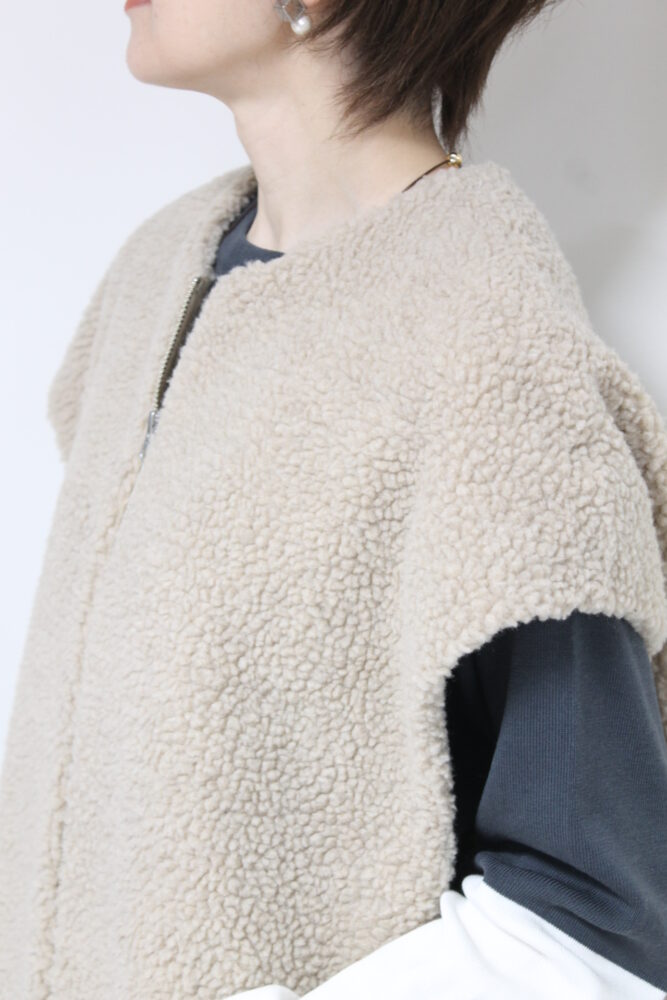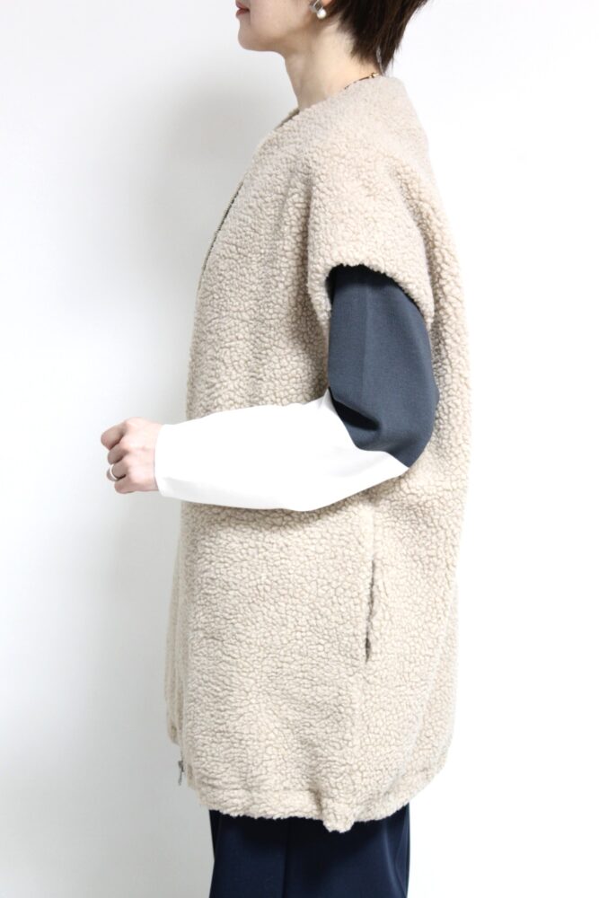 ベスト感覚で着られる・・ふっくらモコモコのパシオーネ(PASSIONE)フレンチスリーブボアジャケットはカジュアルなコーデに1枚羽織ってもトレンド感がUPする万能アイテム。すっきりしたラインのミドル丈でパンツのシルエットやデザインがきれいに見えます。裾にドローコードが付いてラインの調整可能。裏地付いていて脱ぎ着がしやすいです◎