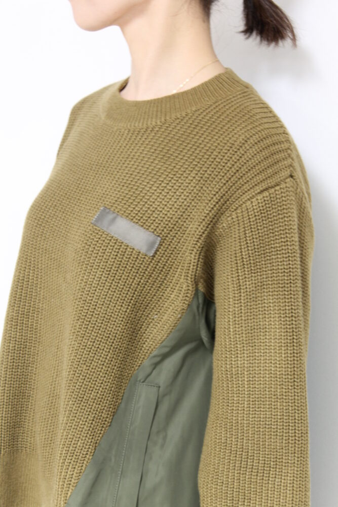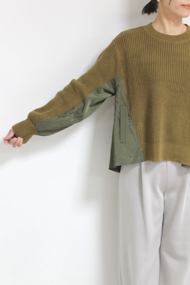 さり気なくミリタリー要素を取り入れた大人女性の為の遊び心あるロージー(ROSIEE)ドッキングニット。前身頃は異なる編地のニット素材、サイドと後身頃は布帛素材。同色でまとめた合わせ易さがいいんです◎