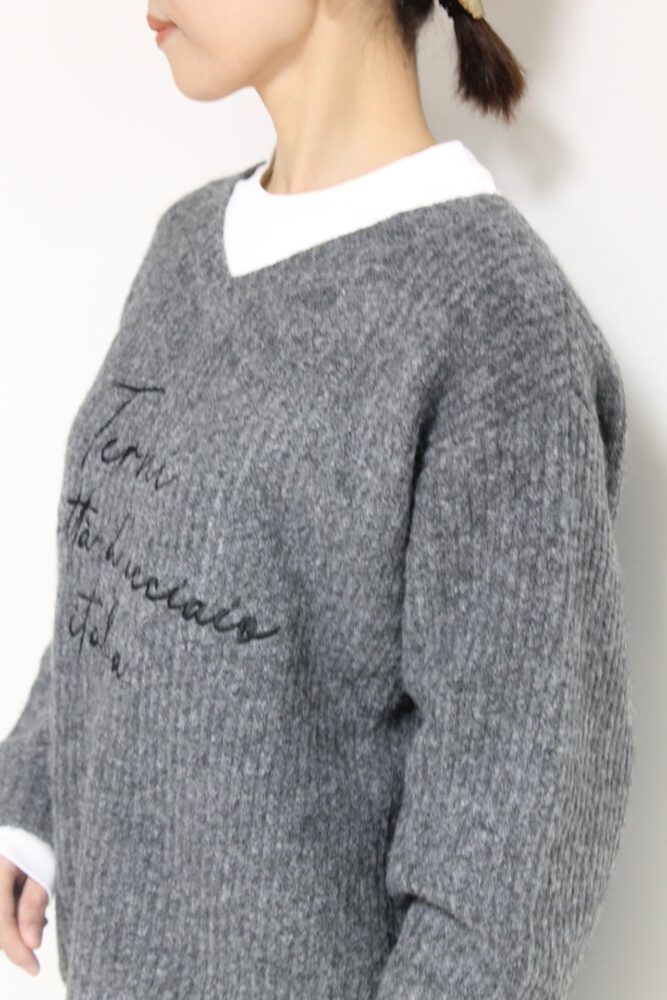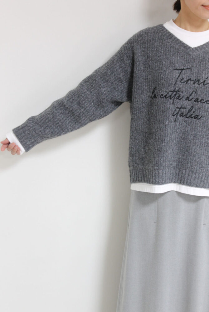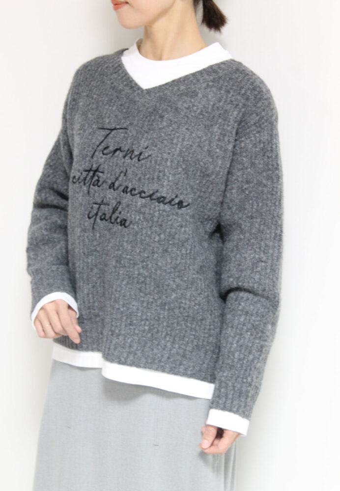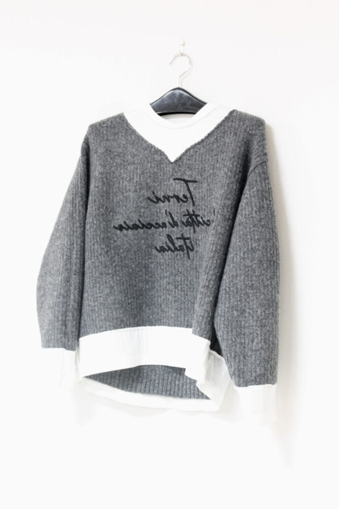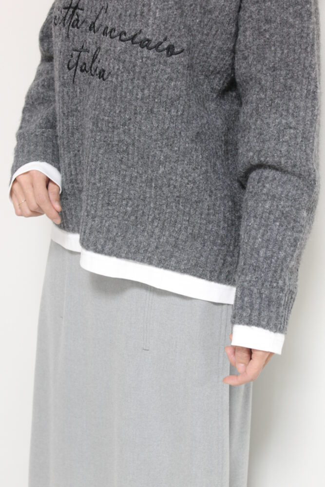 アンカルネ(Un carnet)カットソー重ね着風ロゴ刺繍プルオーバー/チャコールグレー×ブラック×オフ