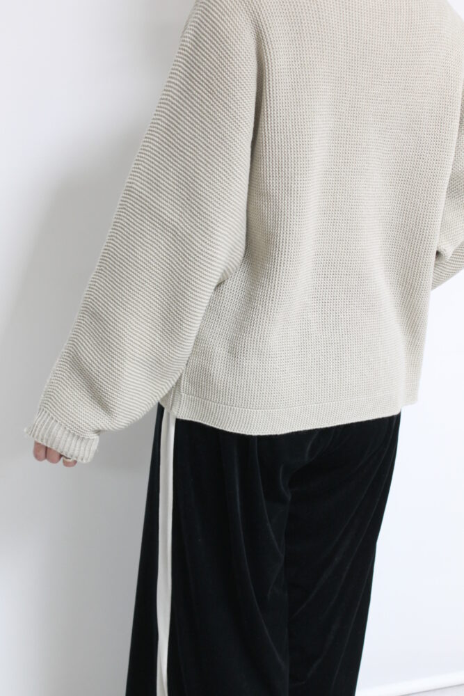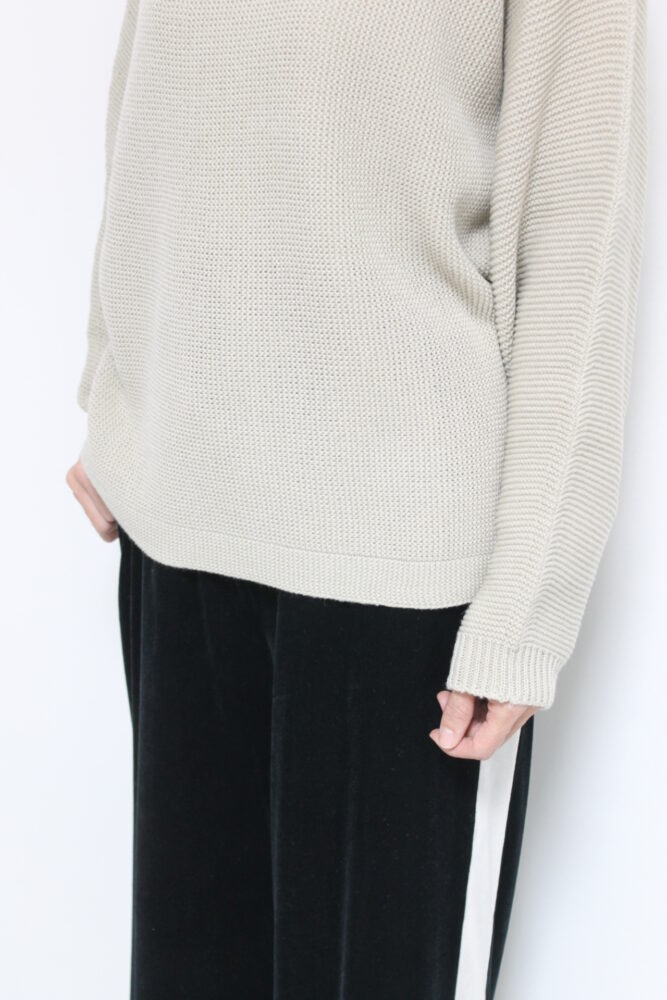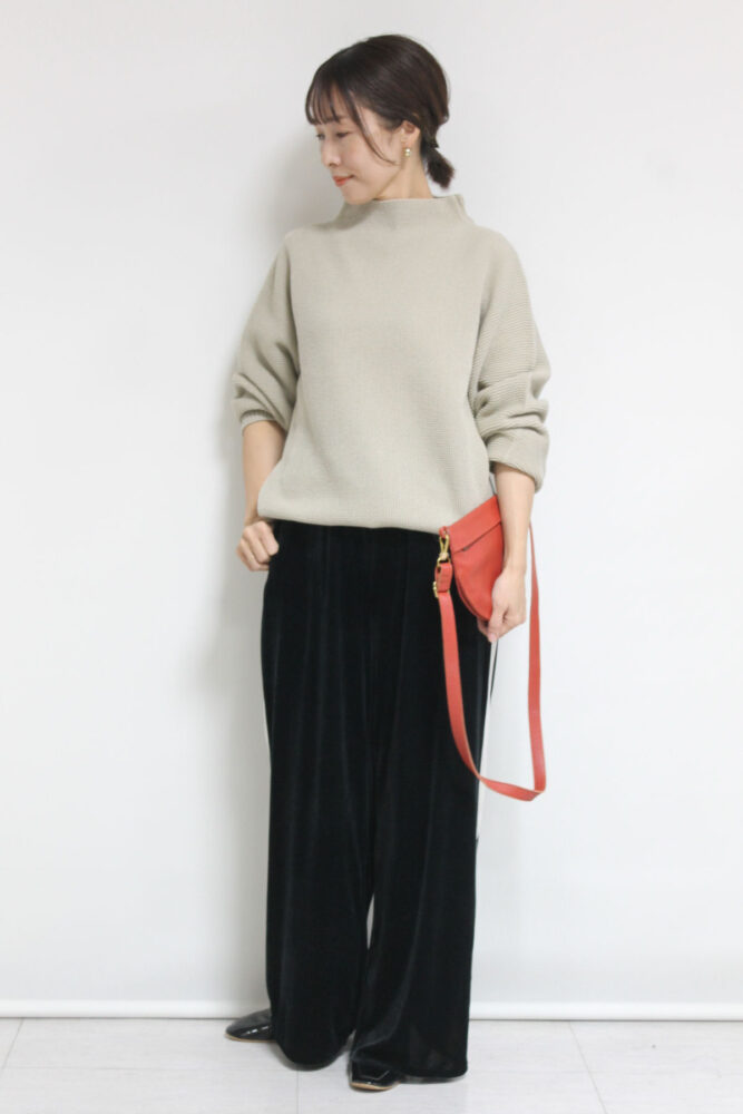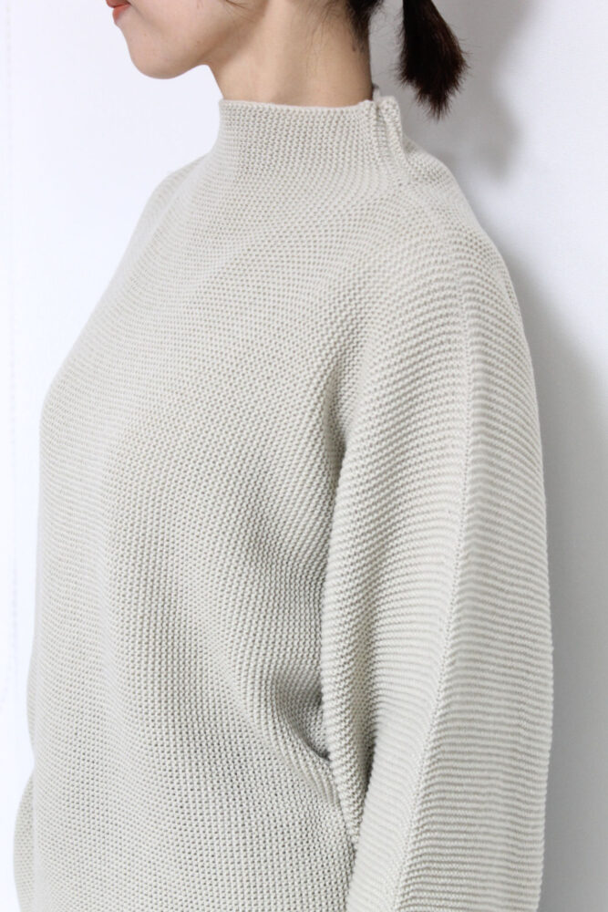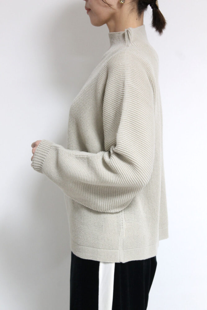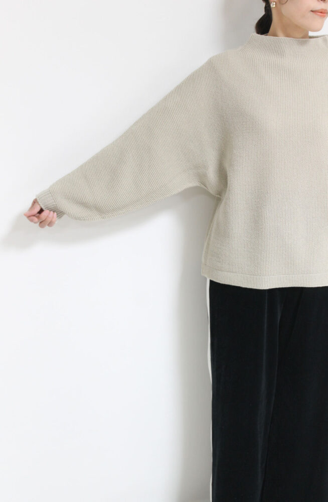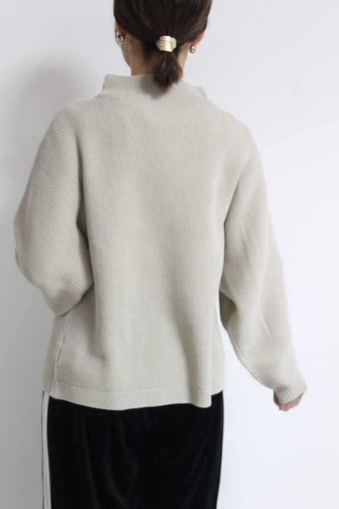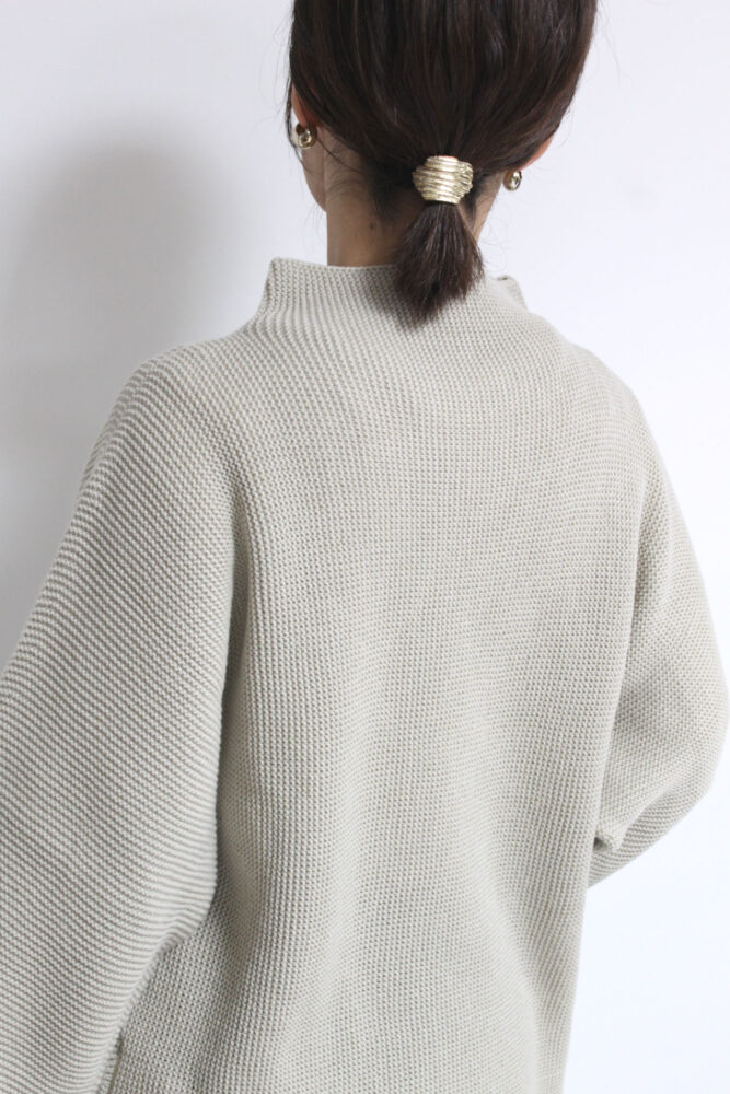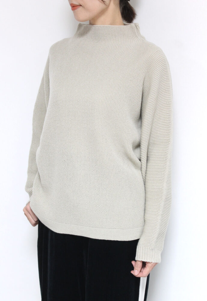 マリードール(MARIED'OR)ウール混ホールガーメントボトルネックP/O。ホールガーメントなので切り替えがなく、ボトルネックですっきりしとしたデザイン。ゆったりとした身幅と日本のウール混糸使用でチクチクしにくく、さらっとしつつ程よい肉感です。