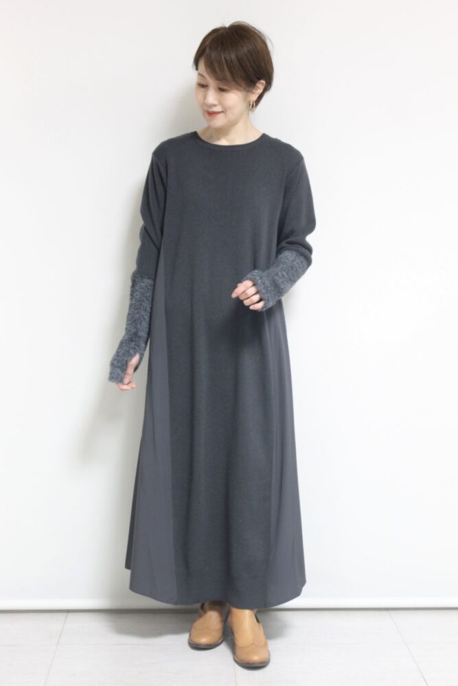 異素材をさりげなく組み合わせたロージー(ROSIEE)の袖シャギー布帛切替ワンピース。切り替えが縦ラインを強調し、自然と細見えを叶えてくれるデザインです。素材は柔らかく、ゆとりのあるサイズ感なのでリラクシーな着心地も魅力。アウターを重ねても映える一着です◎