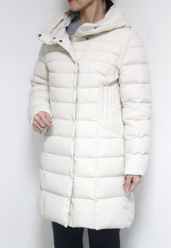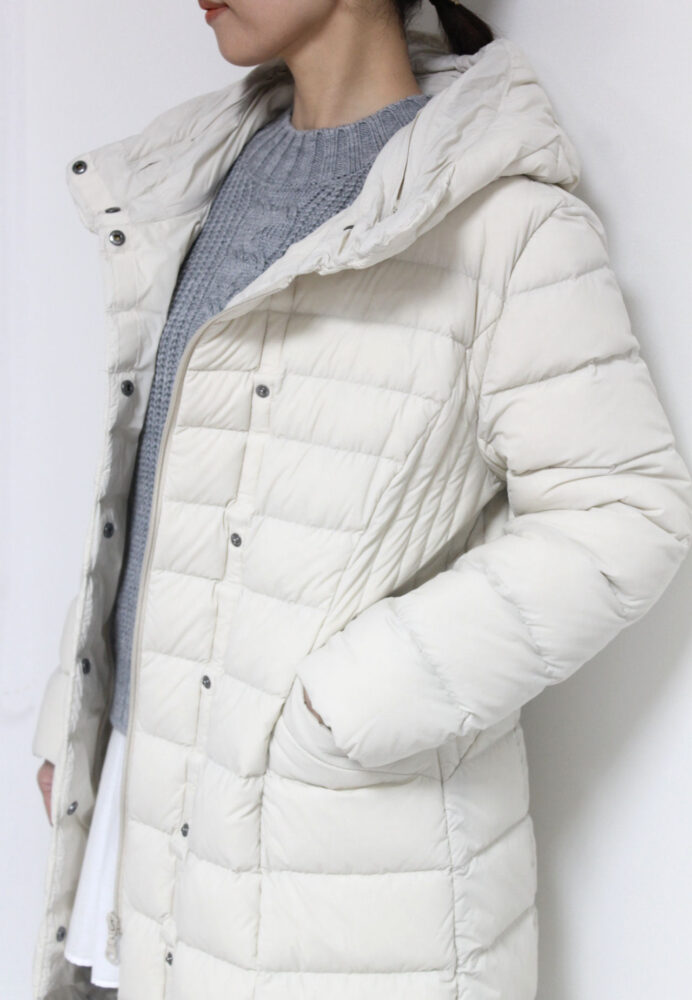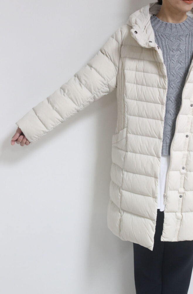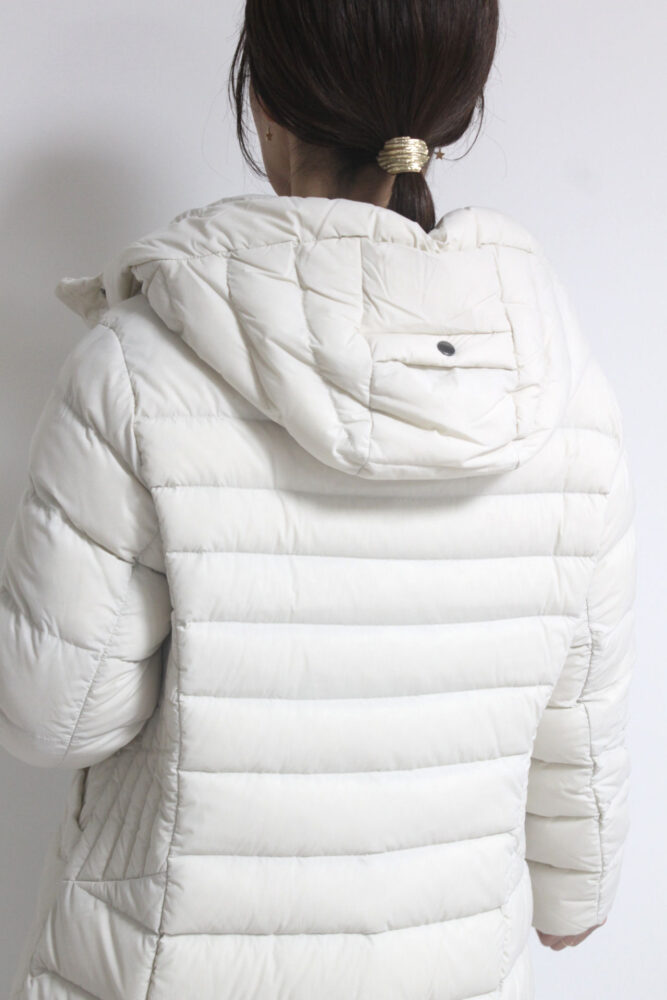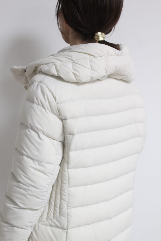とっても軽いおすすめの一着!ヒップが隠れる丈感で暖かく、女性らしいシルエットも兼ね備えた真冬まで大活躍するレスピーギ(RESPIGHI)のロング丈ライトダウンコート。スタイルアップして見えるきれいなシルエットにこだわりました。衿の内側にフードを収納・・お好みで出したり入れたりするタイプです◎