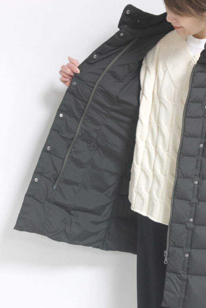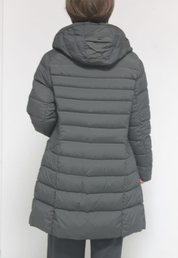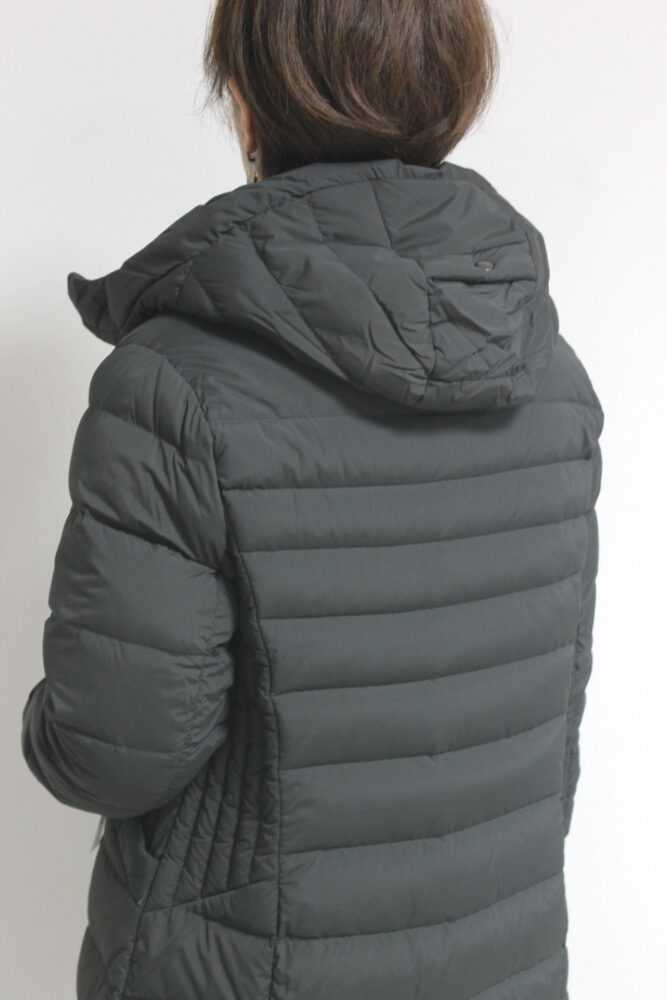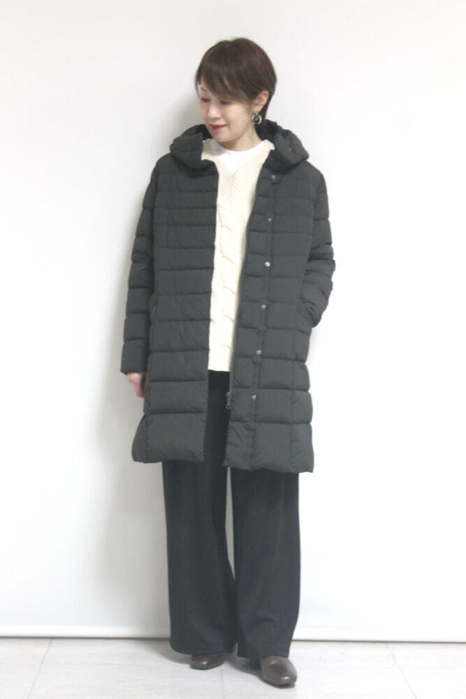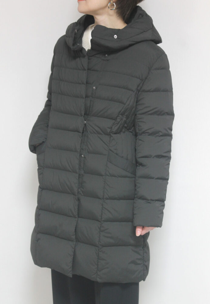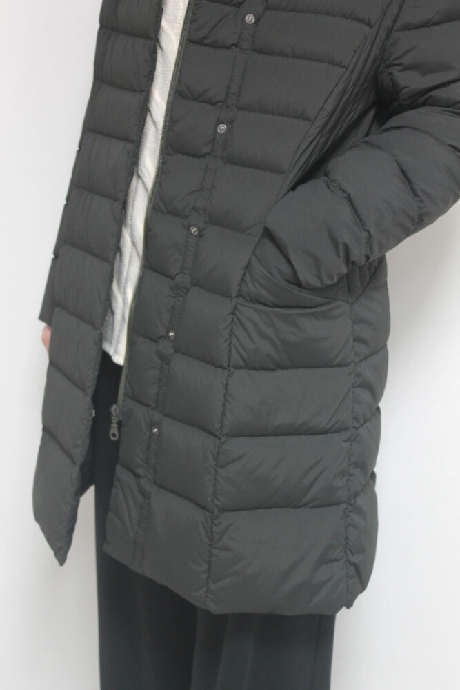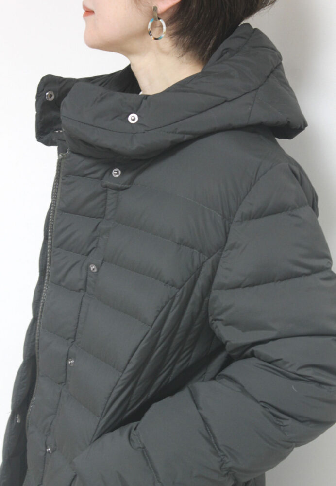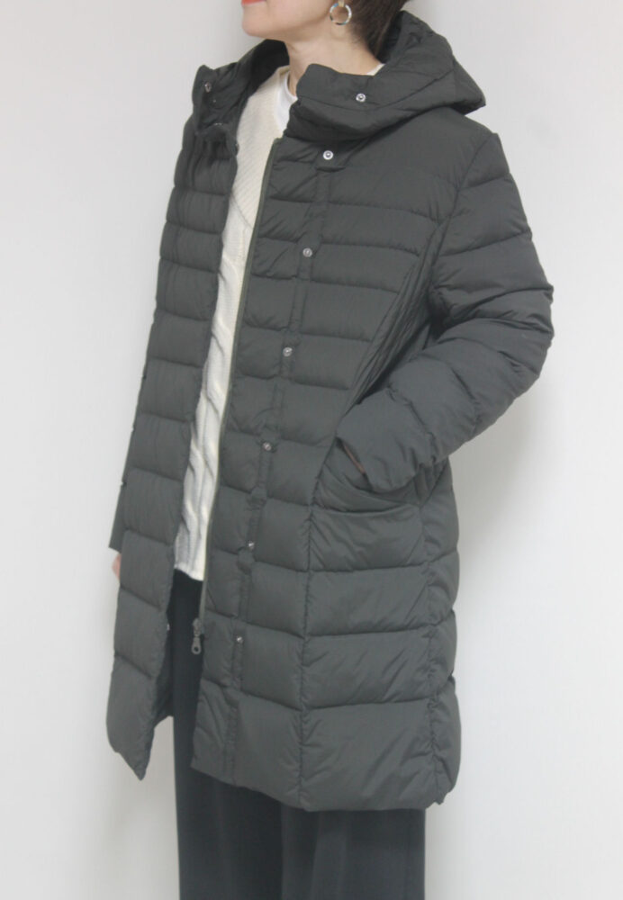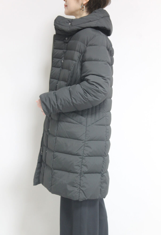 とっても軽いおすすめの一着!ヒップが隠れる丈感で暖かく、女性らしいシルエットも兼ね備えた真冬まで大活躍するレスピーギ(RESPIGHI)のロング丈ライトダウンコート。スタイルアップして見えるきれいなシルエットにこだわりました。衿の内側にフードを収納・・お好みで出したり入れたりするタイプです◎