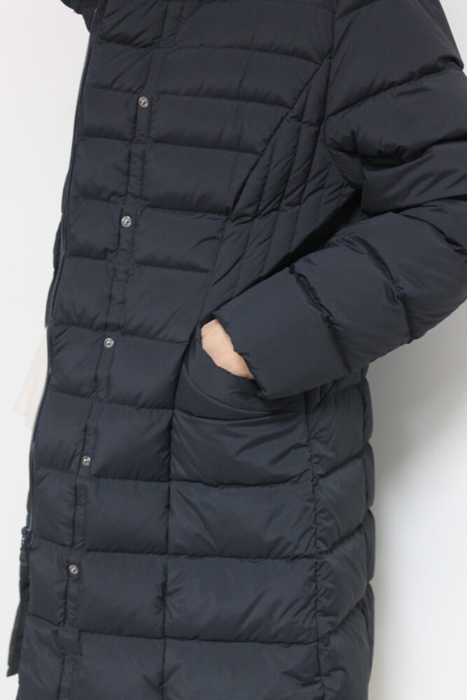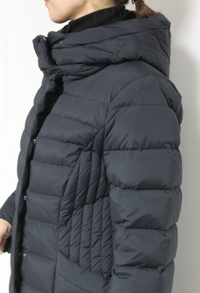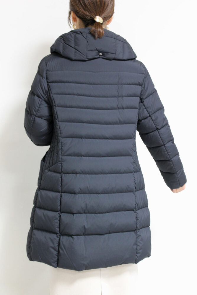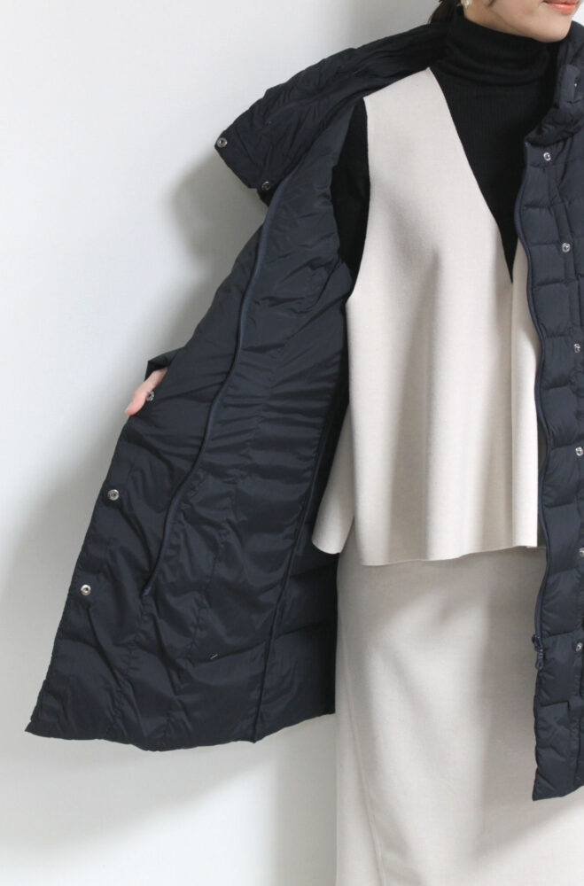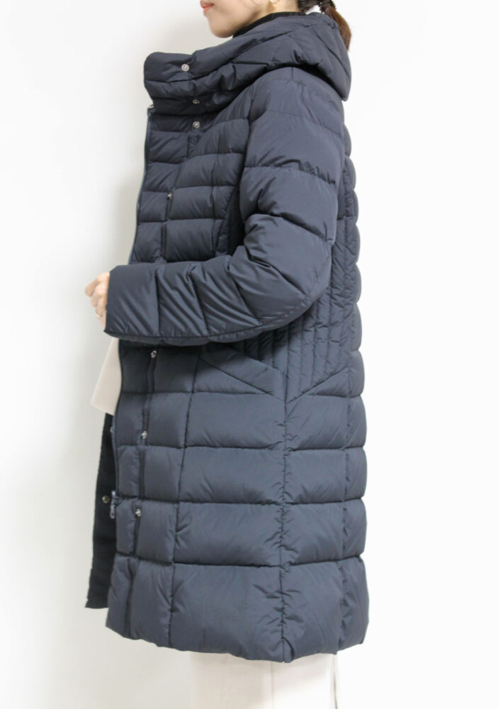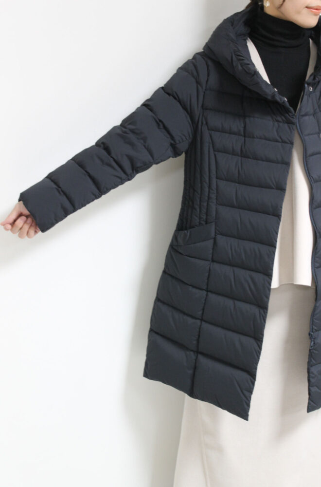 とっても軽いおすすめの一着!ヒップが隠れる丈感で暖かく、女性らしいシルエットも兼ね備えた真冬まで大活躍するレスピーギ(RESPIGHI)のロング丈ライトダウンコート。スタイルアップして見えるきれいなシルエットにこだわりました。衿の内側にフードを収納・・お好みで出したり入れたりするタイプです◎