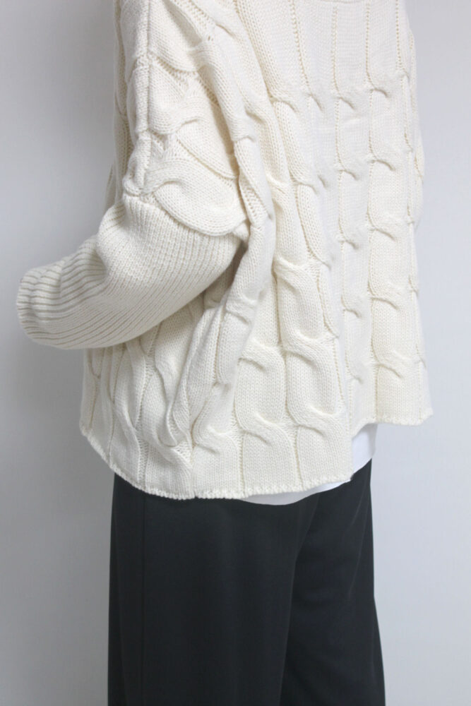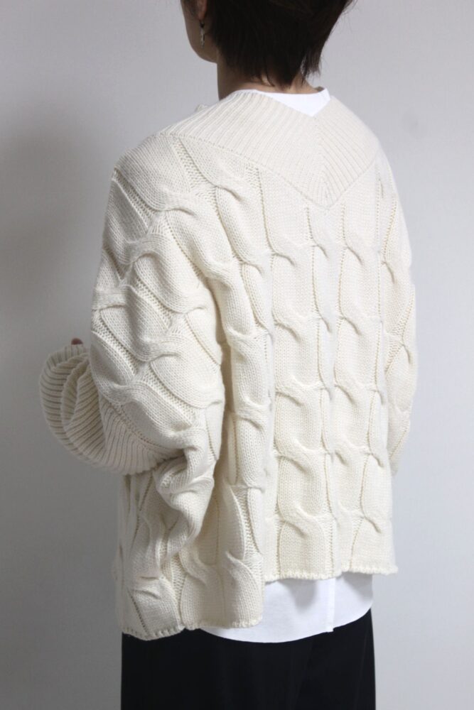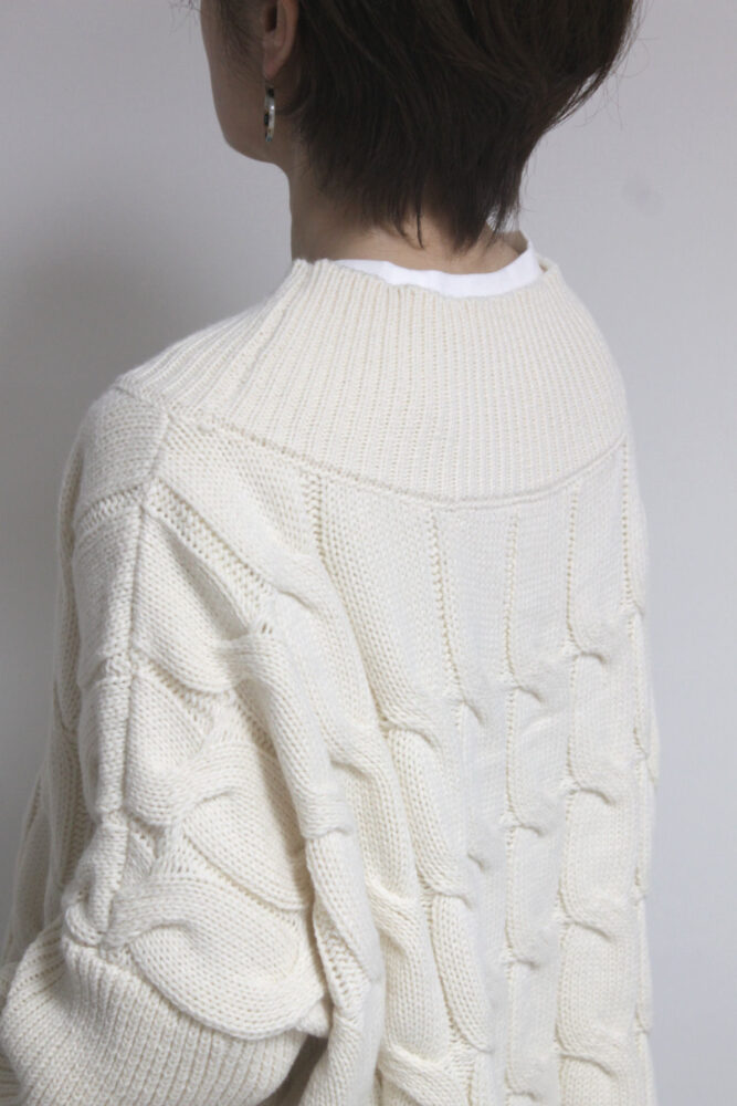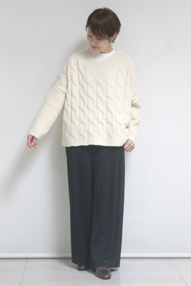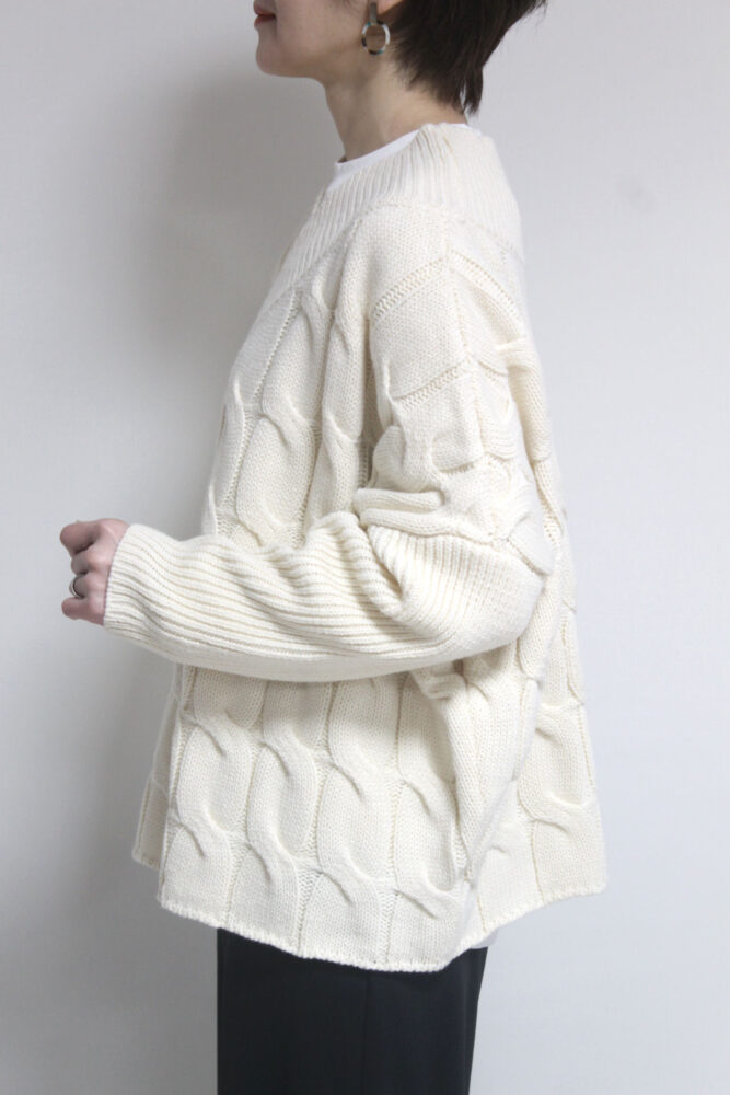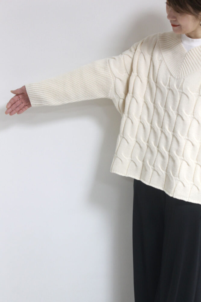 ブランコイブリロ(blanco y brillo)で一番人気のアランケーブル2WAYプルオーバー。ローゲージのざっくり感とV ネック、立体感のある編地がとっても上品です。肉厚で暖かいので真冬もOK。前と後をひっくり返すと衿ぐりの雰囲気も変わります。ワンランク上の着こなしを叶える主役級ニットです◎