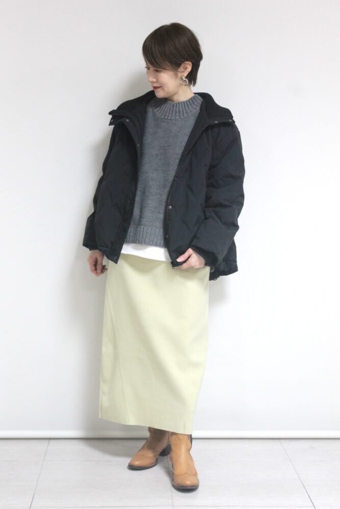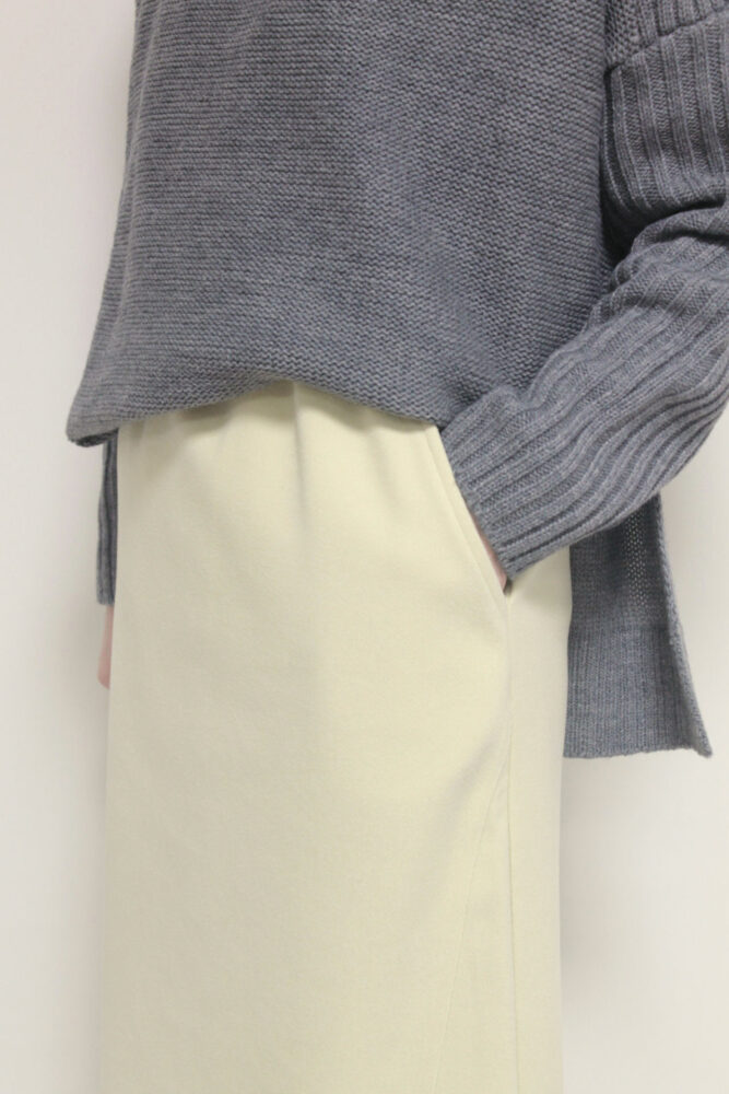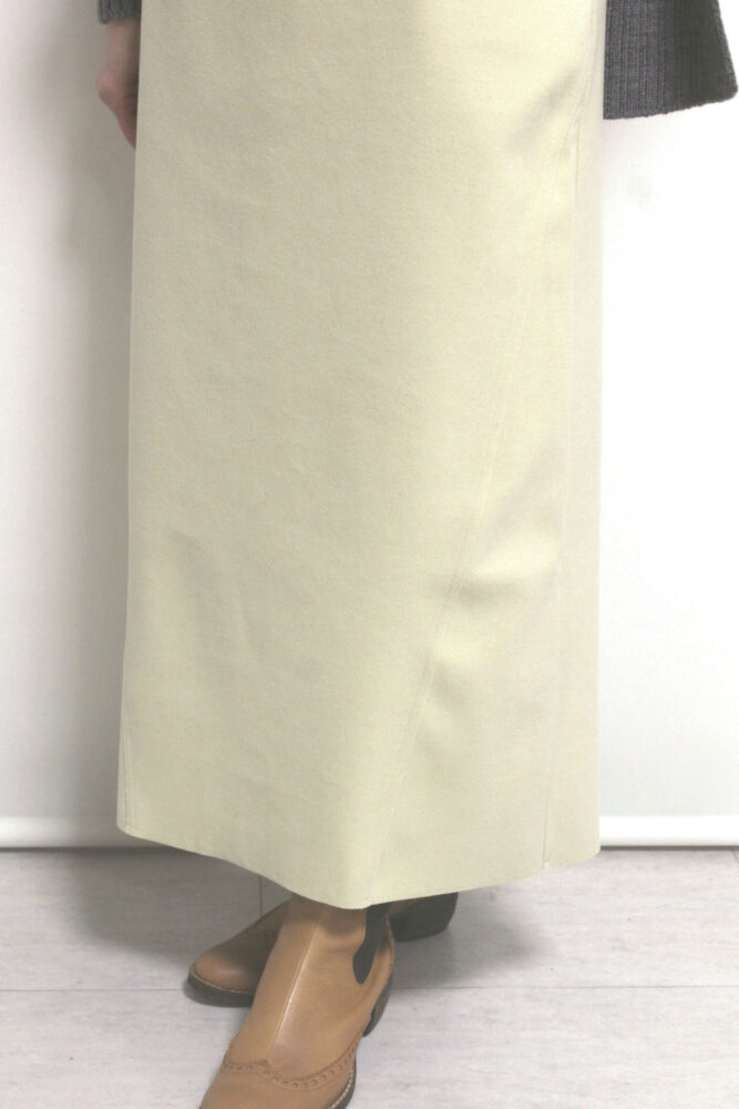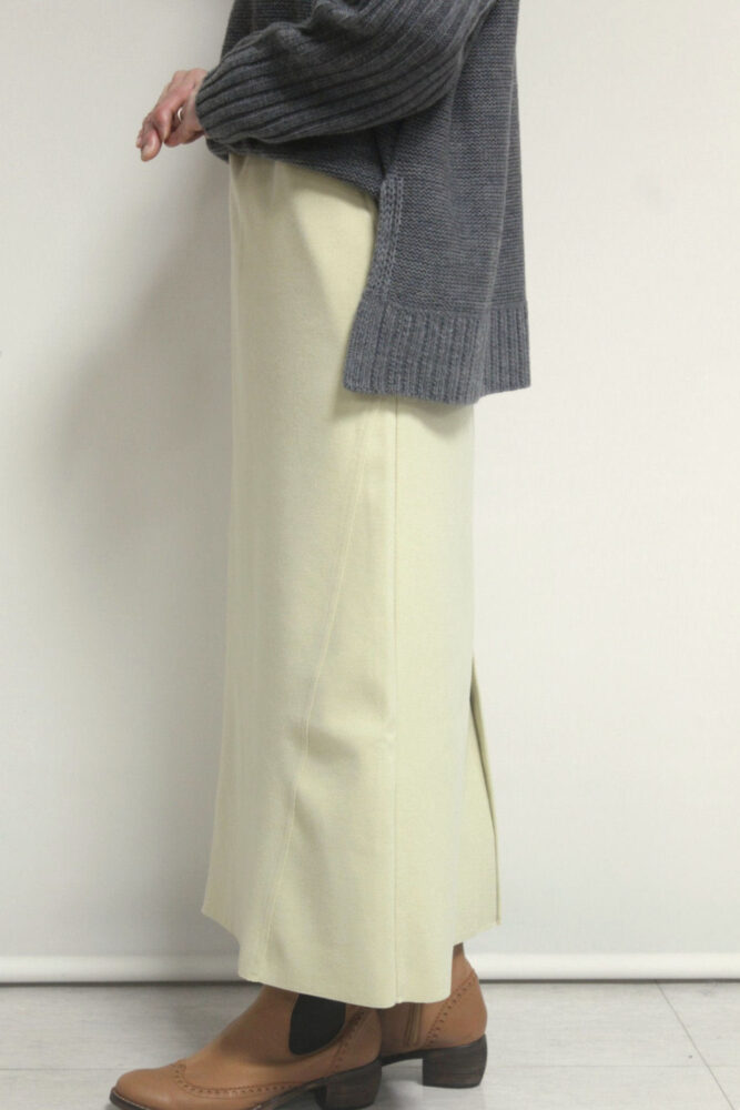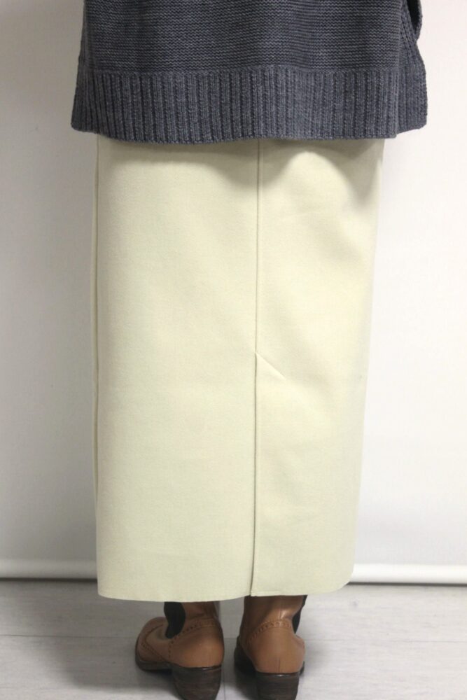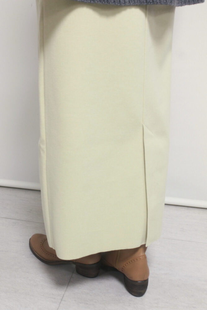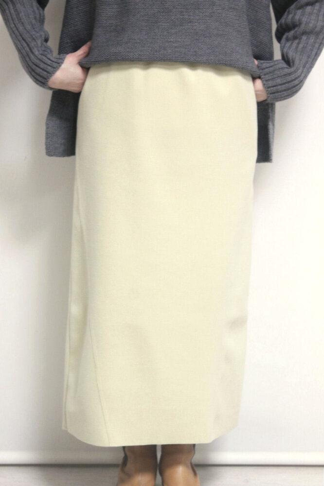 しなやかで品があって・・そして暖かい! ディニテコリエ(Dignite Collier)ウーリージャージスカート。ゆるすぎないシルエットですが厚みがあるので身体のラインを拾わず安心感のある着心地もポイントです。バックにはスリットが入っていて足さばきがしやすいのもうれしい◎